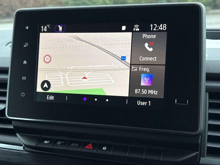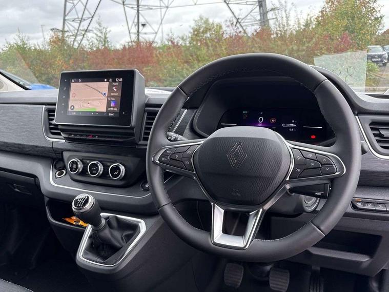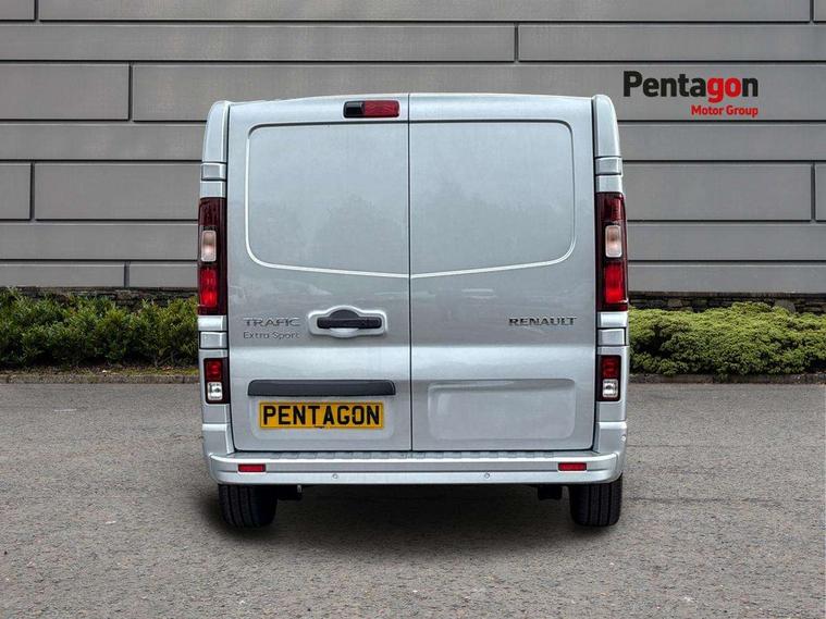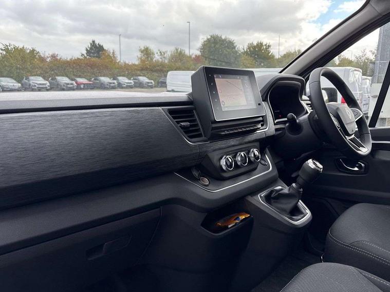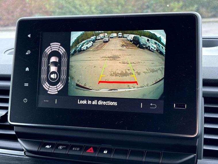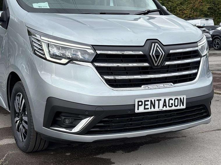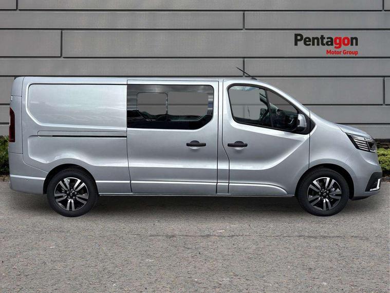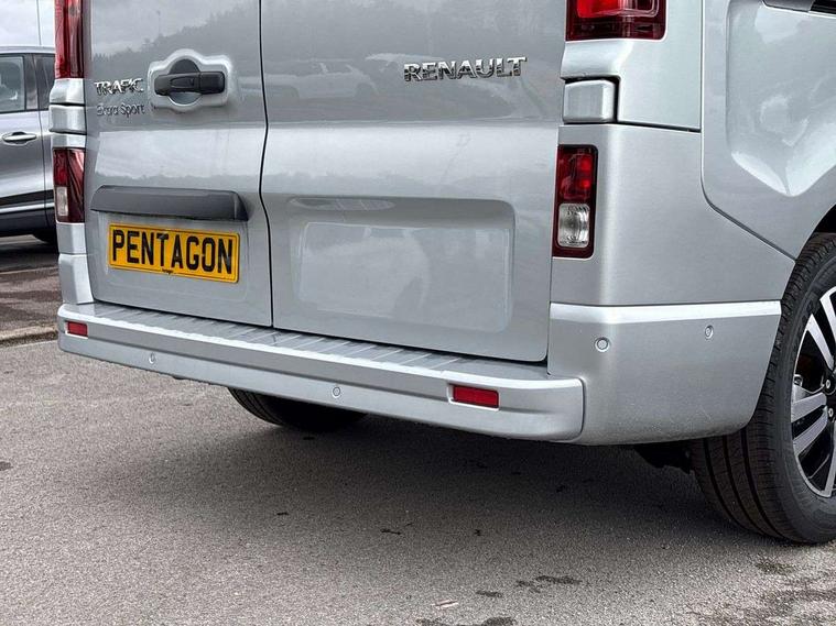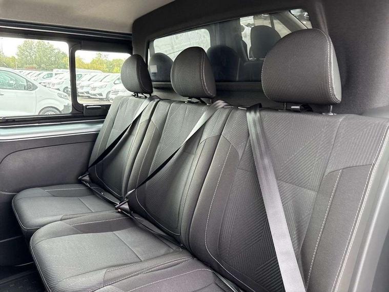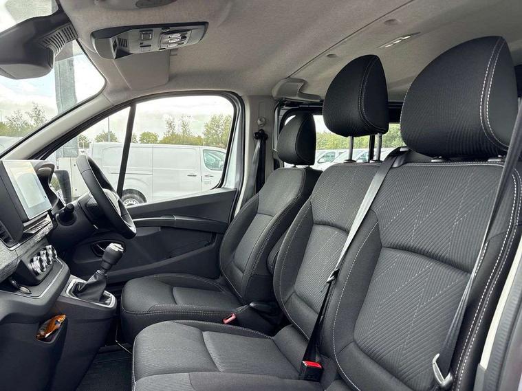 360 degree parking sensors (front, rear and lateral ultra sonic sensors), 7" Colour TFT driver information display, Driver attention alert, Driver drowsiness warning, E-Call - automated emergency call, Easy link navigation with 8" touchscreen DAB radio with bluetooth, USB + aux input, compatible with Apple CarPlay and Android Auto, ECO mode button, Gearshift indicator, Intelligent Speed Assist, Lane departure warning system, PAS, Rear parking camera, Trip computer, Wireless smart phone integration with Android auto & Apple CarPlay, Automatic high beam, Blind spot mirror on passenger sunvisor, Body coloured door mirrors, Body coloured door rail and rear tail light column with chrome grille, Body coloured front bumper, Body coloured side mouldings, Chrome Grille, Electric folding door mirrors, Electric front windows with one touch drivers window, Front fog lights, Full LED headlights with C-shaped DRL, New brand identity, Roof bar fixings, Side loading door - L and R glazed with opening window, Wide view mirror, 12V power socket in front, 16 load anchorage points, 2nd row of 3 passenger seats Individual seats with adjustable headrests, ISOFIX (left & right seat), 2 armrests, Climate control, Closed glovebox, Glazed full bulkhead, Height adjustable drivers seat with armrest and lumbar adjustment, Interior LED cabin lighting, Interior side panels - load area, Interior side panels up to windows, Java cloth upholstery, LED load space lighting, Premium dashboard with horizontal grain and chrome styling, Premium faux leather steering wheel, Look pack - Trafic, Parking pack - Trafic, Visibility pack - Trafic, 3 point height adjustable seatbelts with pretensioners and load limiter, Driver and passenger airbags, Driver and passenger seatbelt reminder, Front lateral and curtain airbags and passenger airbag with deactivation, Alarm - Thatcham T1 volumetric alarm, Alcohol interlock pre-device, Deadlocking, Electronic immobiliser, Hands free key card with push button stop/start function, Keyless entry system, Remote central locking, 20L AdBlue tank, 4 disc brakes, 6 speed gearbox, 80 litre fuel tank, ABS with EBD (Electronic Brake force Distribution), Active emergency braking system, ESC (Electronic Stability Control) with Hill Start Assist and Grip Xtend, 17" Avens diamond cut alloy wheels,