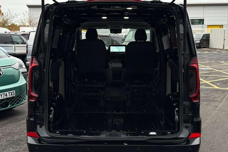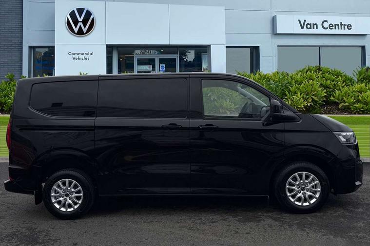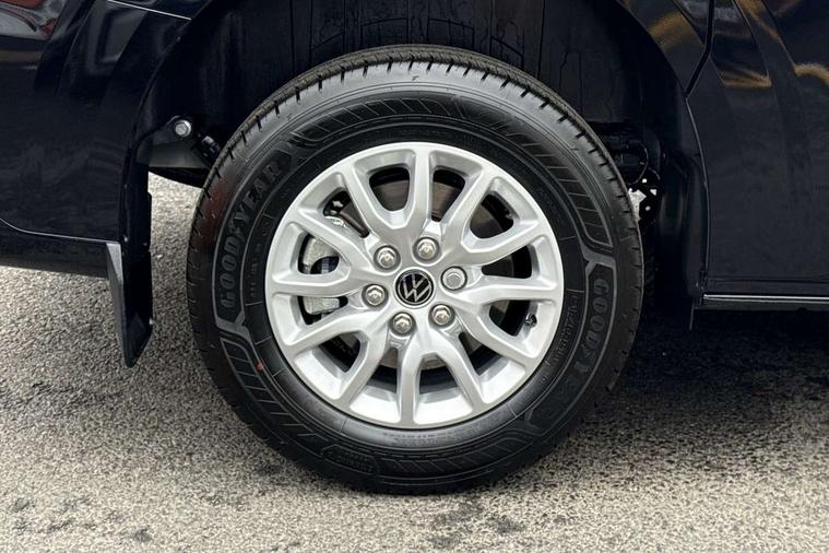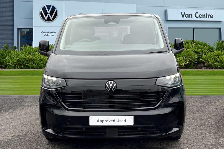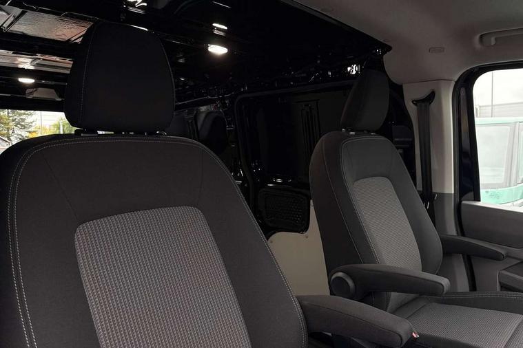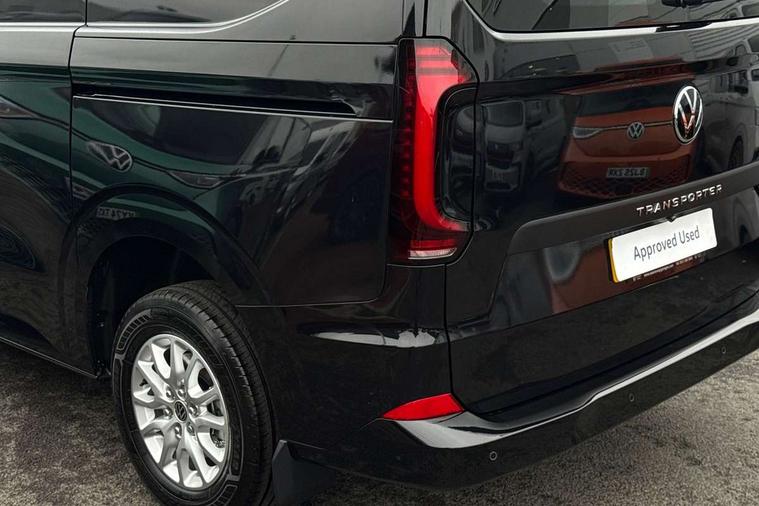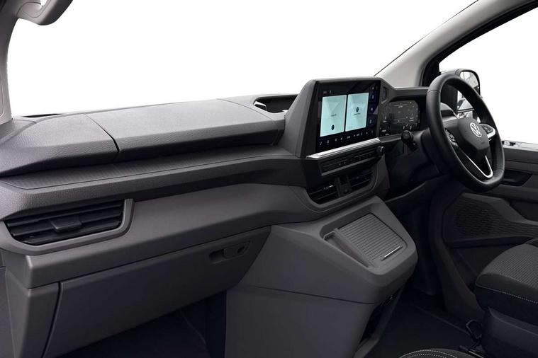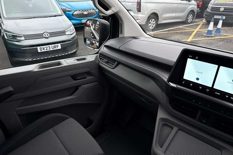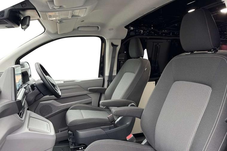 12" digital drivers display, 13" touchscreen infotainment display with wireless app connect and DAB radio, 5G Modem, Adaptive cruise control, Apple CarPlay and Android Auto, Dynamic road sign display, eCall emergency system, Electromechanical speed sensitive power steering, height and longitudinally adjustable steering column, Lane and blind spot assist with exit warning system, Preparation of VW connect and connect plus, Traffic jam assist, Wireless mobile phone charging, Wrong way driver warning, Body colour bumpers, Body coloured door handles, Body coloured door mirrors, Body coloured radiator grille, Electrically heated, adjustable and folding door mirrors, Heat reflecting side window glass, Mud flaps front and rear, Rear Transporter nameplate in black grained decorative trim, Vehicle opening configuration 1x 1st row of seats, 2x all doors, 12V outlet in centre console and 12V outlet on rear right D-pillar, 2x 15-W USB data/charging ports in dashboard and 1x USB-C, 1x USB-A center bottom, 2x LED lights in load compartment, 3x additional super bright LED lights in load compartment, 4 way height and tilt adjustable head restraints, 5 additional USB-C charging ports, Black plastic scuff plate for sliding door in cargo without illumination, Cabin interior lighting, Gear selector lever on steering wheel, Glasses compartment in driver side roof, Grab handle on A-pillar passenger side, Illuminated lockable glovebox, Lashing rings for reinforced floor covering, Narrow centre console with cup holder and compartment for mobile phone, Overhead storage compartment, Rubber floor covering in cab, Striped fabric upholstery, Without passenger seats in load compartment, Driver and front passenger airbag with front passenger airbag deactivation, Dual tone horn, Front and curtain airbags for driver and front passenger, Seat belt pretensioner for driver seat, Anti theft alarm system with interior monitoring in cab, backup horn and towing protection, Electronic immobiliser, Lockable wheel bolts, Preparation for alcohol ignition interlock, 5+ Promise, Alternator - 230A, Electromechanical brake booster, Electronic stability control, ABS, ASR with deactivation button, hill start assist and brake assist system,