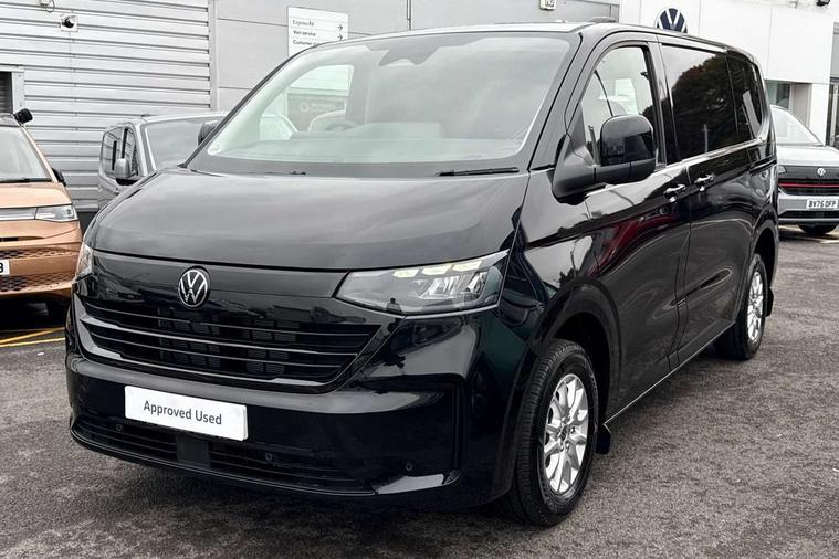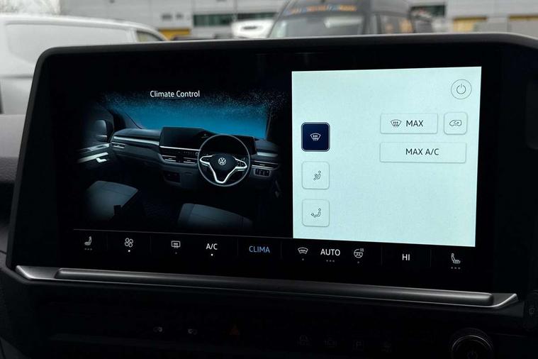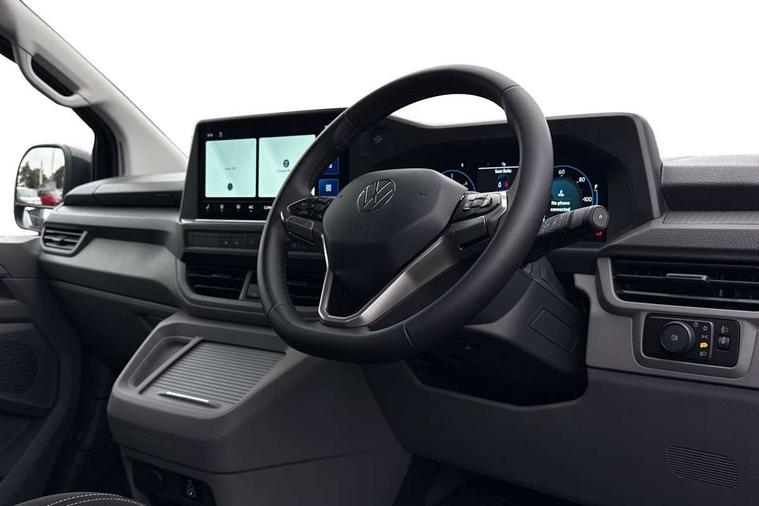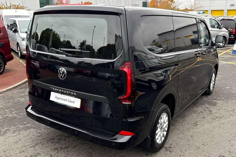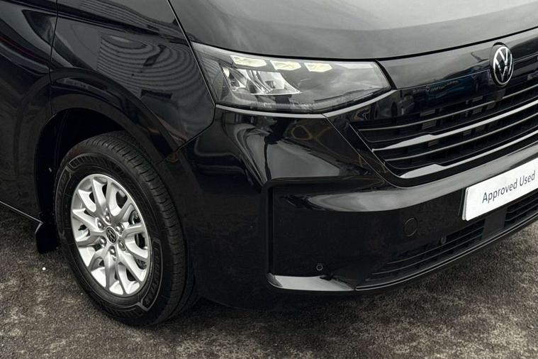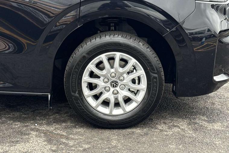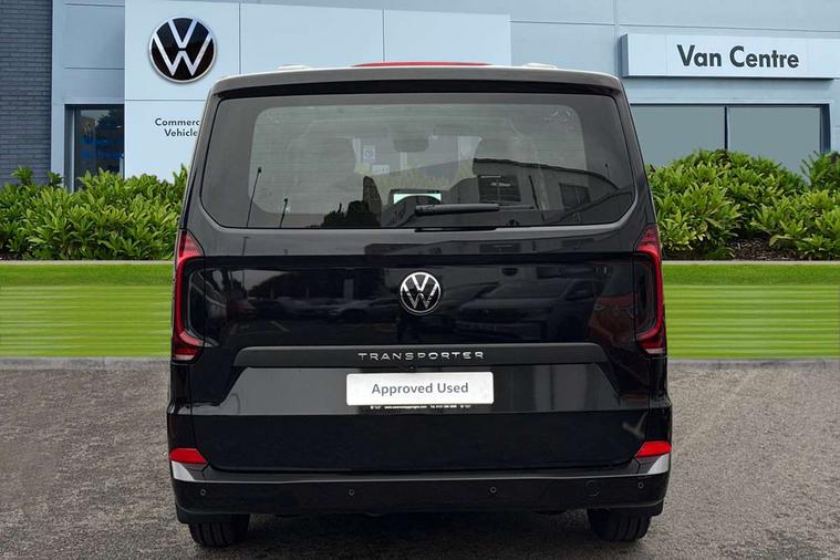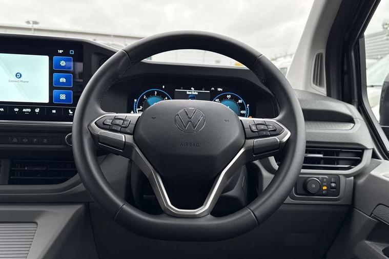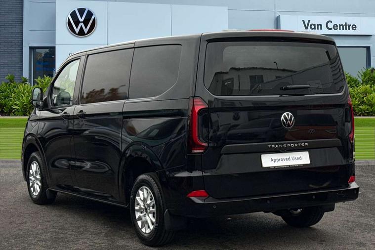 12" digital drivers display, 13" touchscreen infotainment display with wireless app connect and DAB radio, 5G Modem, Adaptive cruise control, Apple CarPlay and Android Auto, Dynamic road sign display, eCall emergency system, Electromechanical speed sensitive power steering, height and longitudinally adjustable steering column, Lane and blind spot assist with exit warning system, Preparation of VW connect and connect plus, Traffic jam assist, Wireless mobile phone charging, Wrong way driver warning, Body colour bumpers, Body coloured door handles, Body coloured door mirrors, Body coloured radiator grille, Electrically heated, adjustable and folding door mirrors, Heat reflecting side window glass, Mud flaps front and rear, Rear Transporter nameplate in black grained decorative trim, Vehicle opening configuration 1x 1st row of seats, 2x all doors, 12V outlet in centre console and 12V outlet on rear right D-pillar, 2x 15-W USB data/charging ports in dashboard and 1x USB-C, 1x USB-A center bottom, 2x LED lights in load compartment, 3x additional super bright LED lights in load compartment, 4 way height and tilt adjustable head restraints, 5 additional USB-C charging ports, Black plastic scuff plate for sliding door in cargo without illumination, Cabin interior lighting, Gear selector lever on steering wheel, Glasses compartment in driver side roof, Grab handle on A-pillar passenger side, Illuminated lockable glovebox, Lashing rings for reinforced floor covering, Narrow centre console with cup holder and compartment for mobile phone, Overhead storage compartment, Rubber floor covering in cab, Striped fabric upholstery, Without passenger seats in load compartment, Driver and front passenger airbag with front passenger airbag deactivation, Dual tone horn, Front and curtain airbags for driver and front passenger, Seat belt pretensioner for driver seat, Anti theft alarm system with interior monitoring in cab, backup horn and towing protection, Electronic immobiliser, Lockable wheel bolts, Preparation for alcohol ignition interlock, 5+ Promise, Alternator - 230A, Electromechanical brake booster, Electronic stability control, ABS, ASR with deactivation button, hill start assist and brake assist system,