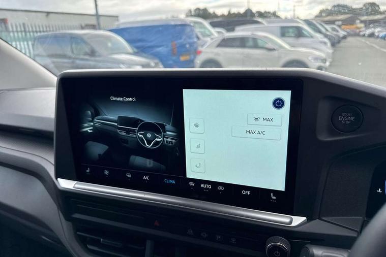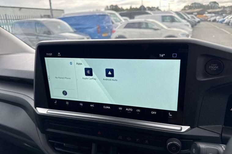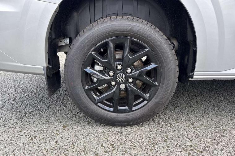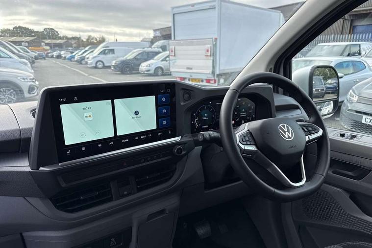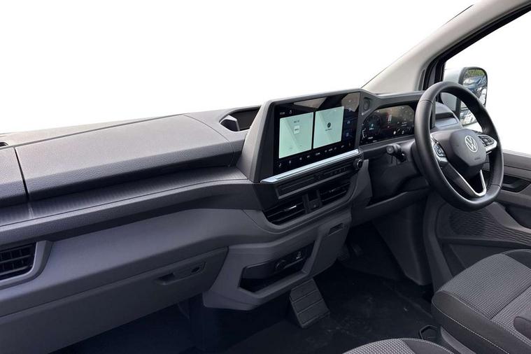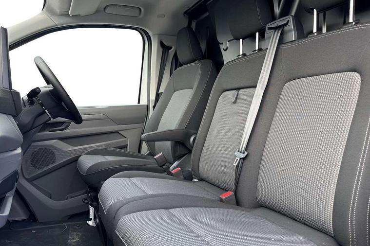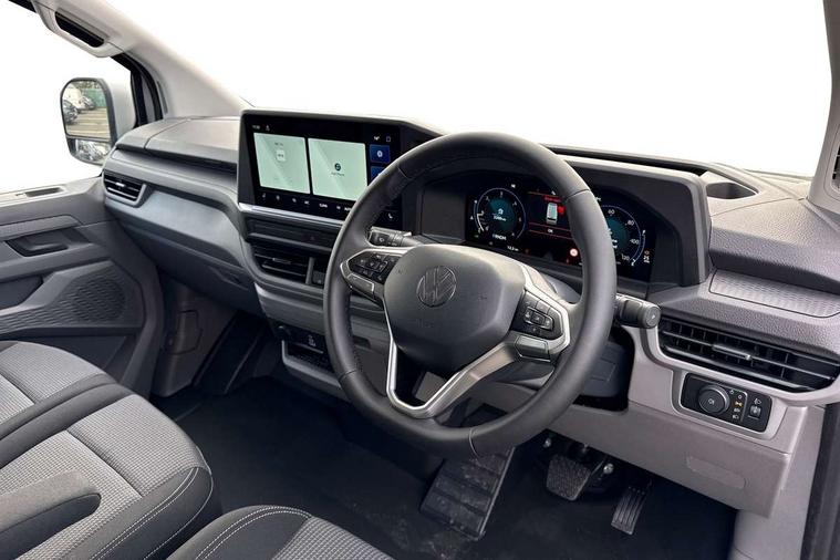 12" digital drivers display, 13" touchscreen infotainment display with wireless app connect and DAB radio, 5G Modem, Adaptive cruise control, Apple CarPlay and Android Auto, Dynamic road sign display, eCall emergency system, Electromechanical speed sensitive power steering, height and longitudinally adjustable steering column, Lane and blind spot assist with exit warning system, Preparation of VW connect and connect plus, Traffic jam assist, Wireless mobile phone charging, Wrong way driver warning, Body colour bumpers, Body coloured door handles, Body coloured door mirrors, Body coloured radiator grille, Electrically heated, adjustable and folding door mirrors, Heat reflecting side window glass, Mud flaps front and rear, Rear Transporter nameplate in black grained decorative trim, Vehicle opening configuration 1x 1st row of seats, 2x all doors, 12V outlet in centre console and 12V outlet on rear right D-pillar, 2x 15-W USB data/charging ports in dashboard and 1x USB-C, 1x USB-A center bottom, 2x LED lights in load compartment, 3x additional super bright LED lights in load compartment, 4 way height and tilt adjustable head restraints, 5 additional USB-C charging ports, Black plastic scuff plate for sliding door in cargo without illumination, Cabin interior lighting, Gear selector lever on steering wheel, Glasses compartment in driver side roof, Grab handle on A-pillar passenger side, Illuminated lockable glovebox, Lashing rings for reinforced floor covering, Narrow centre console with cup holder and compartment for mobile phone, Overhead storage compartment, Rubber floor covering in cab, Striped fabric upholstery, Without passenger seats in load compartment, Driver and front passenger airbag with front passenger airbag deactivation, Dual tone horn, Front and curtain airbags for driver and front passenger, Seat belt pretensioner for driver seat, Anti theft alarm system with interior monitoring in cab, backup horn and towing protection, Electronic immobiliser, Lockable wheel bolts, Preparation for alcohol ignition interlock, 5+ Promise, Alternator - 230A, Electromechanical brake booster, Electronic stability control, ABS, ASR with deactivation button, hill start assist and brake assist system,