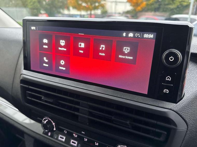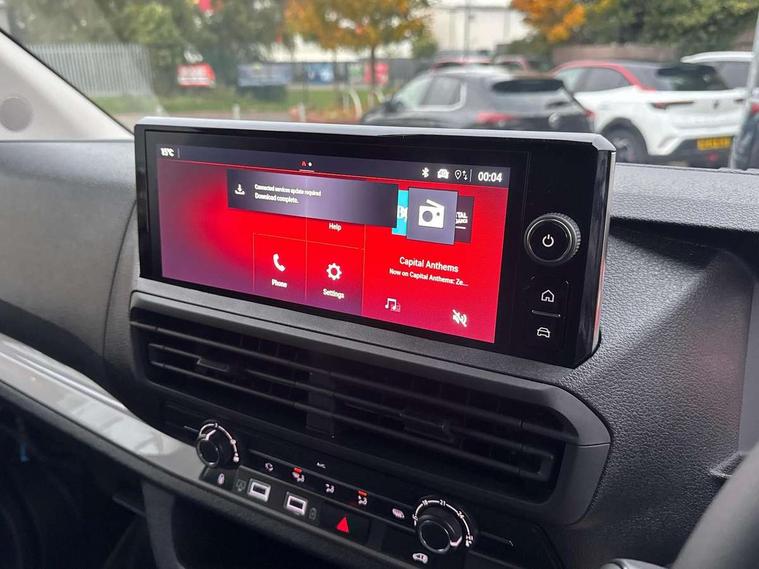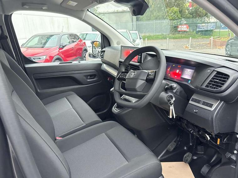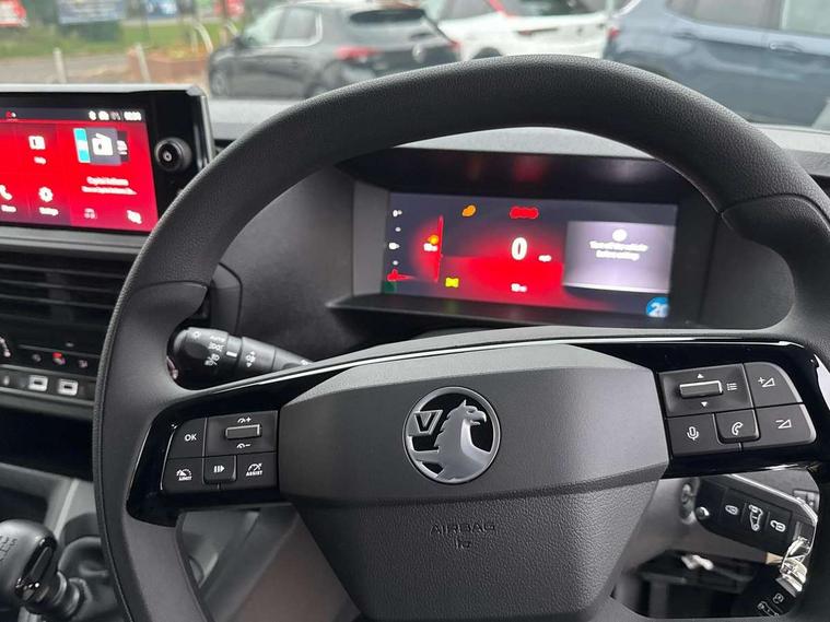 10" digital instrumental cluster, Central fascia display with digital clock, outside air temperature and audio information, Connectivity via BTA with RCA, Driver Attention Alert, level - 3, e-Call and b-Call, Electronic power steering (EPS), Energy absorbing steering column, Forward collision alert, Intelligent Speed Assist, Lane keeping assist, Mobile phone portal - Bluetooth, Vehicle microphone, Phone book access, Smartphone interface with Apple carplay/Android Auto, Multi-function trip computer, Rear parking distance sensor, TPMS (Tyre pressure monitoring system), Vauxhall connect, Audio controls mounted on steering wheel, Flexible short antenna (200mm), Multimedia pro audio system includes Radio AM/FM/DAB, 10" touchscreen with mirror screen(WI-FI), 4G connectivity, Voice control and USB connection, Two speakers and two tweeters, Automatic headlamps on/off, Black door handles, Black front and rear bumpers, Black side protection mouldings, Black sliding door rail cover, Electrically adjustable + heated door mirrors, Familial vizor, Front electric windows with one touch facility, Halogen headlamp with integrated daytime running lights, High beam assist, Laminated acoustic windscreen, Lockable fuel filler cap, Offside and nearside sliding side access doors, Rain sensitive windscreen wipers, Twin solid rear doors, 12V socket in lower glove box (1 only in cabin), Air recirculation facility, Chilled glovebox facility, Curitiba cloth upholstery, Driver's seat armrest, Ergonomic 6-way adjustable driver's seat with reach, rake, height and lumbar adjustment, Fixed floor mounted load restraint lashing eyes x8, Interior roof trim, Manual air conditioning, Overhead console with 1 ceiling lamp (dome type and 3 lamps), Reach and rake adjustable steering wheel, TPO plastic flooring, USB socket in cabin (dashboard), Automatic fuel cut-off and door unlocking in event of accident, Driver and front passenger airbags, Height adjustable lap and diagonal inertia reel front seatbelts, Passenger airbag deactivation manually, Dashboard mounted central locking push button and auto locking above 7mph, Immobiliser, Remote control central deadlocking, Selective door locking, Two keys with integral remote, 22.5 litres AdBlue tank, 70 litre fuel tank, ABS, Advanced emergency braking system (AEBS), EBA, Electronic brake force distribution (EBFD), ESC, ESP, Floor mounted handbrake lever, Hill start assist, Manual parking brake, Traction control, Mistral black dashboard trim with liquid paladium decor strip in mid-section, Michelin Agilis 2 tyres - 215/65 R16C,