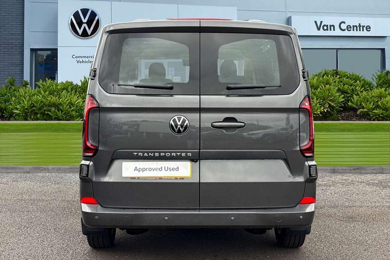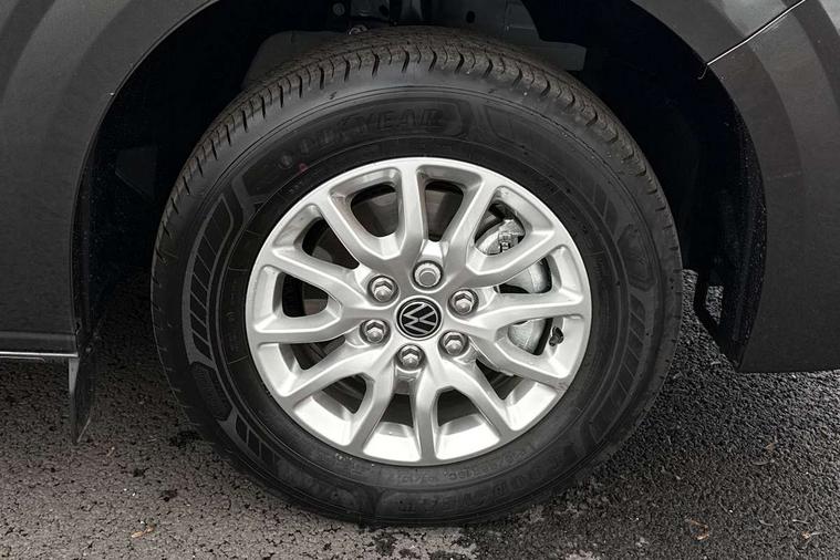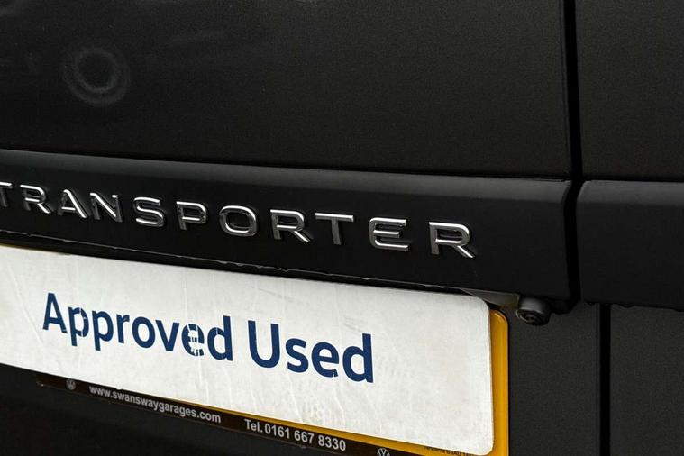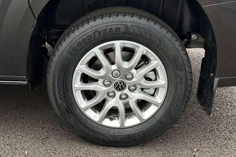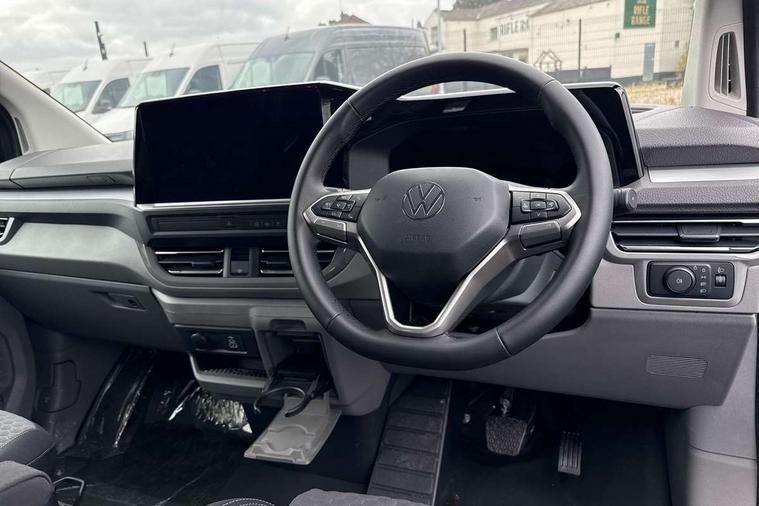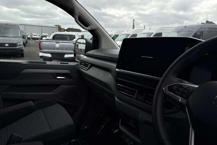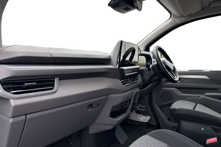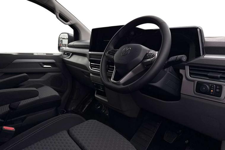 12" digital drivers display, 13" touchscreen infotainment display with wireless app connect and DAB radio, 5G Modem, Adaptive cruise control, Apple CarPlay and Android Auto, Dynamic road sign display, eCall emergency system, Electromechanical speed sensitive power steering, height and longitudinally adjustable steering column, Lane and blind spot assist with exit warning system, Preparation of VW connect and connect plus, Traffic jam assist, Wireless mobile phone charging, Wrong way driver warning, Body colour bumpers, Body coloured door handles, Body coloured door mirrors, Body coloured radiator grille, Electrically heated, adjustable and folding door mirrors, Heat reflecting side window glass, Mud flaps front and rear, Rear Transporter nameplate in black grained decorative trim, Vehicle opening configuration 1x 1st row of seats, 2x all doors, 12V outlet in centre console and 12V outlet on rear right D-pillar, 2x 15-W USB data/charging ports in dashboard and 1x USB-C, 1x USB-A center bottom, 2x LED lights in load compartment, 3x additional super bright LED lights in load compartment, 4 way height and tilt adjustable head restraints, 5 additional USB-C charging ports, Black plastic scuff plate for sliding door in cargo without illumination, Cabin interior lighting, Gear selector lever on steering wheel, Glasses compartment in driver side roof, Grab handle on A-pillar passenger side, Illuminated lockable glovebox, Lashing rings for reinforced floor covering, Narrow centre console with cup holder and compartment for mobile phone, Overhead storage compartment, Rubber floor covering in cab, Striped fabric upholstery, Without passenger seats in load compartment, Driver and front passenger airbag with front passenger airbag deactivation, Dual tone horn, Front and curtain airbags for driver and front passenger, Seat belt pretensioner for driver seat, Anti theft alarm system with interior monitoring in cab, backup horn and towing protection, Electronic immobiliser, Lockable wheel bolts, Preparation for alcohol ignition interlock, 5+ Promise, Alternator - 230A, Electromechanical brake booster, Electronic stability control, ABS, ASR with deactivation button, hill start assist and brake assist system,