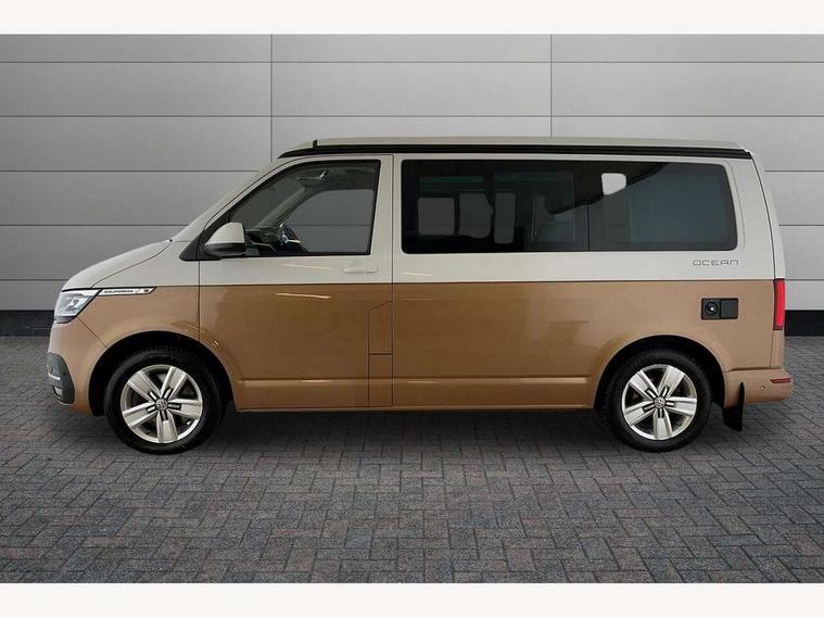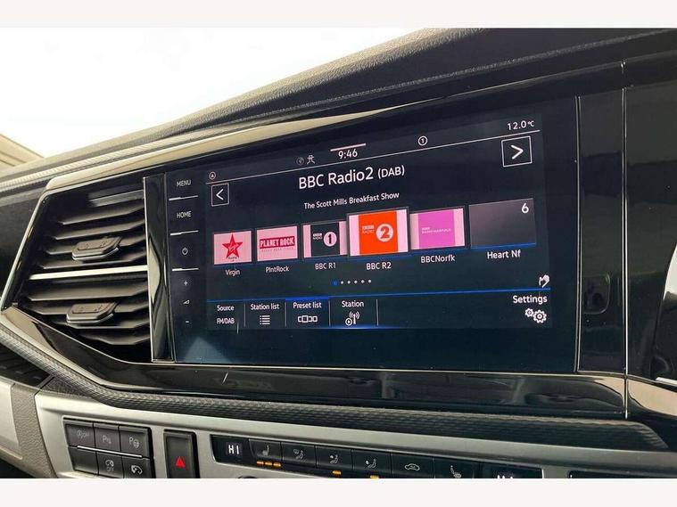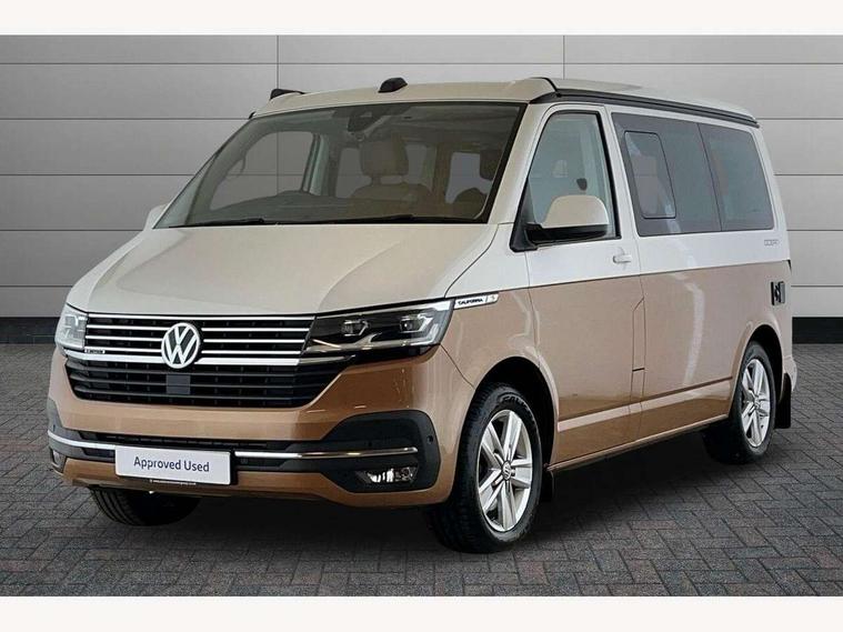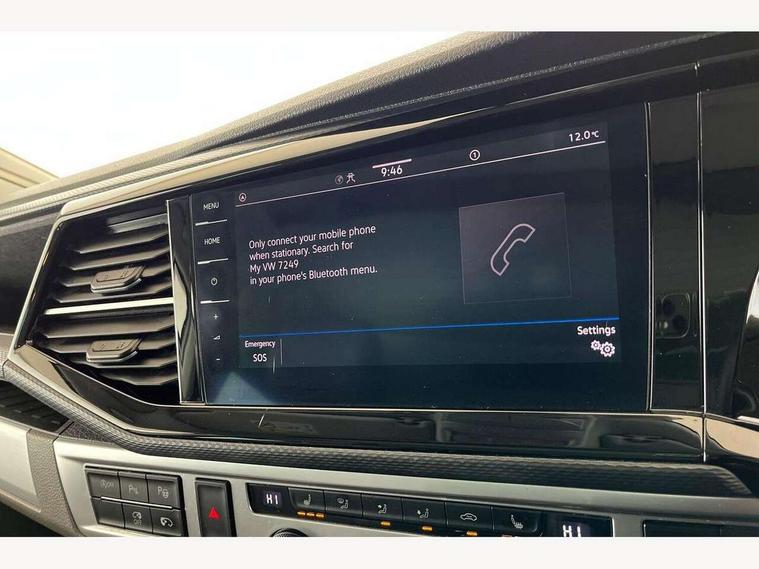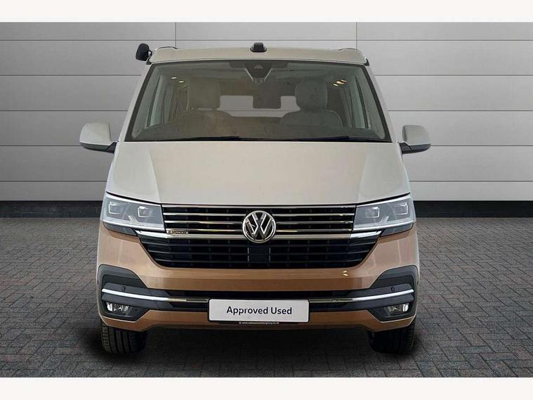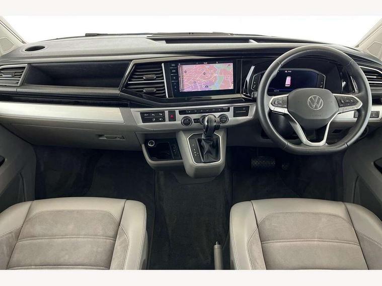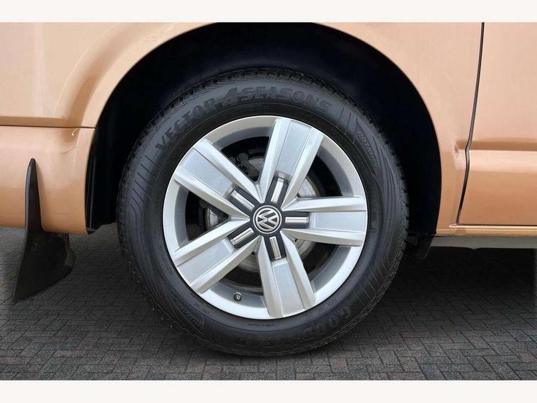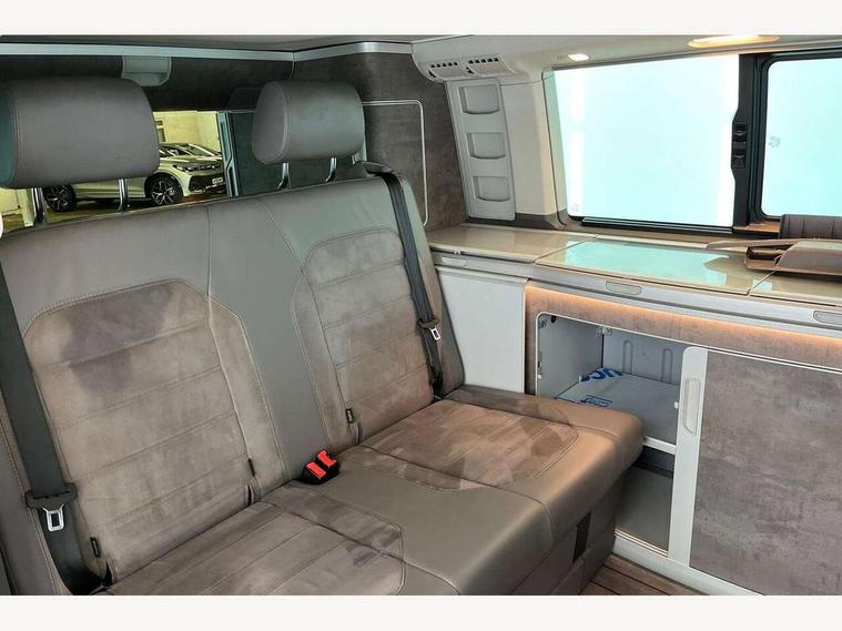 Cross wind assist, Digital cockpit and driver alert system, eCall emergency system, Mobile phone interface, Service interval indicator, Speed limiter, Start/stop system with regenerative braking, Tailgate latch without unlocking function from inside, Tailgate with window aperture and with power latching, Voice control system, Wired and wireless app connect, 17 inch chassis with 17 inch disc brakes in front and 16 inch disc brake in rear, 2 (type C) USB interfaces in dashboard, 8 speakers (4 tweeters + 4 woofers), Digital radio reception (DAB+), Additional dust seals on the outside, Auto dimming breakway interior rearview mirror, Automatic headlight range control, Body colour bumpers, California nameplate on the fender and on the rear, Front fog lights with cornering light, Heat insulating cab side windows, passenger compartment side windows tinted and with double glazing, Heated washer nozzles in front and washer fluid level indicator, LED headlamps with LED separate daytime running light, Left convex exterior mirror, Manual coming and leaving home function, Mounting rails on the roof (preparation for movable roof rack), Power adjustable, heated, power folding exterior mirrors, folding possible via vehicle key, Privacy glass with heat insulation, Radiator grille painted in black with 5 chrome trims, additional chrome trim at lower radiator grille, Rear window with insulating glass, rear window wiper and washer system, Right convex exterior mirror, Sliding window in front and fixed window in rear in load/passenger compartment at left, Windshield wiper intermittent control with rain sensor, Without left sliding door in load/passenger compartment, 1 waste bin in door storage compartment of the cab, 12V outlets in dashboard X 2, 2 velour floor mats, 2-seater bench/bed, movable along rail system and folds down into a two person bed, 230V inlet with charging feature for vehicle batteries and 230V outlet in the interior, 3 spoke leather wrapped multifunction steering wheel, Allergen filter, Armrest for both cab seats, Camping table for inside/outside in sliding door and 2 folding chairs in tailgate, Child seat anchors ISOFIX and top tether for Multivan/California in 2nd to 4th row of seats, Climatronic 3 zone air conditioning with 2nd evaporator, auxiliary heater, air conditioned headliner and additional passenger control, Dimmable illuminated instruments, Electromechanical speed sensitive power steering, height and longitudinally adjustable steering column, Front head restraints, Glove compartment with illumination, Grab handles on A pillar for access, on driver and front passenger side, Heated driver and front passenger seats, Illuminated steps in passenger/load compartment, Illuminated sun visors with mirror and airbag label on front passenger sun visor, Interior light concept for camper with comfort in passenger compartment, Interior loading edge protection in plastic, Jack and tool kit, Manually adjustable lumbar supports for left and right single seat in the 1st row of seats, Operating voltage 12V including 230V outlet on driver seat, Plastic floor covering in passenger/load compartment, Programmable parking heater with radio remote control and auxiliary heater, Rear head restraints, Refrigerant R1234yf, Roof bed (2000 x 1200 mm) with spring plates and mattress, Soft folding grab handles on roof frame, Special interior noise suppression measures, Special sound deadening measures in cab and passenger compartment, Step illumination with California lettering, Swivel seat on the left, with lumbar support in 1st row of seats, Swivel seat on the right, with lumbar support in 1st row of seats, Waeco compressor fridge, Without height adjustment for driver and single passenger seats, Smokers pack - California, Airbags - Drivers and front passengers side and curtain airbags, Driver/Front Passenger airbags, Electronic stability control, ABS, ASR, EDL, brake assist system, Front assist with Autonomous emergency braking for Adaptive cruise control (ACC), Height adjustable 3 point seat belts on outer seats in cab with electric pretensioners, Hill start assist, Passenger airbag deactivation system, Power operated child safety locks, Single tone horn, Warning buzzer and light for driver seat belt not fastened, Anti theft alarm system with interior monitoring in cab, backup horn and towing protection, Central locking system with radio remote control, system controls inside and safelock, Lockable wheel bolts, Comfort dashboard lower part in palladium with chrome elements and bezels painted in black,