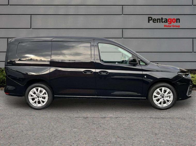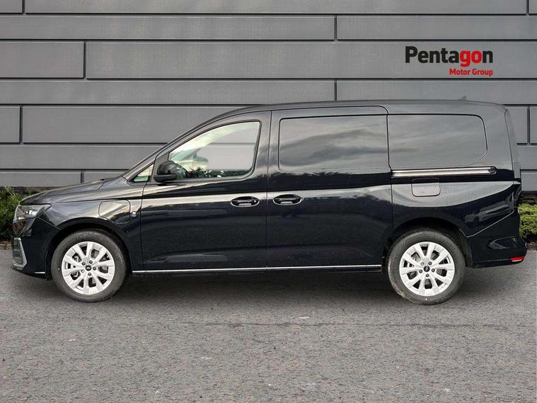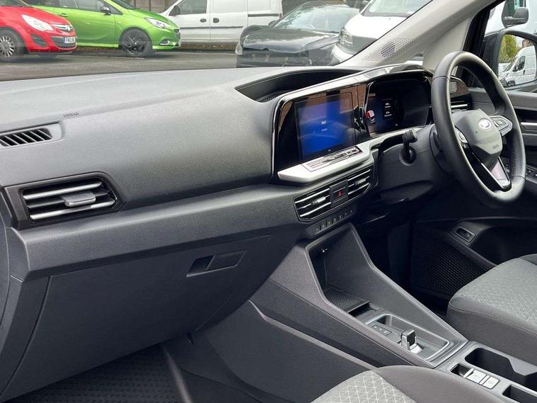 10" touchscreen infotainment display with volume and temperature slider controls, Android Auto and Apple Carplay with USB or wireless connectivity, Brake wear indicator, Enhanced digital cluster with navigation integration, Fordpass connect modem including eCall, Front camera system, PAS, Tyre pressure monitoring system with cluster display of tyre pressures, Wireless charging pad, 4 speakers, DAB radio bluetooth, voice control and navigation, Two USB (45W type C) front power/Data points, Auto Headlamps - Follow Me Home, Automatic headlamps on/off, Automatic windshield wiper, Black painted exterior mirror caps, Body colour door handles with silver door rail, Body coloured exterior tailgate handle, Body coloured front bumper, Body coloured rear bumper, Chrome grille and fog light surrounds, Day and night inside mirror, Dual power heated mirrors, Emergency brake light flashing, Front fog lights, High mounted stop lamp, Less roof rails, Misfuel Inhibitor, Power folding door mirrors, Power front windows - One touch up-down, Quickclear electric windshield defroster, Rear tinted glass, Standard green class windscreen, Tail lamps, Weather protection seals, 12V socket in cabin, 2 way front headrestraints, 4 way manually adjustable driver seat, 4 way manually adjustable passenger seat, Cargo area dual LED lights, Cargo area hardboard trim, Centre console with open stowage, Chrome air register, Driver and passenger sunvisor with mirror, Driver seat rotary recliner, Electronic dual zone automatic air conditioning, First row LED light with map lights, Fold flat passenger seat with integrated work surface, Foot pedal, Overhead storage compartment, Pollen filter without carbon filter, Reach and rake adjustable steering column, Recirculation heater, Rubber cab floor cover, Rubber load floor cover, Sensico gear shift knob, Sensico steering wheel, Silver interior door handles, Curtain airbags, Driver and front passenger airbag, Driver and passenger seatbelt reminder, Front active seat belts, Front passenger airbag deactivation, Front seat belt adjuster, 2 remote keys, Ford KeyFree system with power starter button and deadlocking, Immobiliser, Locking wheel bolts, Thatcham alarm system, 12v socket on cargo area, 50L fuel tank, ABS, Charging cable (Type 2 Mode 3), Electric parking brake, Emergency brake assist, ESP, RSC, wind mitigation, Standard duty alternator, Start/stop system, Traction control, Gloss black cluster and infotainment bezels with silver painted instrument panel spear, 17" silver alloy wheels with blue centre caps, 215/55 R17 tyres, Tyre repair kit,
