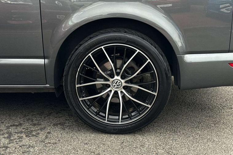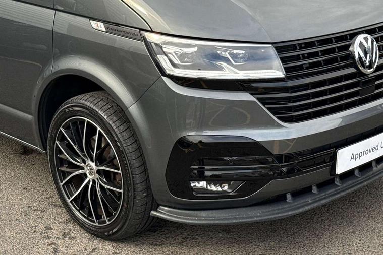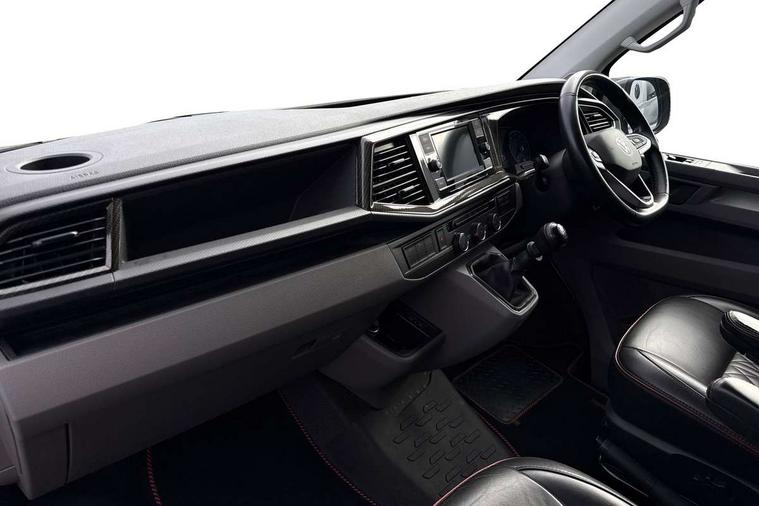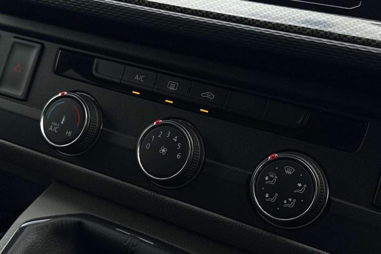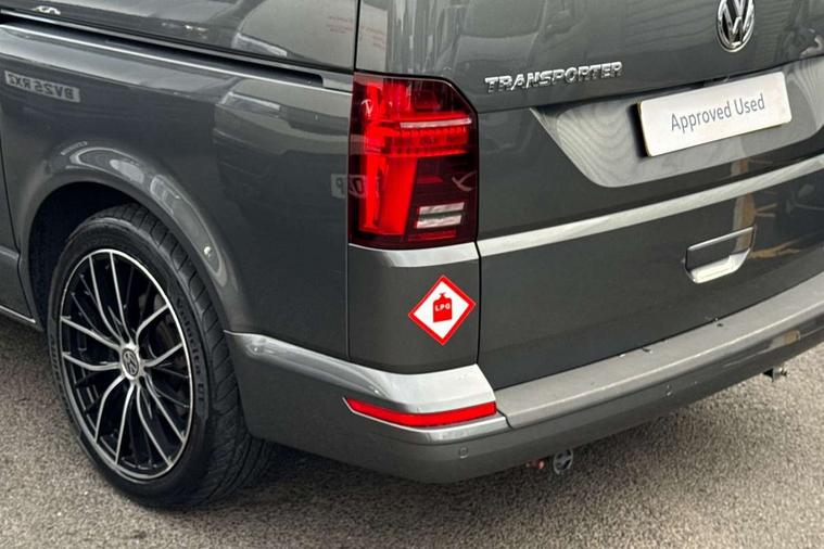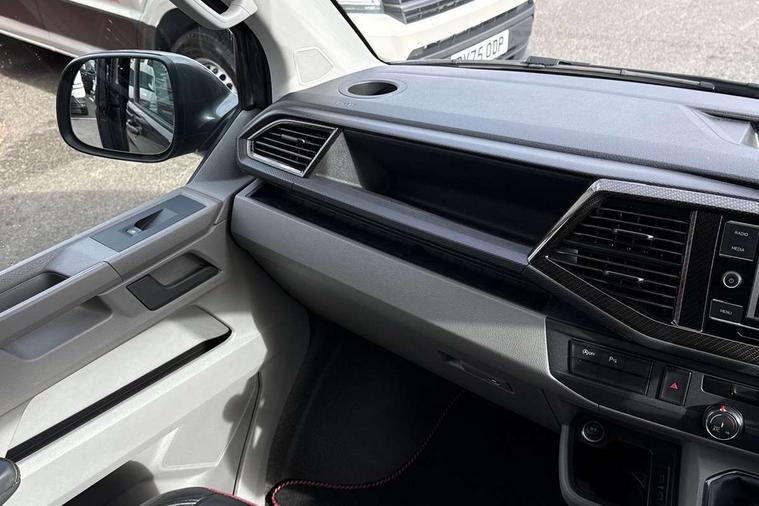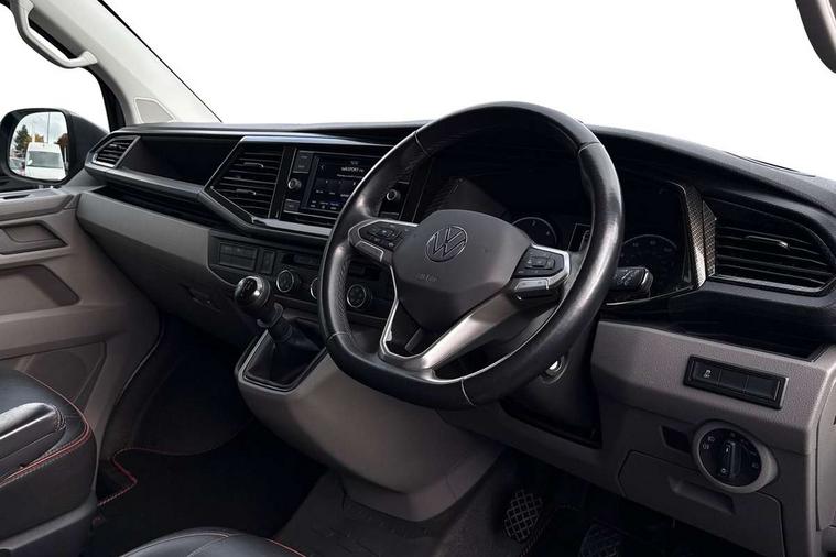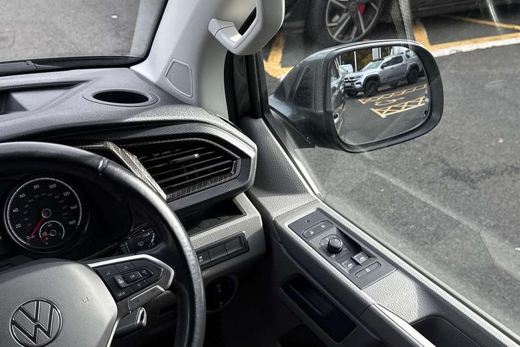 Adaptive cruise control, Cross wind assist, Dimmable illuminated instruments, Driver alert with Multi-function display plus, eCall emergency system, Electromechanical speed sensitive power steering, height and longitudinally adjustable steering column, Forward collision warning front assist with autonomous emergency braking, Mobile phone interface, Multi function display plus with black and white display, 2 USB interfaces type C in dashboard, 4 speakers with 2 tweeters and 2 woofers, Composition colour radio with 6.5" touchscreen, Digital radio reception (DAB+), Volkswagen app connect, Automatic headlight control, leaving home and manual coming home feature, Closing rear wing door with unlatching from the inside, Front fog lamps with cornering light, Green tinted heat insulating glass in cab and passenger compartment, Heated front windscreen, Left convex exterior mirror, Power adjustable and heated exterior mirrors, Power folding adjustable door mirrors with separately heated, Radiator grille with 2 chrome trims, Rear wing doors without window apertures, Right convex exterior mirror, Transporter nameplate on the rear fender, Windshield wiper intermittent control with rain sensor for windshield wipers, 3 spoke leather wrapped multi function steering wheel, Auto dimming breakaway interior rear view mirror, Comfort headliner in cab, hardboard roof trim in passenger and load compartment, Dust/pollen filter, Front and rear left without window closed side panel in load compartment, Front seats on the right in 1st row of seat, Glove compartment with illumination, High partition, Interior plastic loading edge protection, LED Interior lighting in load and passenger compartment, Manual adjustable lumbar support for right single seat in 1st row seats, Refrigerant R134a, Rubber floor covering in cab, Standard lower part dashboard in palladium, Storage compartments on cab seats and reading light, Without right side window apertures in passenger and load compartment, Comfort pack - Transporter, Exterior pack without fog light- Transporter, Non smoker pack - Transporter, 3 point height adjustable seat belts on outer seats cab with electric pretensioners, Driver and front passenger airbag with front passenger airbag deactivation, Single tone horn, Warning buzzer and light for driver and front passenger seat belt not fastened, Without child safety lock in passenger compartment, Anti theft alarm system with interior monitoring in cab, backup horn and towing protection, Lockable wheel bolts, 16" chassis with 16" brake system, Diesel particulate filter, Electronic stability control, ABS, ASR with deactivation button, hill start assist and brake assist system, Start/stop system with regenerative breaking, 16" Clayton alloy wheels,