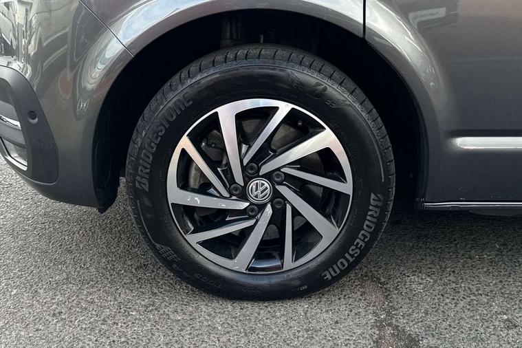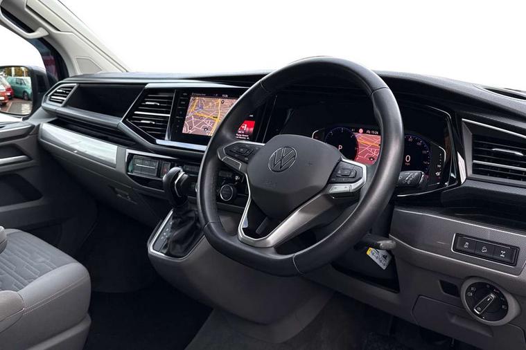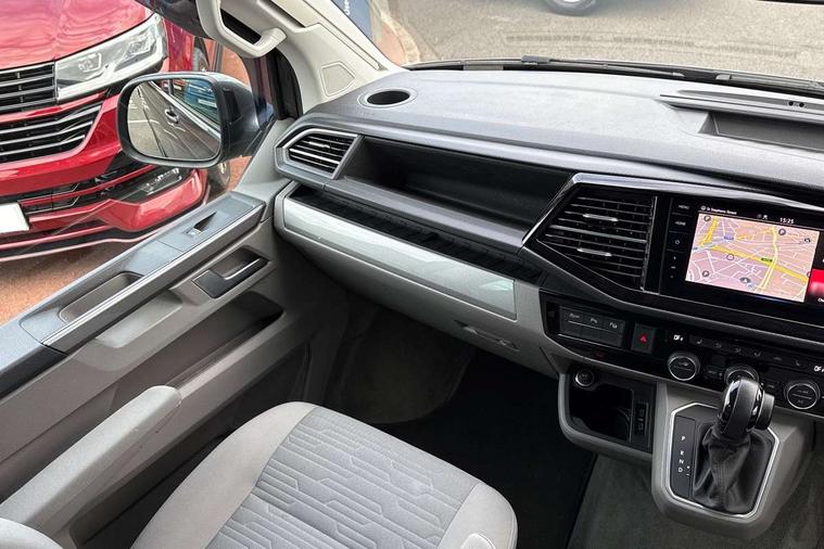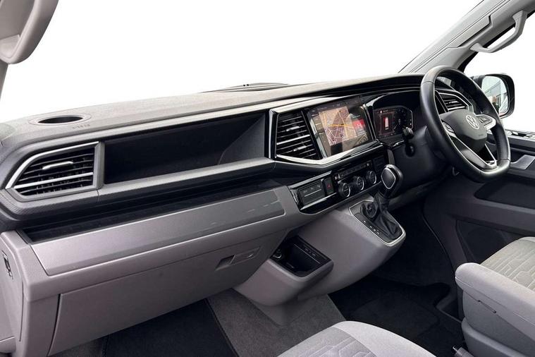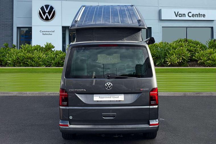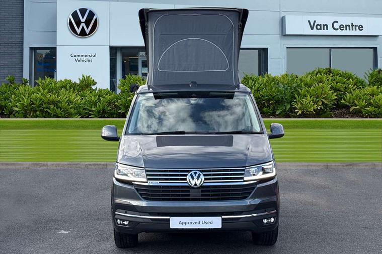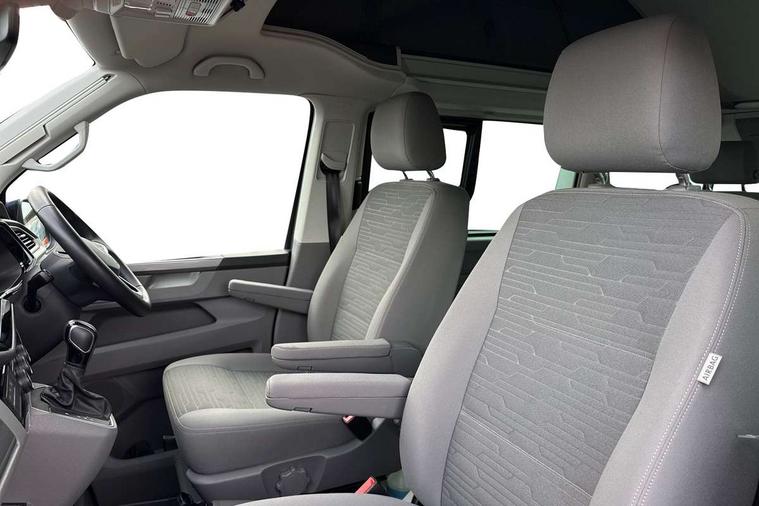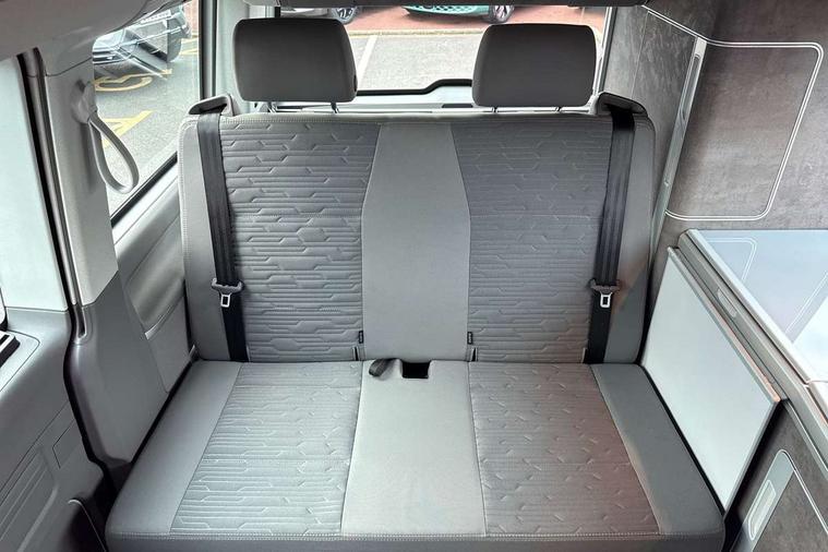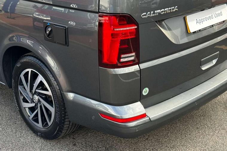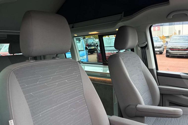 8" touch screen, Cross wind assist, Digital cockpit and driver alert system, eCall emergency system, Lane assist with side assist, Mobile phone interface, Navigation system preparation, Service interval indicator, Speed limiter, Start/stop system with regenerative braking, Tailgate latch without unlocking function from inside, Tailgate with window aperture and with power latching, Voice control system, Wired and wireless app connect, 17 inch chassis with 17 inch disc brakes in front and 16 inch disc brake in rear, 2 additional batteries with free maintanace including 1 additional battery with cut-off relay, 2 (type C) USB interfaces in dashboard, 8 speakers (4 tweeters + 4 woofers), Digital radio reception (DAB+), Regional code ECE for radio, Additional dust seals on the outside, Automatic headlight range control, Body colour bumpers, Body coloured door handles, California nameplate on the fender and on the rear, Electrically adjustable, heated, folding exterior mirrors, Electrohydrolic operated pop up roof with 3 windows and 1 front aperture, Front fog lights with cornering function, Heat insulating cab side windows, passenger compartment side windows tinted and with double glazing, Heated washer nozzles in front and washer fluid level indicator, High level 3rd brake light, LED headlamps with LED separate daytime running light, Left convex exterior mirror, Mounting rails on the roof (preparation for movable roof rack), Privacy glass with heat insulation, Radiator grille painted in black with 5 chrome trims, additional chrome trim at lower radiator grille, Rear boot, Rear window with insulating glass, rear window wiper and washer system, Right convex exterior mirror, Sliding window in front with fly screen and fixed window in rear in load passenger compartment left, Without left sliding door in load/passenger compartment, 1 waste bin in door storage compartment of the cab, 12V outlets in dashboard X 2, 2 velour floor mats, 2-seater bench/bed, movable along rail system and folds down into a two person bed, 230V inlet with charging feature for vehicle batteries and 230V outlet in the interior, 3 spoke leather wrapped multifunction steering wheel, Allergen filter, Armrest for both cab seats, Camping table for inside/outside in sliding door and 2 folding chairs in tailgate, Child seat anchors ISOFIX and top tether for Multivan/California in 2nd to 4th row of seats, Climatronic 3 zone air conditioning with 2nd evaporator, auxiliary heater, air conditioned headliner and additional passenger control, Dimmable illuminated instruments, Electromechanical speed sensitive power steering, height and longitudinally adjustable steering column, Front head restraints, Fully functional kitchen with gas hob, sink and 42 litre compressor cool box, Glove compartment with illumination, Grab handles on A pillar for access, on driver and front passenger side, Heated driver and front passenger seats, Illuminated steps in passenger/load compartment, Illuminated sun visors with mirror and airbag label on front passenger sun visor, Interior light concept for camper with comfort in passenger compartment incl additional LED light in the pop up roof for the loft bed, in the tailgate, Interior loading edge protection in plastic, Jack and tool kit, Manually adjustable lumbar supports for left and right single seat in the 1st row of seats, Operating voltage 12V including 230V outlet on driver seat, Plastic floor covering in passenger/load compartment, Programmable parking heater with radio remote control and auxiliary heater, Rear head restraints, Refrigerant R1234yf, Roof bed (2000 x 1200 mm) with spring plates and mattress, Soft folding grab handles on roof frame, Special interior noise suppression measures, Special sound deadening measures in cab and passenger compartment, Step illumination with California lettering, Swivel seat on the left, with lumbar support in 1st row of seats, Swivel seat on the right, with lumbar support in 1st row of seats, Waeco compressor fridge, Without height adjustment for driver and single passenger seats, Lights and vision pack - California, Smokers pack - California, Airbags - Drivers and front passengers side and curtain airbags, Driver/Front Passenger airbags, Electronic stability control, ABS, ASR, EDL, brake assist system, Front assist with Autonomous emergency braking for Adaptive cruise control (ACC), Height adjustable 3 point seat belts on outer seats in cab with electric pretensioners, Hill start assist, Passenger airbag deactivation system, Power operated child safety locks, Single tone horn, Warning buzzer and light for driver seat belt not fastened, Anti theft alarm system with interior monitoring in cab, backup horn and towing protection, Central locking system with radio remote control, system controls inside and safelock, Lockable wheel bolts, Comfort dashboard lower part in palladium with chrome elements and bezels painted in black,