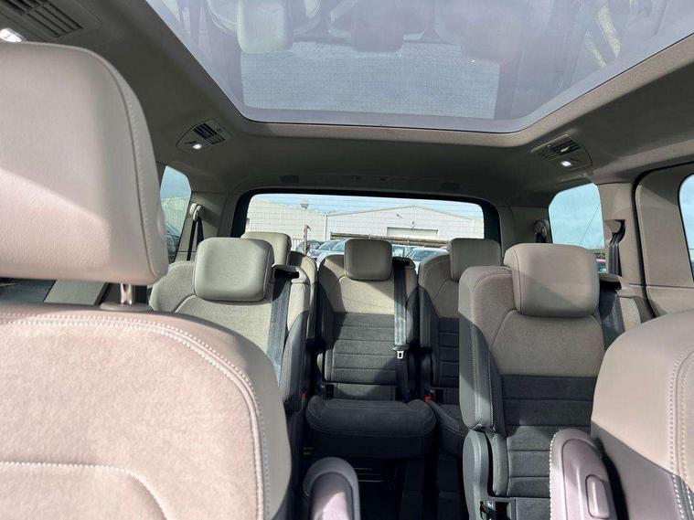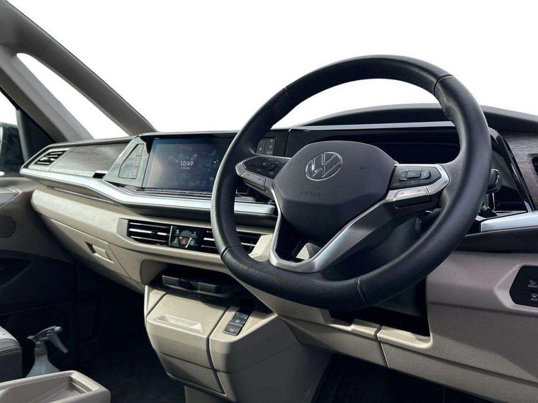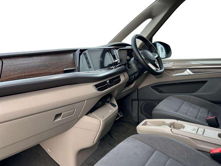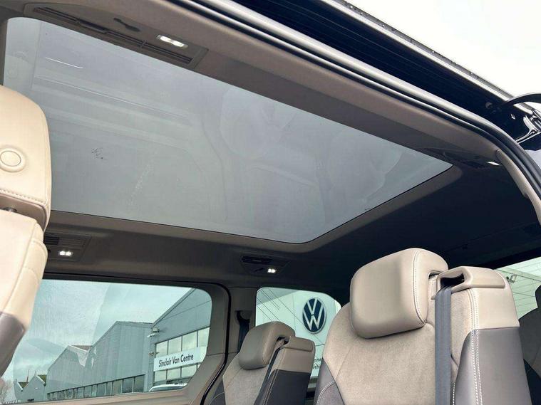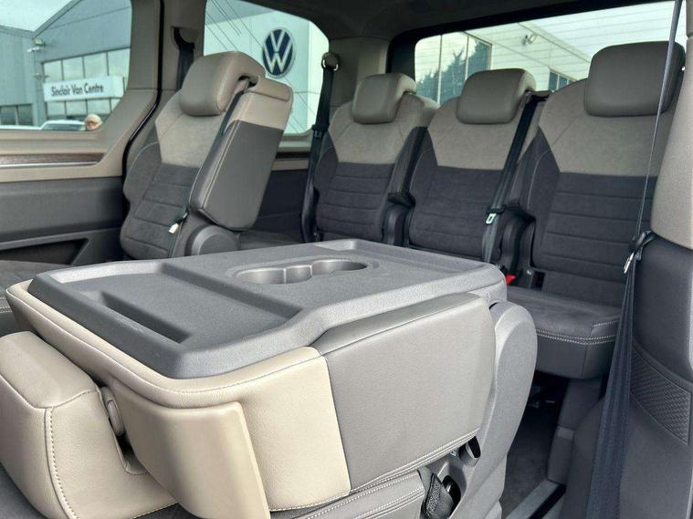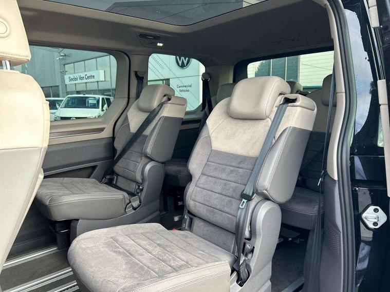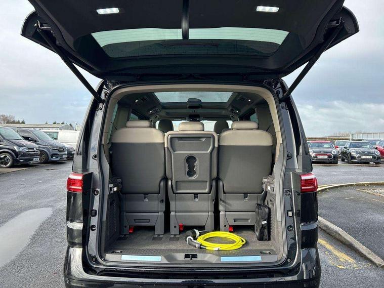 Adaptive cruise control with C2X including front assist and city emergency braking system, App-Connect incl. App-Connect Wireless for Apple CarPlay and Android Auto, Digital Cockpit Pro with 10.25" Display, Driver alert system, Dynamic road sign display, eCall emergency system, Electric tailgate with virtual pedal, Electrically-operated tailgate opening and closing function (Easy open), operated via foot movement under rear tailgate, Emergency assist, Lane change system with side assist including blind spot monitor, rear traffic alert and exit warning system, Lane keeping system Lane Assist, Mobile phone interface, PAS, Rear view camera, Semi-automated driving assistance, Socket AC Type 2, Travel assist, Voice control system including Alexa web app, We connect preparation, 1 x 6 metre charging cables - 16amp AC cable for wallbox chargepoints (mode 3), Electronic differential lock, 2 USB-C ports in front and 4 USB-C ports in passenger compartment, Digital radio reception (DAB+), Additional interior noise reduction measures, Advanced high beam control dynamic light assist for LED matrix headlamps, Automatic headlight control with welcome home lights, Body coloured exterior door handles, Break away auto dimming rear view interior mirror, Dynamic headlight range control with dynamic cornering light, Electric sliding rear side door on the left/right with easy open feature, Electrically adjustable, heated and folding door mirrors, Front fog lights, Glossy black painted radiator grille with 2 illuminated chrome trims, Heated rear window with window wiper and washer system, Heated windscreen, High gloss black exterior mirror housing, IQ.Light LED matrix headlamps with LED separate daytime running light, Laminated safety glass windshield, heat and sound insulating, LED 3rd brake lamp, LED rear combination lamps, Rear wiper, Stainless steel tailgate trim, Surround lighting in door area and tailgate with logo projection in door area, Windshield wiper intermittent control with rain sensor, 1 x 12V sockets on the dash panel, 12V socket in passenger compartment, 3 seat bench in 3rd row, 30 colours ambient interior lighting and tailgate surround lighting, 7 single seats removable/movable, Carpet mats in cab, Climatronic 3 zone air conditioning with 2nd evaporator, auxiliary heater, air conditioned headliner and additional passenger control, Front and rear head restraints, Grab handles on A pillar for access, on driver and front passenger side, Heated steering wheel, Height adjustable seats, Height and longitudinal adjustment steering wheel with gear shift paddles, Illumination lockable glovebox compartment, ISOFIX (including i-size) and top tether in all seats in 2nd and 3rd rows, LED luggage compartment lighting X 2, Load compartment partition to 20kg with bag hooks and luggage net, Luggage compartment lid power latching with unlatching from inside, Multifunction leather steering wheel with tiptronic, Reinforced carpet floor covering in passenger compartment, Removable armrests for front seats with power adjustable lumbar support and folding table for 2nd row passenger seats, Removable armrests in 2nd row passenger seats, Single front passenger seat, Stainless steel pedals, Storage compartment under the 2nd and 3rd row seat and two waste bins, Sun visors with illuminated vanity mirrors and airbag warning label on front passenger sun visors, 3x3 point rear seat belts, ABS, Automatic post collision braking system, Autonomous emergency braking front assist with pedestrian and cyclist monitoring, Driver and front passenger airbag with front passenger airbag deactivation, Electric childproof lock, Electronic stability control (ESC) and Electromechanical brake booster, ESP, First aid kit with warning triangle and safety vest, Front disc brakes, Hill hold assist, Seat belt warning for the drivers and all passengers seats if unfastened, Side and curtain airbags for driver and front passenger, curtain airbags for outer seats in rear, centre airbag in front, Single tone horn, Traction control, Tyre pressure monitoring system, Anti theft alarm system with interior monitoring in cab, backup horn and towing protection, Central locking system keyless entry with touch two stage unlocking, Start/stop button on centre console, Dark woodgrain optic decorative inserts,