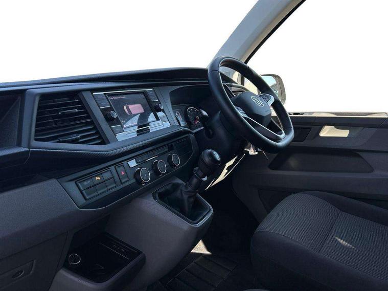 Cross wind assist, Dimmable illuminated instruments, Driver alert with Multi-function display plus, eCall emergency system, Forward collision warning front assist with autonomous emergency braking, Mobile phone interface, Multi function display plus with black and white display, 2 USB interfaces type C in dashboard, 4 speakers with 2 tweeters and 2 woofers, Composition colour radio with 6.5" touchscreen, Digital radio reception (DAB+), Volkswagen app connect, Closing rear wing door with unlatching from the inside, H7 twin halogen headlamps, Heat insulating glass (green) in cab and passenger/load compartment, Heat insulating windshield made of laminated glass, Left convex exterior mirror, Rear wing doors without window apertures, Right convex exterior mirror, Separate Daytime running lights, Transporter nameplate on the rear fender, Unpainted radiator grille with 2 chrome trims, 3 spoke leather wrapped multi function steering wheel, Comfort headliner in cab, hardboard roof trim in passenger and load compartment, Dust/pollen filter, Folding grab handles on roof frame, Front and rear left without window closed side panel in load compartment, Front seats on the right in 1st row of seat, Heavy duty tool kit and jack, High partition, Interior plastic loading edge protection, LED Interior lighting in load and passenger compartment, Standard lower part dashboard in palladium, Without refrigerant, Without right side window apertures in passenger and load compartment, Non smoker pack - Transporter, 3 point height adjustable seat belts on outer seats cab with electric pretensioners, Driver and front passenger airbag with front passenger airbag deactivation, Warning buzzer and light for driver and front passenger seat belt not fastened, Without child safety lock in passenger compartment, Electronic immobiliser, Wheel bolts without wheel locks, 16" chassis with 16" brake system, Diesel particulate filter, Electronic stability control, ABS, ASR with deactivation button, hill start assist and brake assist system, Standard anti drum measures, Start/stop system with regenerative breaking,