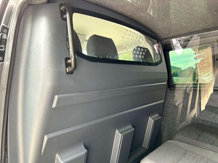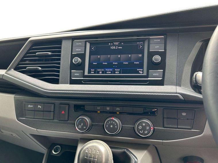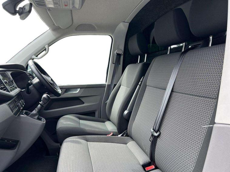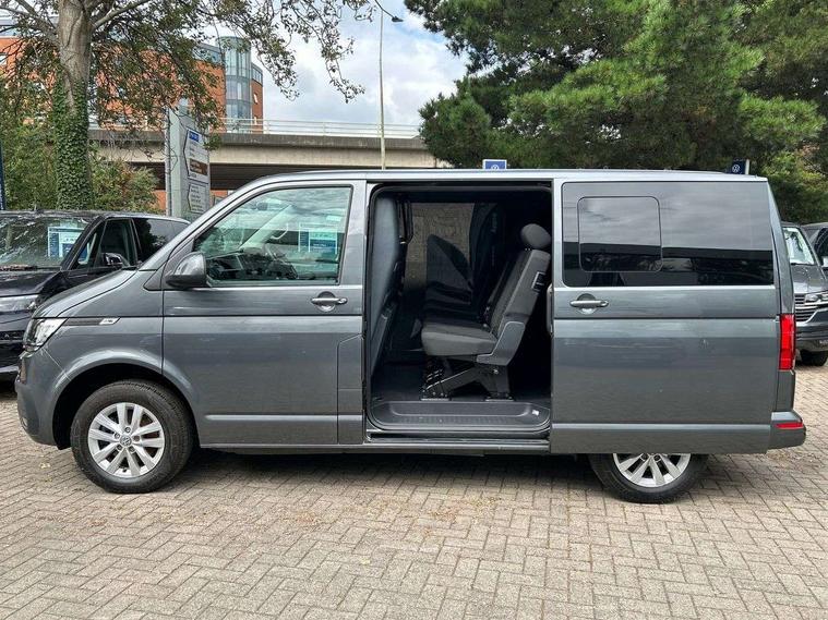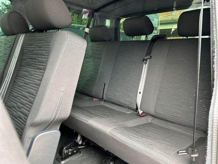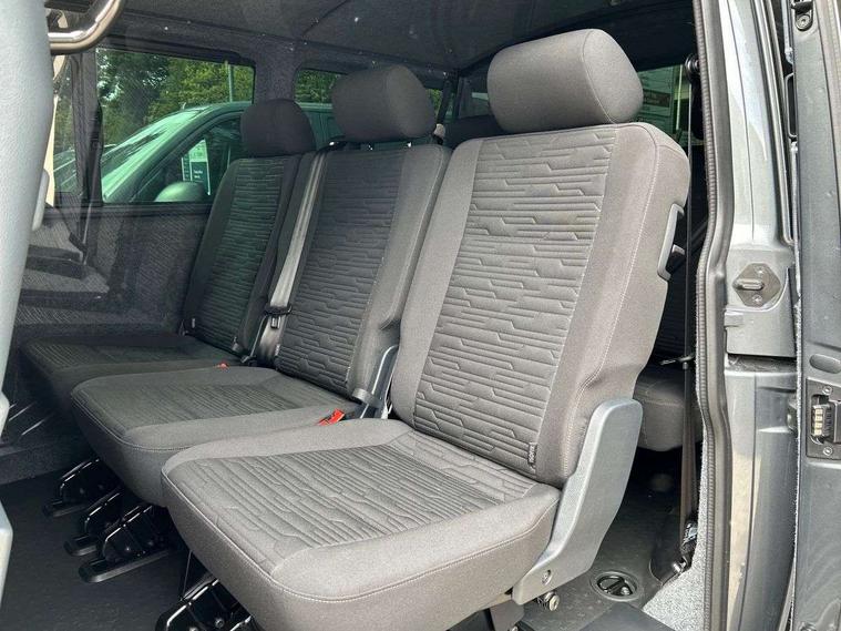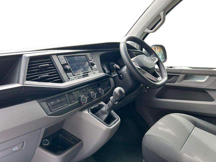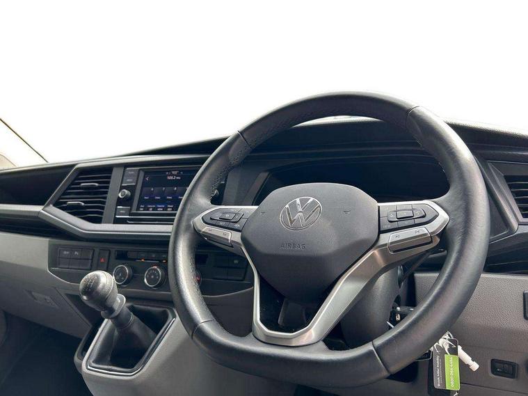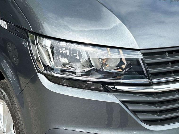 Adaptive cruise control, Child seat anchors ISOFIX and top tether in 2nd row of seats, Cross wind assist, Dimmable illuminated instruments, Driver alert with black and white multi function display plus, eCall emergency system, Forward collision warning front assist with autonomous emergency braking, Headlight range control, Mobile phone interface, Without voice control, 2 USB interfaces type C in dashboard, 4 speakers with 2 tweeters and 2 woofers, Composition colour radio with 6.5" touchscreen, Digital radio reception (DAB+), Volkswagen app connect, Automatic headlight control, leaving home and manual coming home feature, Front fog lamps with cornering light, Green heat insulating glass, Heated front windscreen, Illuminated steps in passenger/load compartment, Left convex exterior mirror, Power folding adjustable door mirrors with separately heated, Privacy glass from the B-pillar and heat-insulating glass in front, Radiator grille with 2 chrome trims, Rear window with heated insulating glass, heated rear window wiper and washer system, Right convex exterior mirror, Tailgate closing with unlatching from the inside, Transporter nameplate on the rear fender, Windshield wiper intermittent control with rain sensor for windshield wipers, Without adhesive film, 3 spoke leather wrapped multi function steering wheel, Additional sound deadening measures in cab and passenger compartment, Auto dimming breakaway interior rear view mirror, Comfort headliner in cab, hardboard roof trim in passenger and load compartment, Dust/pollen filter, Folding grab handles and storage compartments on cab seats, reading light, Front seats on the right in 1st row of seat, Glove compartment with illumination, Heavy duty tool kit and jack, Interior plastic loading edge protection, Lashing rings for load restraint system, LED Interior lighting in load and passenger compartment, Manual height adjustable and lumbar support for driver and single passenger seats, Medium height for vehicles with window aperture hardboard side trim panels in passenger/load compartment, Refrigerant R134a, Standard lower part dashboard in palladium, Without partition, Without seats in 3rd row of seats, Comfort pack - Transporter, Exterior pack without fog light- Transporter, Light and vision pack - Transporter, Non smoker pack - Transporter, 3 point height adjustable seat belts on outer seats cab with electric pretensioners, Driver and front passenger airbag with front passenger airbag deactivation, Power operated child safety lock, Warning buzzer and light for driver seat belt not fastened, Anti theft alarm system with interior monitoring in cab, backup horn and towing protection, Lockable wheel bolts, 16" chassis with 16" brake system, Additional 12V socket, Diesel particulate filter, Electronic stability control, ABS, ASR with deactivation button, hill start assist and brake assist system, Speed limiter, Start/stop system with regenerative breaking, 16" Clayton alloy wheels, Wheel trims,