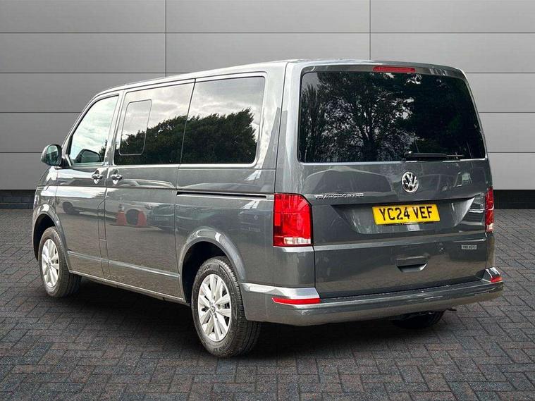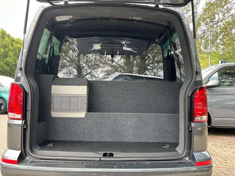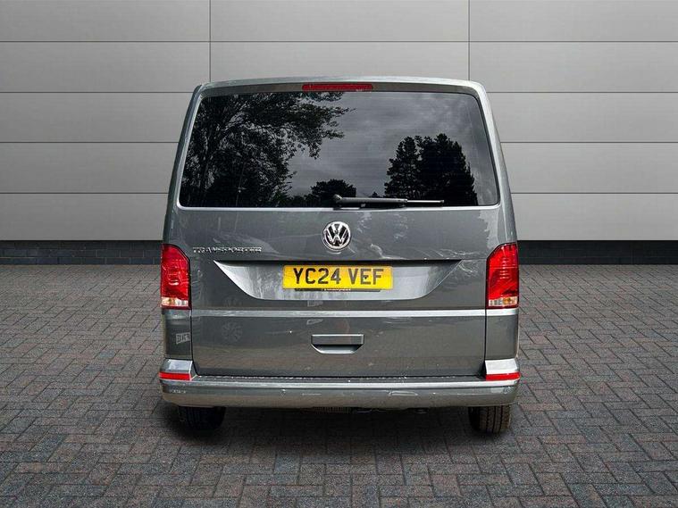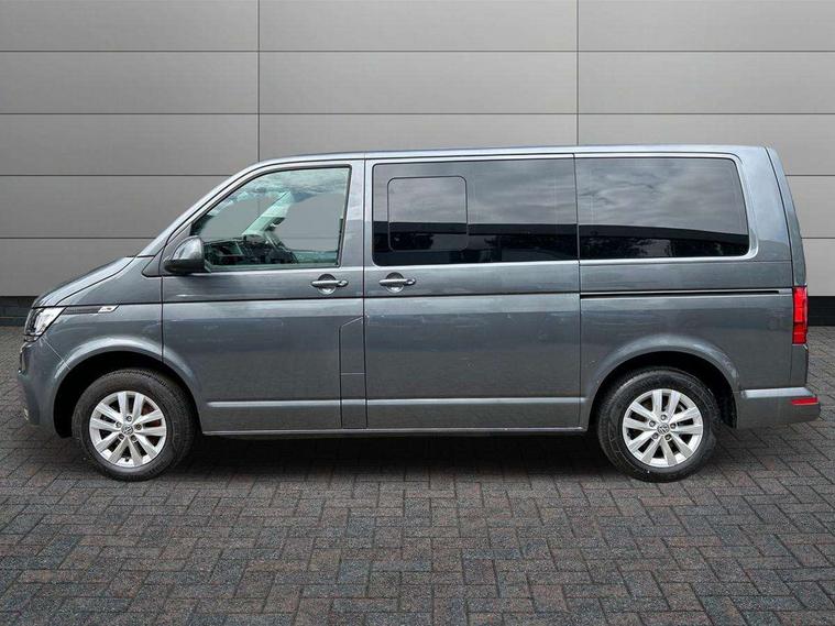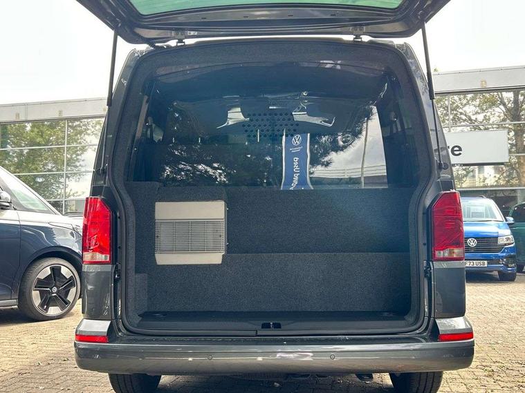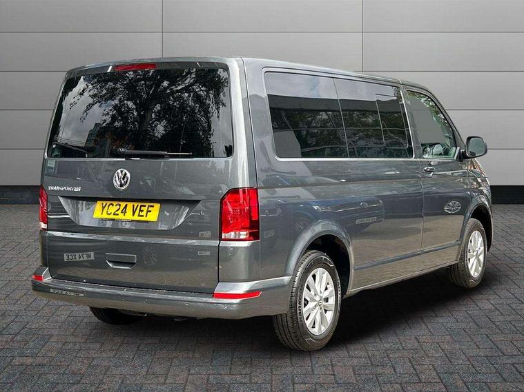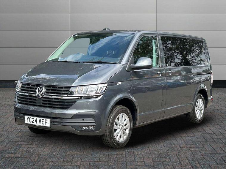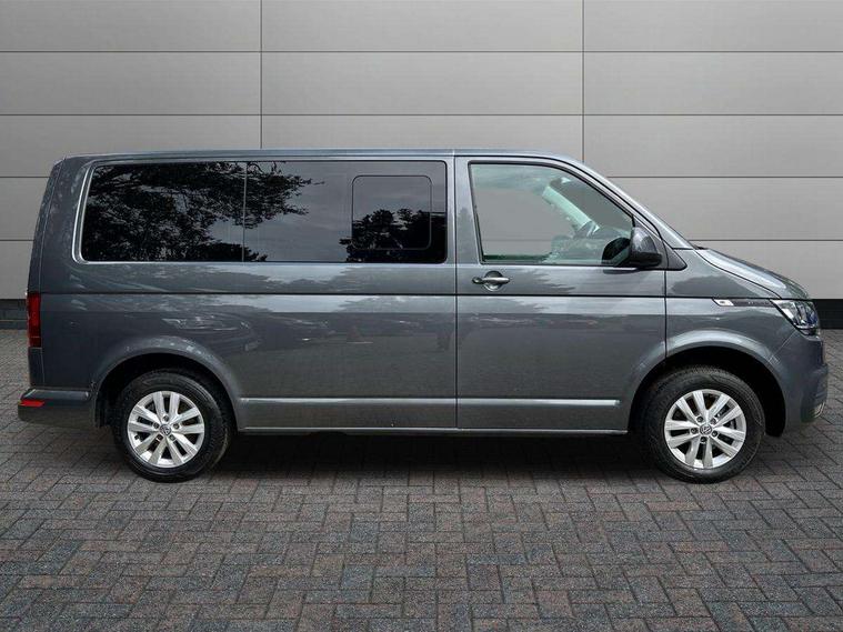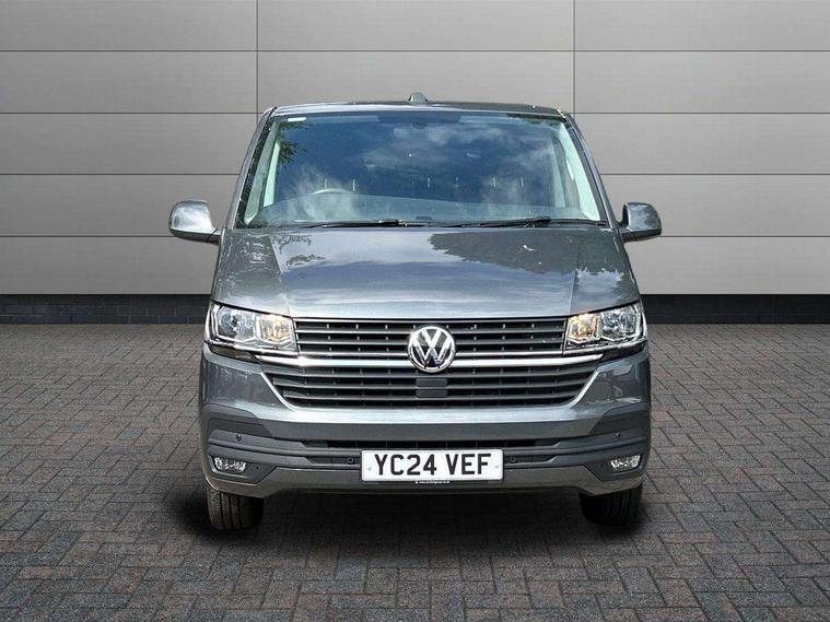 Adaptive cruise control, Child seat anchors ISOFIX and top tether in 2nd row of seats, Cross wind assist, Dimmable illuminated instruments, Driver alert with black and white multi function display plus, eCall emergency system, Forward collision warning front assist with autonomous emergency braking, Headlight range control, Mobile phone interface, Without voice control, 2 USB interfaces type C in dashboard, 4 speakers with 2 tweeters and 2 woofers, Composition colour radio with 6.5" touchscreen, Digital radio reception (DAB+), Volkswagen app connect, Automatic headlight control, leaving home and manual coming home feature, Front fog lamps with cornering light, Green heat insulating glass, Heated front windscreen, Illuminated steps in passenger/load compartment, Left convex exterior mirror, Power folding adjustable door mirrors with separately heated, Privacy glass from the B-pillar and heat-insulating glass in front, Radiator grille with 2 chrome trims, Rear window with heated insulating glass, heated rear window wiper and washer system, Right convex exterior mirror, Tailgate closing with unlatching from the inside, Transporter nameplate on the rear fender, Windshield wiper intermittent control with rain sensor for windshield wipers, Without adhesive film, 3 spoke leather wrapped multi function steering wheel, Additional sound deadening measures in cab and passenger compartment, Auto dimming breakaway interior rear view mirror, Comfort headliner in cab, hardboard roof trim in passenger and load compartment, Dust/pollen filter, Folding grab handles and storage compartments on cab seats, reading light, Front seats on the right in 1st row of seat, Glove compartment with illumination, Heavy duty tool kit and jack, Interior plastic loading edge protection, Lashing rings for load restraint system, LED Interior lighting in load and passenger compartment, Manual height adjustable and lumbar support for driver and single passenger seats, Medium height for vehicles with window aperture hardboard side trim panels in passenger/load compartment, Refrigerant R134a, Standard lower part dashboard in palladium, Without partition, Without seats in 3rd row of seats, Comfort pack - Transporter, Exterior pack without fog light- Transporter, Light and vision pack - Transporter, Non smoker pack - Transporter, 3 point height adjustable seat belts on outer seats cab with electric pretensioners, Driver and front passenger airbag with front passenger airbag deactivation, Power operated child safety lock, Warning buzzer and light for driver seat belt not fastened, Anti theft alarm system with interior monitoring in cab, backup horn and towing protection, Lockable wheel bolts, 16" chassis with 16" brake system, Additional 12V socket, Diesel particulate filter, Electronic stability control, ABS, ASR with deactivation button, hill start assist and brake assist system, Speed limiter, Start/stop system with regenerative breaking, 16" Clayton alloy wheels, Wheel trims,