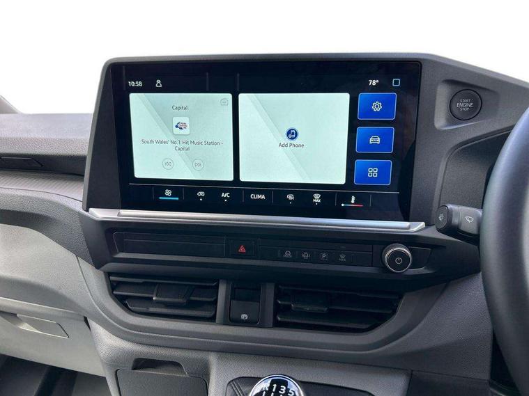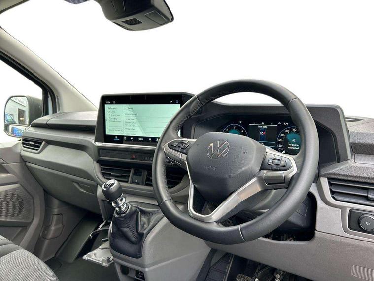 12" digital drivers display, 13" touchscreen infotainment display with wireless app connect and DAB radio, 5G Modem, Apple CarPlay and Android Auto, Cruise control, Dynamic road sign display, eCall emergency system, Electromechanical speed sensitive power steering, height and longitudinally adjustable steering column, Lane assist, Preparation of VW connect and connect plus, Wrong way driver warning, 4 speakers - 2x dashboard, 2x cab doors, Body coloured door handles, Heat reflecting side window glass, Mud flaps front and rear, Rear Transporter nameplate in black grained decorative trim, Vehicle opening configuration 1x 1st row of seats, 2x all doors, 2x 15-W USB data/charging ports in dashboard and 1x USB-C, 1x USB-A center bottom, 2x LED lights in load compartment, 3 spoke leather wrapped multi function steering wheel, 4 way height and tilt adjustable head restraints, Black plastic scuff plate for sliding door in cargo without illumination, Cabin interior lighting, Lashing rings for reinforced floor covering, Leatherette gear lever, Narrow centre console with cup holder and compartment for mobile phone, Overhead storage compartment, Roof grab handle on front passenger side, Rubber floor covering in cab, Striped fabric upholstery, Without passenger seats in load compartment, Driver and front passenger airbag with front passenger airbag deactivation, Dual tone horn, Front and curtain airbags for driver and front passenger, Seat belt pretensioner for driver seat, Anti theft alarm system with interior monitoring in cab, backup horn and towing protection, Electronic immobiliser, Preparation for alcohol ignition interlock, 5+ Promise, Alternator - 230A, Electronic stability control, ABS, ASR with deactivation button, hill start assist and brake assist system,