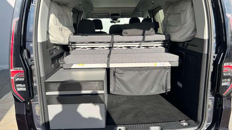 Driver alert system, eCall emergency call system, Lane keeping system, Multi function display, On board computer, Service interval indicator, Start/stop system with regenerative braking, Tailgate with heated window, We connect plus preparation, 180A alternator, Diesel particulate filter, Electronic differential lock, DAB Digital radio, 3rd brake light, Automatic hazard lights activation under emergency braking, Automatic headlight control system, Black painted exterior mirror housings, Body colour bumpers, Body colour door handles, Electric front windows, Fixed side window in load/passenger compartment, Heat insulating windscreen, LED tailgate surround lighting, Rain sensor, Rear window wiper and washer system with intermittent control, Silver sliding door rail, Twin near side and off side sliding doors, Windscreen wiper with variable intermittent delay and wash wipe system, 12V outlet with cigarette lighter and ashtray, 12V socket in passenger compartment, 2 folding chairs and 1 folding table including bag for storing under the bed, 3 seat bench in 2nd row (fold/flip/removable), 5 standard interior lights in passenger compartment, California lettering on the sliding doors at waistline level and on the tailgate, bottom left, Carpet floor covering in cab, Carpet floor covering in passenger compartment, Double grid cloth upholstery, Electrically controlled heating system, Folding comfort bed with dished springs (1980mm x 1070mm), Folding table on front seat backrests, Front head restraints, Integrated gas bottle, cooker, cutlery drawer and storage in mini kitchen, Interior light in headlining, LED reading light in passenger compartment, Lockable glove compartment door with light, Magnetic window blinds for all windows, Manual adjustable lumbar support in front seats, Manual front seats with height adjustment, Multifunction steering wheel, Overhead storage compartment, Plastic door trim panel and fabric side trim panel, Plastic gearshift knob/handle, Pull-out kitchenette in the rear - single burner, Reach and rake adjustable steering column, Rear head restraints, Removable storage packs in rear side window, Single front passenger seat, Storage drawers under front seats, Sun visors with mirror and airbag label on front passenger, Ventilation grille with mosquito screen for driver and front passenger doors, 3-point seat belts in front with pretensioner and height adjustment, 3x3 point rear seatbelts, Anti-lock braking system (ABS), Automatic post collision braking system, Autonomous emergency braking front assist with pedestrian and cyclist monitoring, Brake assist, Curtain airbag for outer seats in rear, Direct tyre pressure monitoring system, Driver and front passenger airbag with front passenger airbag deactivation, Electric parking brake with auto hold function, Electronic brake force distribution, Engine drag torque control, ESP, First aid kit with warning triangle and safety vest, Front centre airbag, Power operated child safety locks, Seat belt reminder, Side and curtain airbag for driver and front passenger, Traction control system (TCS), Anti theft alarm system with interior monitoring, backup horn and towing protection, Decorative inserts birch vein,