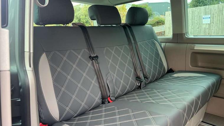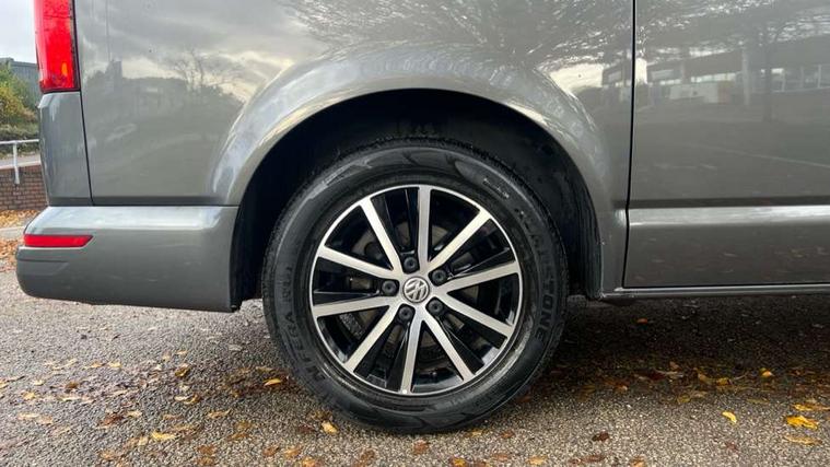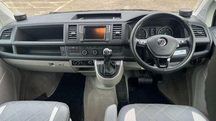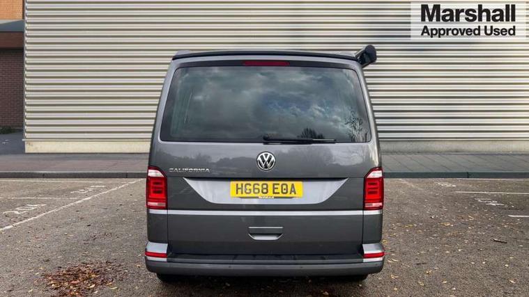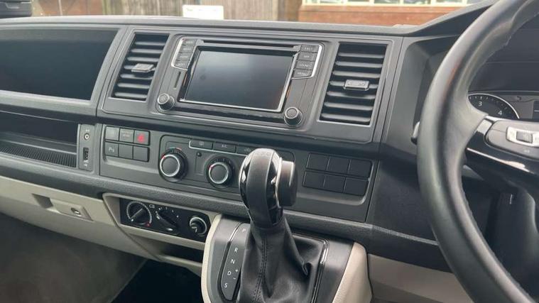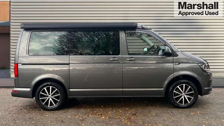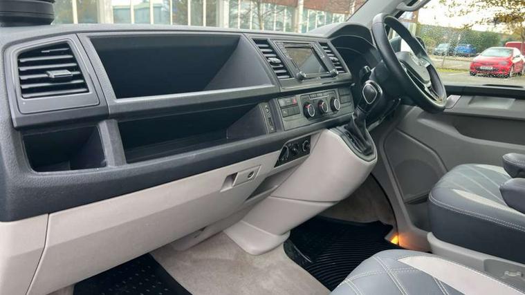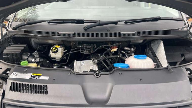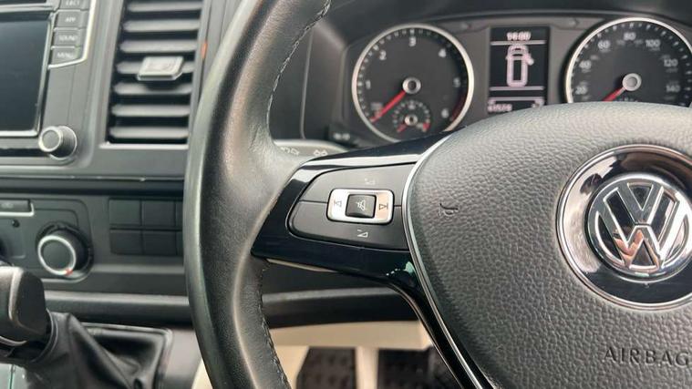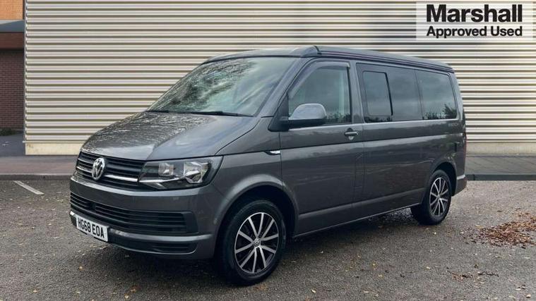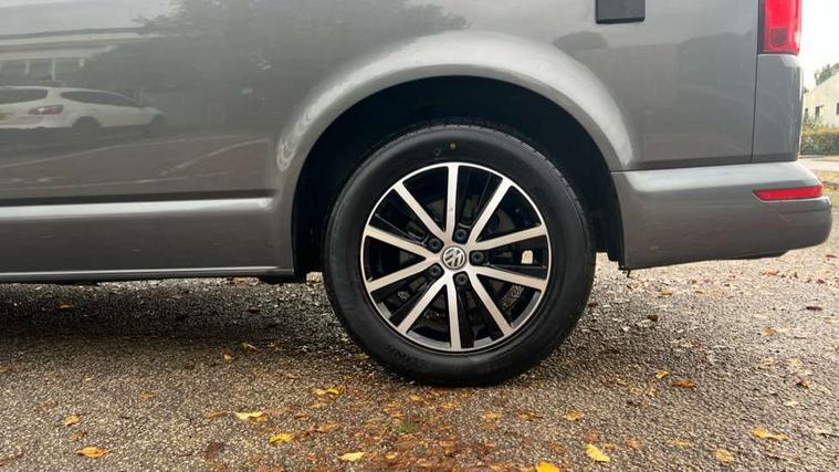 Bluetooth handsfree set, Coolant temperature indicator, Digital clock, External temperature gauge, Lockable tailgate, Multifunction display plus, Power steering (steering wheel adjustable in height and reach), Rev counter, Service interval indicator, Trip computer, Standard suspension, 6 speakers, Auxiliary input socket, USB interface, Body colour bumpers, Body colour door mirrors and handles, Body colour painted aluminium manually operated pop-up roof with two side windows in bellows and alpine Grey canvas, Body colour side mouldings, Glazed tailgate, Heat insulating glass in cab and load/passenger compartment, Heated rear windows with wash wipe, Intermittent windscreen wipers, Range adjustable headlights, Roof rails, Sliding window in front and fixed window in rear in load/passenger compartment on passengers side, 230V socket, Adjustable dashboard illumination, Armrest for driver and single front passenger seats, Camping table with two folding chairs, Driver + passenger lumbar support, Driver/front passenger seat height adjustment, Fresh air intake system with activated charcoal canister, Front door pockets with bottle holders, Front grab handles, Front seat backrest storage nets, Head restraints for all seats, Independent rear heating controls, Interior illuminated entry steps, Interior light, ISOFIX top tethers and lower anchor points, Jack and tool kit, Load restraint lashing eyes, Storage net on lower dash passenger side, Sunvisors with illuminated vanity mirrors, Swivelling front seats, Smokers pack - California, ABS/EBD, Brake assist function, Child proof door locks, Door open warning, Driver seatbelt warning indicator, Driver/Front Passenger airbags, Driver/front passenger seatbelt tensioners, EDL, ESP, Front side airbags with curtain airbags, Hill hold control, Passenger airbag deactivation system, Two tone horn, Tyre pressure warning, Warning triangle and first aid kit, Alarm with interior protection, Electronic immobiliser, Locking wheel nuts, Wheel covers,