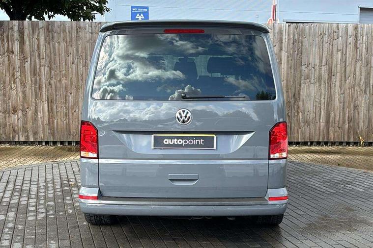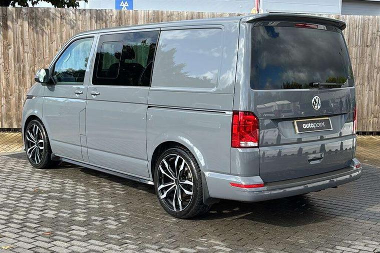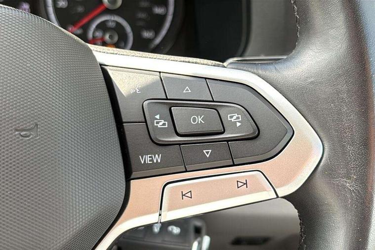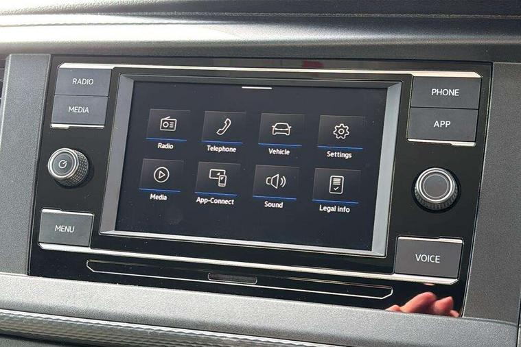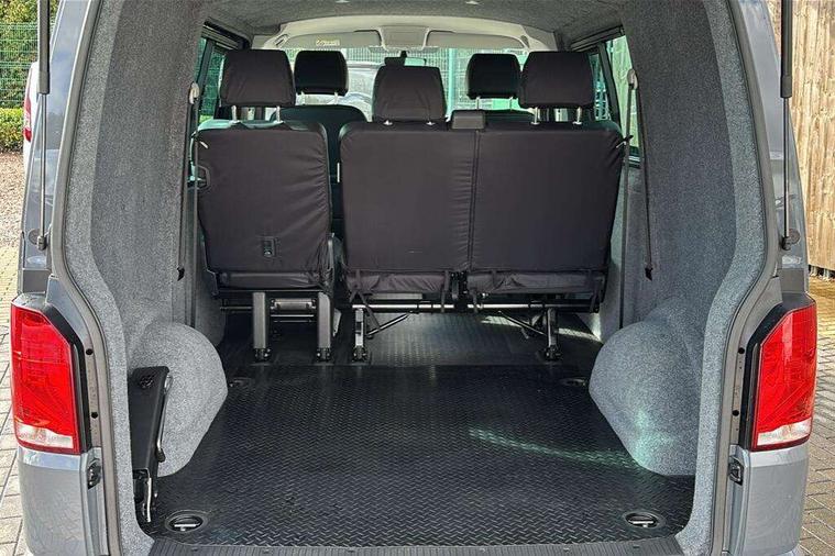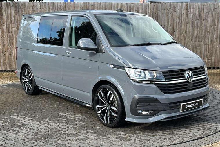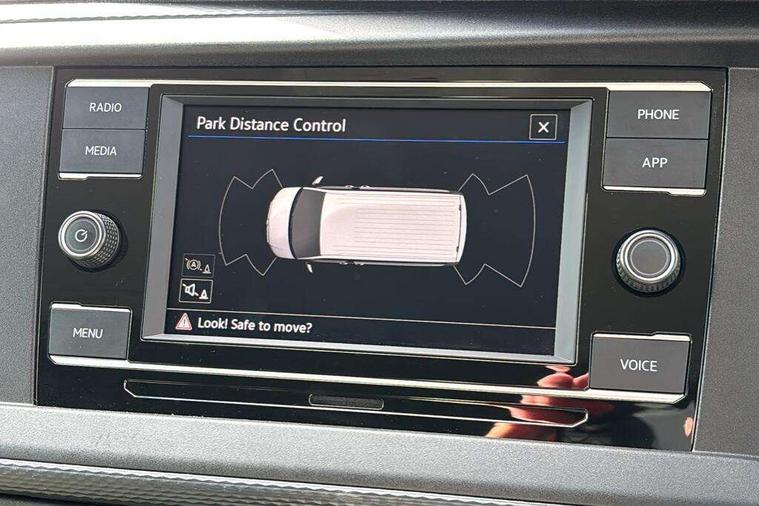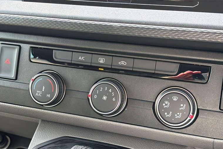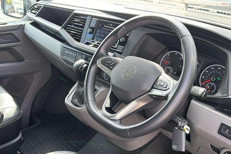 Adaptive cruise control, Child seat anchors ISOFIX and top tether in 2nd row of seats, Cross wind assist, Dimmable illuminated instruments, Driver alert with black and white multi function display plus, eCall emergency system, Electromechanical speed sensitive power steering, height and longitudinally adjustable steering column, Forward collision warning front assist with autonomous emergency braking, Headlight range control, Mobile phone interface, Without voice control, 2 USB interfaces type C in dashboard, 4 speakers with 2 tweeters and 2 woofers, Composition colour radio with 6.5" touchscreen, Digital radio reception (DAB+), Volkswagen app connect, Automatic headlight control, leaving home and manual coming home feature, Front fog lamps with cornering light, Green heat insulating glass, Heated front windscreen, Illuminated steps in passenger/load compartment, Left convex exterior mirror, Power folding adjustable door mirrors with separately heated, Privacy glass from the B-pillar and heat-insulating glass in front, Radiator grille with 2 chrome trims, Rear window with heated insulating glass, heated rear window wiper and washer system, Right convex exterior mirror, Tailgate closing with unlatching from the inside, Transporter nameplate on the rear fender, Windshield wiper intermittent control with rain sensor for windshield wipers, Without adhesive film, 3 spoke leather wrapped multi function steering wheel, Additional sound deadening measures in cab and passenger compartment, Auto dimming breakaway interior rear view mirror, Comfort headliner in cab, hardboard roof trim in passenger and load compartment, Dust/pollen filter, Folding grab handles and storage compartments on cab seats, reading light, Front seats on the right in 1st row of seat, Glove compartment with illumination, Heavy duty tool kit and jack, Interior plastic loading edge protection, Lashing rings for load restraint system, LED Interior lighting in load and passenger compartment, Medium height for vehicles with window aperture hardboard side trim panels in passenger/load compartment, Refrigerant R134a, Standard lower part dashboard in palladium, Without partition, Without seats in 3rd row of seats, Comfort pack - Transporter, Exterior pack without fog light- Transporter, Light and vision pack - Transporter, Non smoker pack - Transporter, 3 point height adjustable seat belts on outer seats cab with electric pretensioners, Driver and front passenger airbag with front passenger airbag deactivation, Power operated child safety lock, Warning buzzer and light for driver seat belt not fastened, Anti theft alarm system with interior monitoring in cab, backup horn and towing protection, Lockable wheel bolts, 16" chassis with 16" brake system, 70 L volume fuel tank, Diesel particulate filter, Electronic stability control, ABS, ASR with deactivation button, hill start assist and brake assist system, Speed limiter, Start/stop system with regenerative breaking, 16" Clayton alloy wheels, Wheel trims,