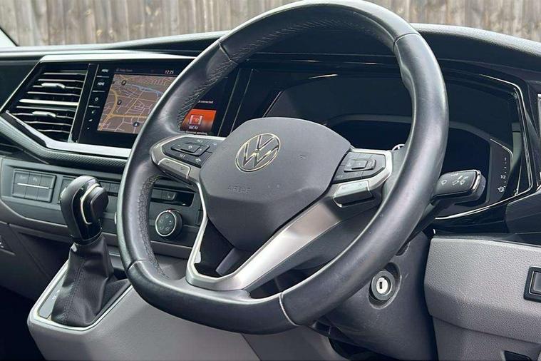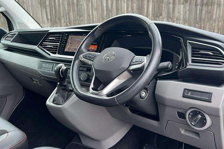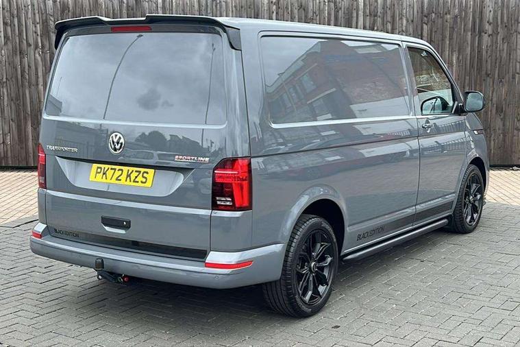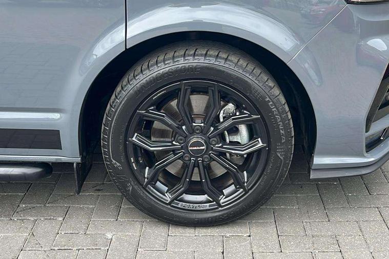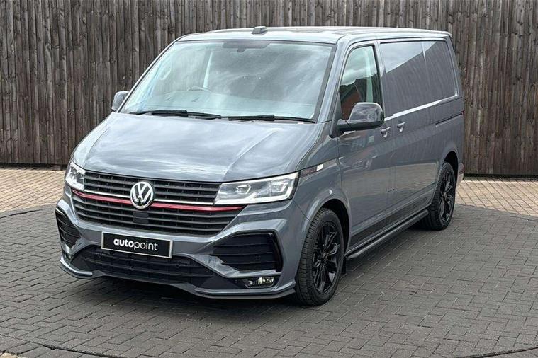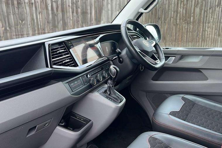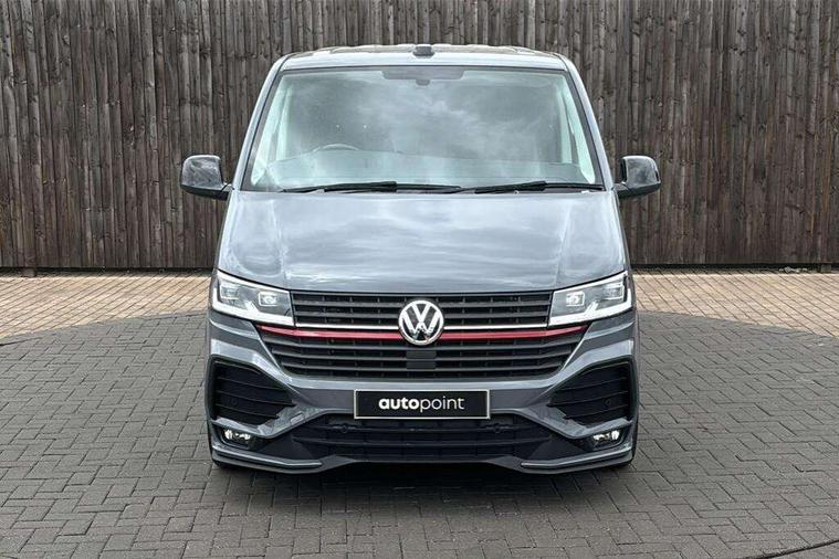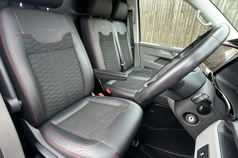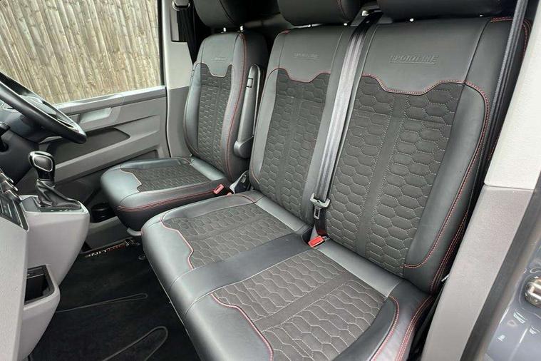 Adaptive cruise control, Cross wind assist, Digital cockpit, Dimmable dashboard ilumination, Driver alert system, eCall emergency system, Electromechanical steering, Front and rear parking sensors, Front assist including city emergency braking system, Multi function display plus with black and white display, Rear view camera, 4 speakers with 2 tweeters and 2 woofers, Digital radio reception (DAB+), Discover Media navigation system with 8.0" touch-screen including Streaming and Internet, Volkswagen app connect, Auto dimming interior rear view mirror, Automatic headlight control, leaving home and manual coming home feature, Body colour bumpers, Body coloured door handles, Enhanced front bumper including lower front diffuser, Front electric windows, Front fog lamps with cornering light, Gloss black wing mirrors, Heat insulating windows in cab, Heated laminated windshield, High beam assist, Illuminated chrome side bars, LED headlights with LED daytime running lights and LED tail lights, Power folding door mirrors, Power latching for passenger side sliding door, Power latching tailgate without windows, Rear tailgate spoiler, Sportline front wing and rear tailgate badging, Windshield wiper with intermittent control with rain sensor, 12V socket, Armrests for both front seats, Carpet floor covering in cab, Comfort dashboard, Dash panel with open stowage compartments, drink holders and lockable glovebox, Dust/pollen filter, Electronically controlled front air conditioning system and second heating system in passenger compartment, Entry handle on A-pillar on drivers and front passengers side, Folding grab handles on roof frame, Gloss black inserts in dashboard, Glove compartment with illumination, Half height side trim panels and roof trim panels made of hardboard, Heated driver and front passenger seats, Heavy duty tool kit and jack, High partition, Interior lighting with LED technology in load compartment, Interior styling and badging, Leather trimmed multi-function steering wheel with height and longitudinal adjustment, LED Interior lighting with two reading lights in the roof console, Nappa leather/alcantara upholstery with red contrast stitching, One waste bin in door storage compartment, Reinforced Folding lashing rings for load restraint system, Sportline carpet mats, Sun visors with mirror and airbag label on front passenger sun visor, Driver and front passenger airbag with front passenger airbag deactivation, Single tone horn, 2 remote control folding keys, Anti theft alarm system with interior monitoring in cab, backup horn and towing protection, Engine immobiliser, Lockable wheel bolts, Additional 12V socket, Automatic post collision braking system, Diesel particulate filter, Eibach 30mm lowering springs, Electronic stability control, ABS, ASR with deactivation button, electronic differnetial lock, hill start assist and brake assist system, Start/stop system with regenerative breaking, Dashboard upper in Titanium Black, dashboard lower in Palladium and floor covering in Titanium Black, 18" Sportline Gloss black alloy wheels, Tyre mobility kit in lieu of spare wheel with 12 volt compressor and tyre sealant,