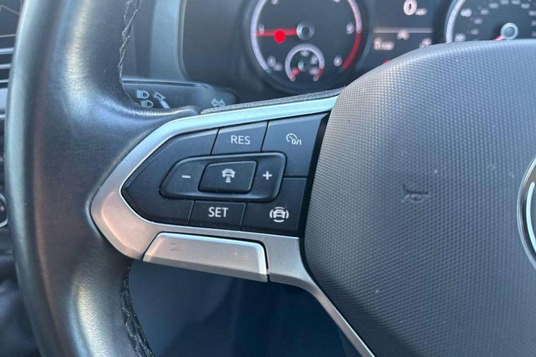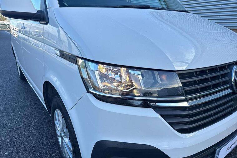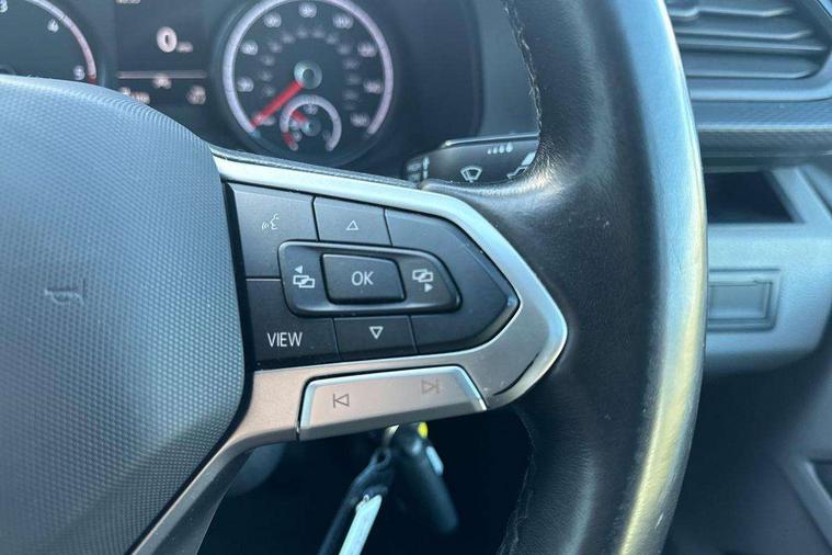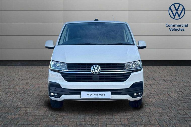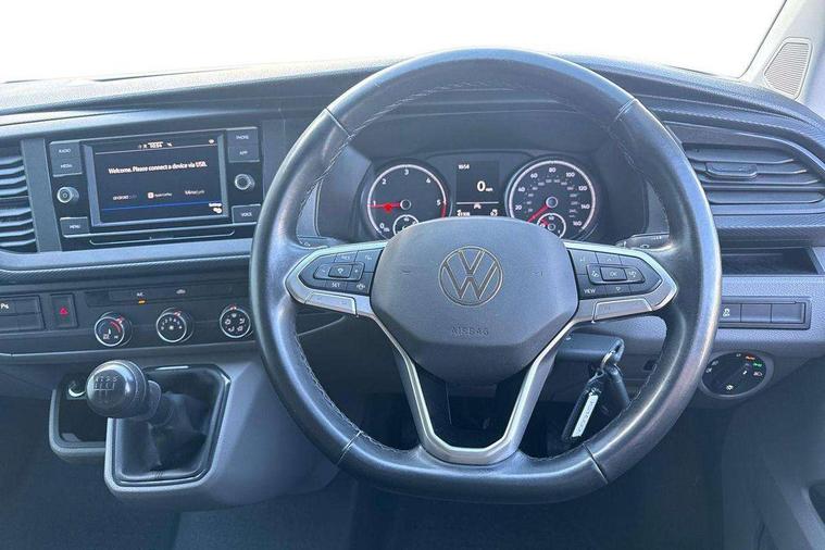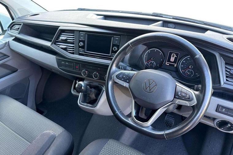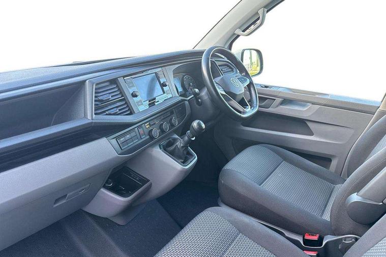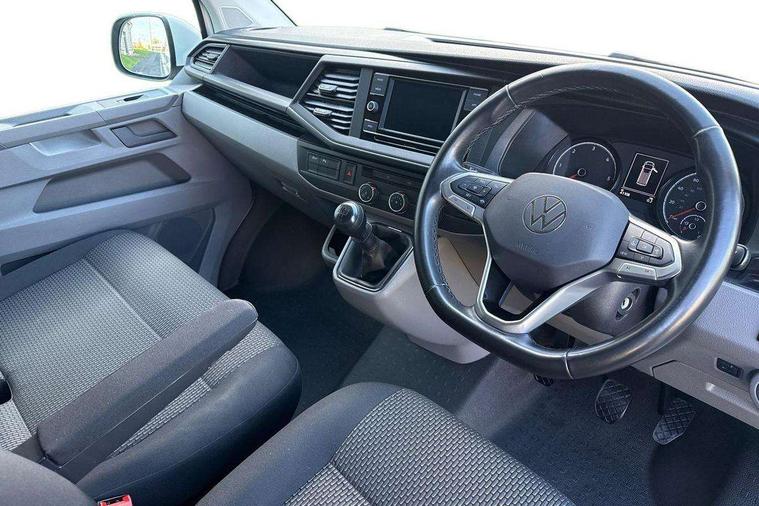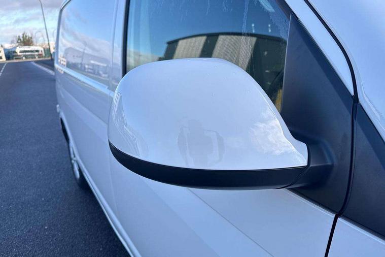 Adaptive cruise control, Cross wind assist, Dimmable illuminated instruments, Driver alert with Multi-function display plus, eCall emergency system, Forward collision warning front assist with autonomous emergency braking, Mobile phone interface, Multi function display plus with black and white display, 2 USB interfaces type C in dashboard, 4 speakers with 2 tweeters and 2 woofers, Composition colour radio with 6.5" touchscreen, Digital radio reception (DAB+), Volkswagen app connect, Automatic headlight control, leaving home and manual coming home feature, Closing rear wing door with unlatching from the inside, Front fog lamps with cornering light, Heat insulating glass (green) in cab and passenger/load compartment, Heated front windscreen, Left convex exterior mirror, Power folding adjustable door mirrors with separately heated, Radiator grille with 2 chrome trims, Rear wing doors without window apertures, Right convex exterior mirror, Transporter nameplate on the rear fender, Windshield wiper intermittent control with rain sensor for windshield wipers, 3 spoke leather wrapped multi function steering wheel, Auto dimming breakaway interior rear view mirror, Comfort headliner in cab, hardboard roof trim in passenger and load compartment, Dust/pollen filter, Front and rear left without window closed side panel in load compartment, Front seats on the right in 1st row of seat, Glove compartment with illumination, Heavy duty tool kit and jack, High partition, Interior plastic loading edge protection, LED Interior lighting in load and passenger compartment, Manual adjustable lumbar support for right single seat in 1st row seats, Refrigerant R134a, Standard lower part dashboard in palladium, Storage compartments on cab seats and reading light, Without right side window apertures in passenger and load compartment, Comfort pack - Transporter, Exterior pack without fog light- Transporter, Non smoker pack - Transporter, 3 point height adjustable seat belts on outer seats cab with electric pretensioners, Driver and front passenger airbag with front passenger airbag deactivation, Warning buzzer and light for driver and front passenger seat belt not fastened, Without child safety lock in passenger compartment, Anti theft alarm system with interior monitoring in cab, backup horn and towing protection, Lockable wheel bolts, 16" chassis with 16" brake system, Diesel particulate filter, Electronic stability control, ABS, ASR with deactivation button, hill start assist and brake assist system, Start/stop system with regenerative breaking, 16" Clayton alloy wheels,