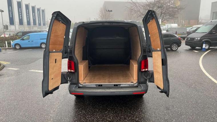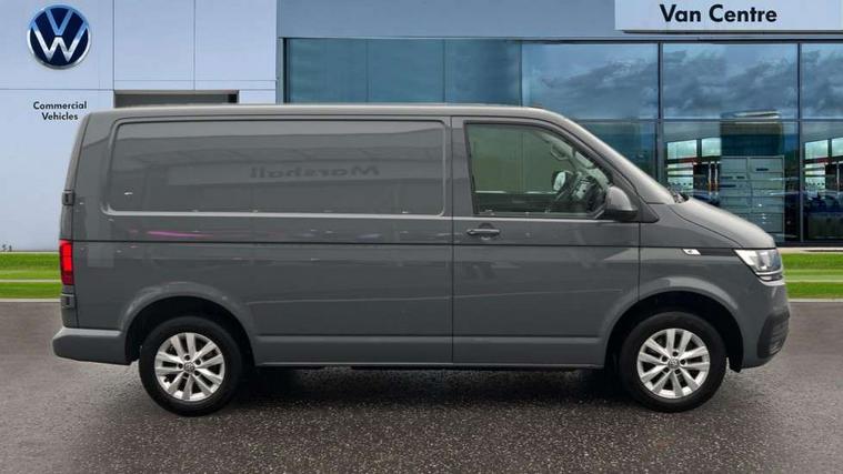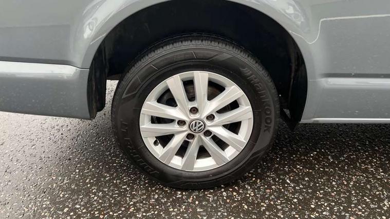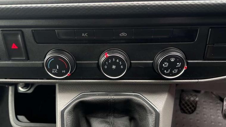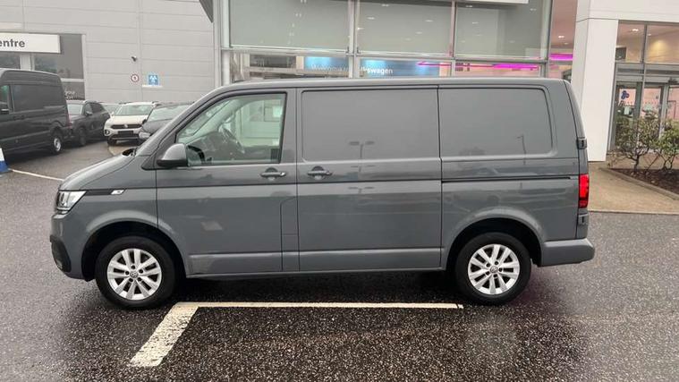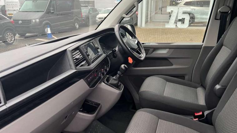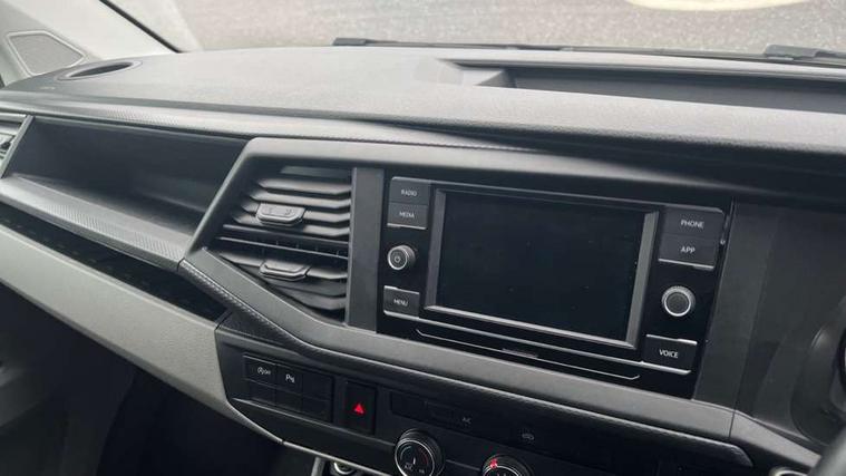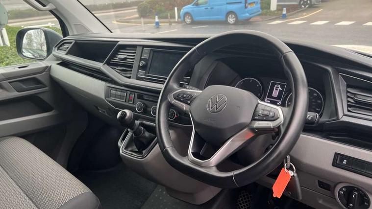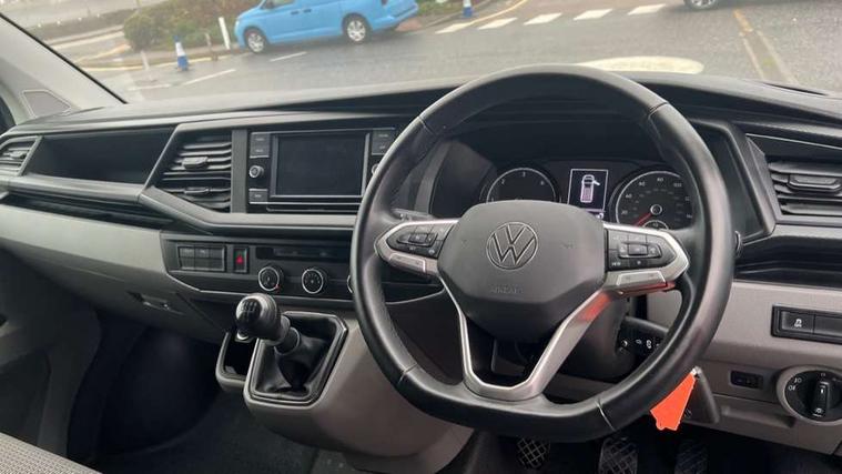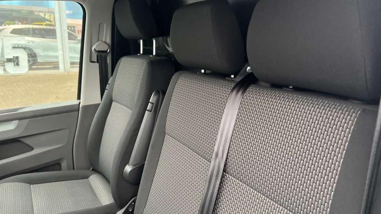 Adaptive cruise control, Cross wind assist, Dimmable illuminated instruments, Driver alert with Multi-function display plus, eCall emergency system, Forward collision warning front assist with autonomous emergency braking, Mobile phone interface, Multi function display plus with black and white display, 2 USB interfaces type C in dashboard, 4 speakers with 2 tweeters and 2 woofers, Composition colour radio with 6.5" touchscreen, Digital radio reception (DAB+), Volkswagen app connect, Automatic headlight control, leaving home and manual coming home feature, Closing rear wing door with unlatching from the inside, Front fog lamps with cornering light, Heat insulating glass (green) in cab and passenger/load compartment, Heated front windscreen, Left convex exterior mirror, Power folding adjustable door mirrors with separately heated, Radiator grille with 2 chrome trims, Rear wing doors without window apertures, Right convex exterior mirror, Transporter nameplate on the rear fender, Windshield wiper intermittent control with rain sensor for windshield wipers, 3 spoke leather wrapped multi function steering wheel, Auto dimming breakaway interior rear view mirror, Comfort headliner in cab, hardboard roof trim in passenger and load compartment, Dust/pollen filter, Front and rear left without window closed side panel in load compartment, Front seats on the right in 1st row of seat, Glove compartment with illumination, Heavy duty tool kit and jack, High partition, Interior plastic loading edge protection, LED Interior lighting in load and passenger compartment, Manual adjustable lumbar support for right single seat in 1st row seats, Refrigerant R134a, Standard lower part dashboard in palladium, Storage compartments on cab seats and reading light, Without right side window apertures in passenger and load compartment, Comfort pack - Transporter, Exterior pack without fog light- Transporter, Non smoker pack - Transporter, 3 point height adjustable seat belts on outer seats cab with electric pretensioners, Driver and front passenger airbag with front passenger airbag deactivation, Warning buzzer and light for driver and front passenger seat belt not fastened, Without child safety lock in passenger compartment, Anti theft alarm system with interior monitoring in cab, backup horn and towing protection, Lockable wheel bolts, 16" chassis with 16" brake system, Diesel particulate filter, Electronic stability control, ABS, ASR with deactivation button, hill start assist and brake assist system, Start/stop system with regenerative breaking, 16" Clayton alloy wheels,