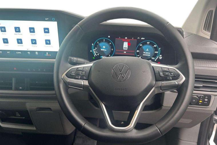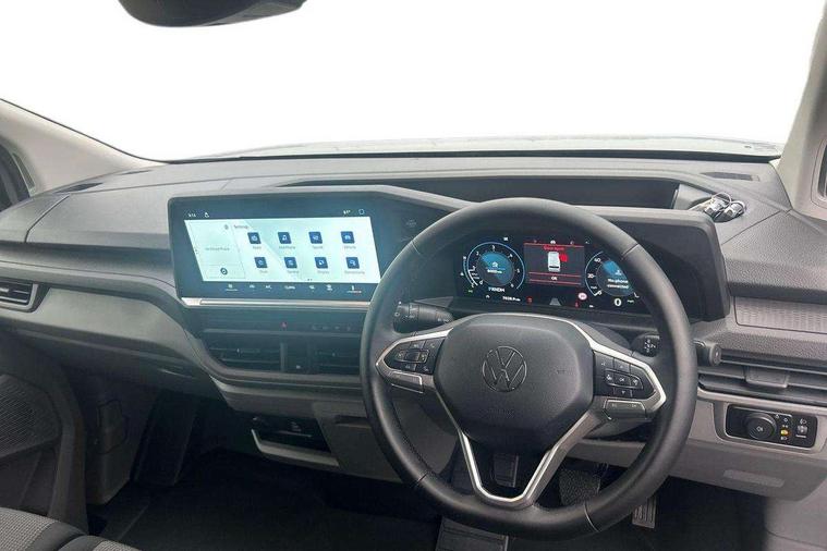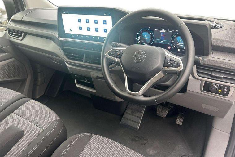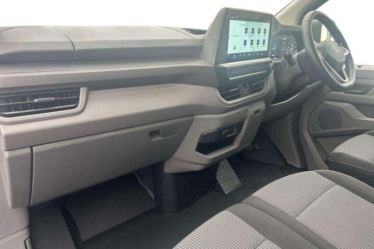 12" digital drivers display, 13" touchscreen infotainment display with wireless app connect and DAB radio, 5G Modem, Apple CarPlay and Android Auto, Cruise control, Dynamic road sign display, eCall emergency system, Electromechanical speed sensitive power steering, height and longitudinally adjustable steering column, Lane assist, Preparation of VW connect and connect plus, Wrong way driver warning, 4 speakers - 2x dashboard, 2x cab doors, Body coloured door handles, Heat reflecting side window glass, Mud flaps front and rear, Rear Transporter nameplate in black grained decorative trim, Vehicle opening configuration 1x 1st row of seats, 2x all doors, 2x 15-W USB data/charging ports in dashboard and 1x USB-C, 1x USB-A center bottom, 2x LED lights in load compartment, 3 spoke leather wrapped multi function steering wheel, 4 way height and tilt adjustable head restraints, Black plastic scuff plate for sliding door in cargo without illumination, Cabin interior lighting, Gear selector lever on steering wheel, Lashing rings for reinforced floor covering, Narrow centre console with cup holder and compartment for mobile phone, Overhead storage compartment, Roof grab handle on front passenger side, Rubber floor covering in cab, Striped fabric upholstery, Without passenger seats in load compartment, Driver and front passenger airbag with front passenger airbag deactivation, Dual tone horn, Front and curtain airbags for driver and front passenger, Seat belt pretensioner for driver seat, Anti theft alarm system with interior monitoring in cab, backup horn and towing protection, Electronic immobiliser, Preparation for alcohol ignition interlock, 5+ Promise, Alternator - 230A, Electronic stability control, ABS, ASR with deactivation button, hill start assist and brake assist system,