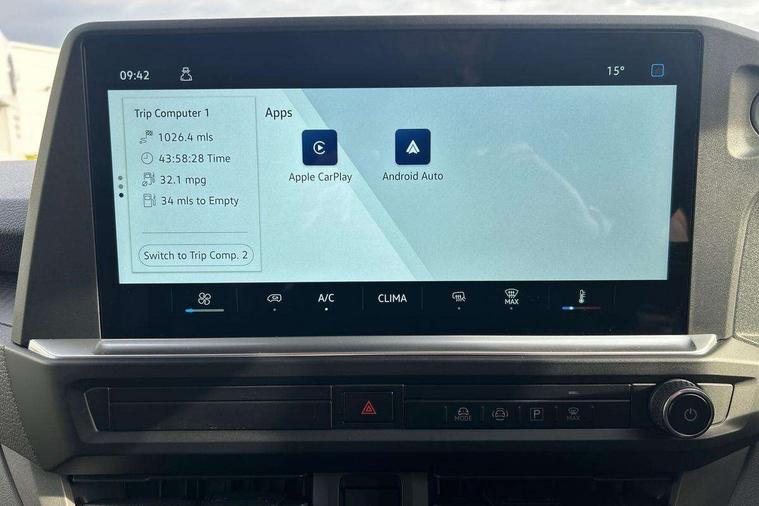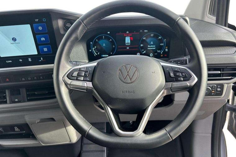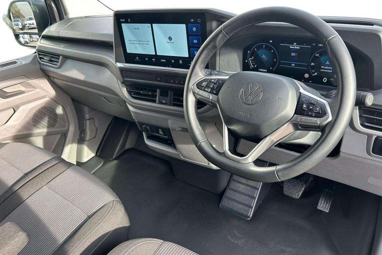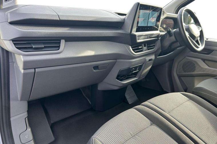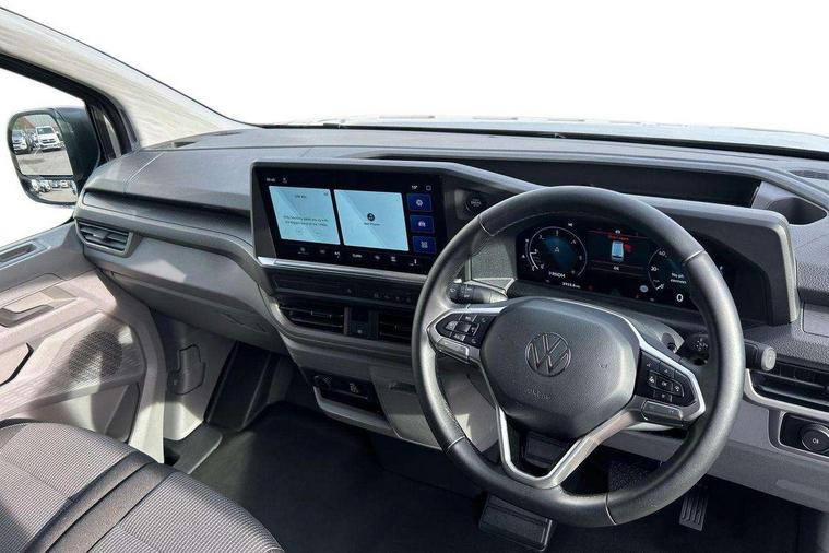 12" digital drivers display, 13" touchscreen infotainment display with wireless app connect and DAB radio, 5G Modem, Apple CarPlay and Android Auto, Cruise control, Dynamic road sign display, eCall emergency system, Electromechanical speed sensitive power steering, height and longitudinally adjustable steering column, Lane assist, Preparation of VW connect and connect plus, Wrong way driver warning, 4 speakers - 2x dashboard, 2x cab doors, Body coloured door handles, Heat reflecting side window glass, Mud flaps front and rear, Rear Transporter nameplate in black grained decorative trim, Vehicle opening configuration 1x 1st row of seats, 2x all doors, 2x 15-W USB data/charging ports in dashboard and 1x USB-C, 1x USB-A center bottom, 2x LED lights in load compartment, 3 spoke leather wrapped multi function steering wheel, 4 way height and tilt adjustable head restraints, Black plastic scuff plate for sliding door in cargo without illumination, Cabin interior lighting, Gear selector lever on steering wheel, Lashing rings for reinforced floor covering, Narrow centre console with cup holder and compartment for mobile phone, Overhead storage compartment, Roof grab handle on front passenger side, Rubber floor covering in cab, Striped fabric upholstery, Without passenger seats in load compartment, Driver and front passenger airbag with front passenger airbag deactivation, Dual tone horn, Front and curtain airbags for driver and front passenger, Seat belt pretensioner for driver seat, Anti theft alarm system with interior monitoring in cab, backup horn and towing protection, Electronic immobiliser, Preparation for alcohol ignition interlock, 5+ Promise, Alternator - 230A, Electronic stability control, ABS, ASR with deactivation button, hill start assist and brake assist system,