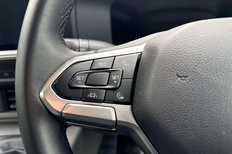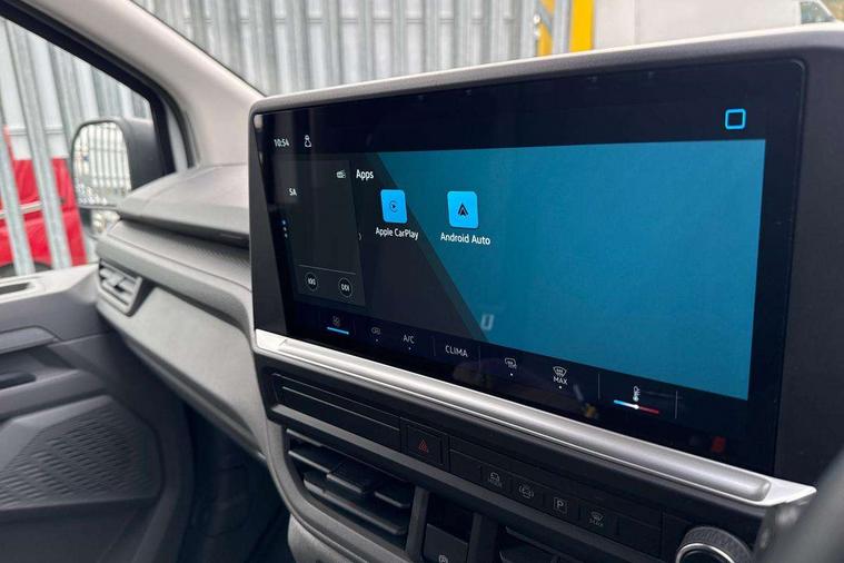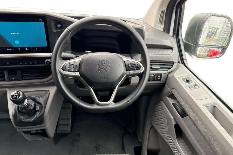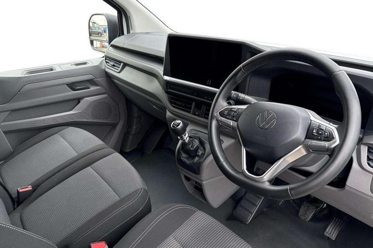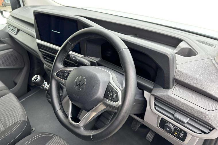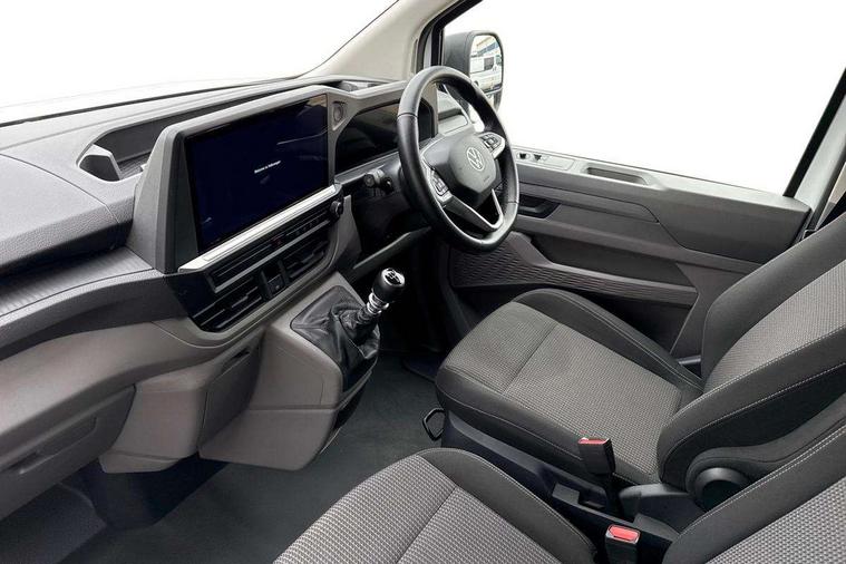12" digital drivers display, 13" touchscreen infotainment display with wireless app connect and DAB radio, 5G Modem, Apple CarPlay and Android Auto, Cruise control, Dynamic road sign display, eCall emergency system, Electromechanical speed sensitive power steering, height and longitudinally adjustable steering column, Lane assist, Preparation of VW connect and connect plus, Wrong way driver warning, 4 speakers - 2x dashboard, 2x cab doors, Body coloured door handles, Heat reflecting side window glass, Mud flaps front and rear, Rear Transporter nameplate in black grained decorative trim, Vehicle opening configuration 1x 1st row of seats, 2x all doors, 2x 15-W USB data/charging ports in dashboard and 1x USB-C, 1x USB-A center bottom, 2x LED lights in load compartment, 3 spoke leather wrapped multi function steering wheel, 4 way height and tilt adjustable head restraints, Black plastic scuff plate for sliding door in cargo without illumination, Cabin interior lighting, Lashing rings for reinforced floor covering, Leatherette gear lever, Narrow centre console with cup holder and compartment for mobile phone, Overhead storage compartment, Roof grab handle on front passenger side, Rubber floor covering in cab, Striped fabric upholstery, Without passenger seats in load compartment, Driver and front passenger airbag with front passenger airbag deactivation, Dual tone horn, Front and curtain airbags for driver and front passenger, Seat belt pretensioner for driver seat, Anti theft alarm system with interior monitoring in cab, backup horn and towing protection, Electronic immobiliser, Preparation for alcohol ignition interlock, 5+ Promise, Alternator - 230A, Electronic stability control, ABS, ASR with deactivation button, hill start assist and brake assist system,