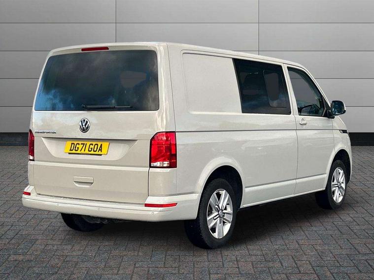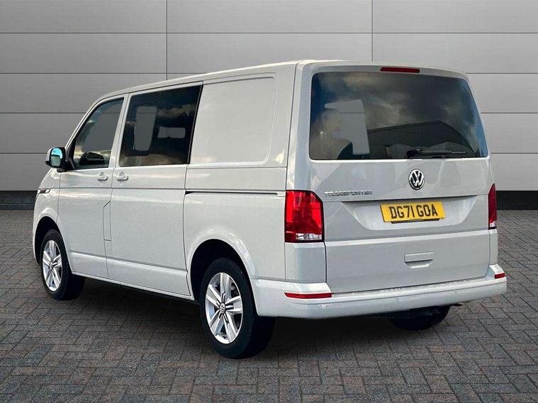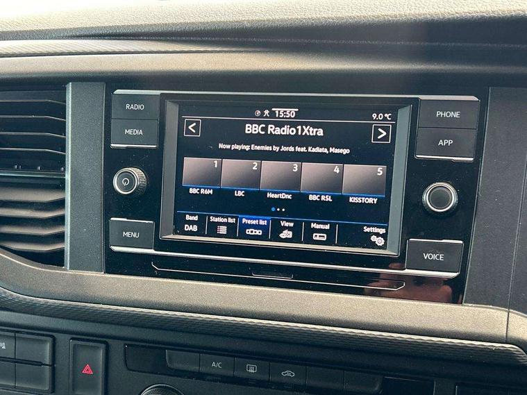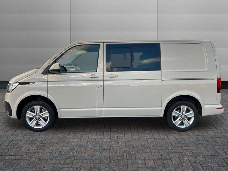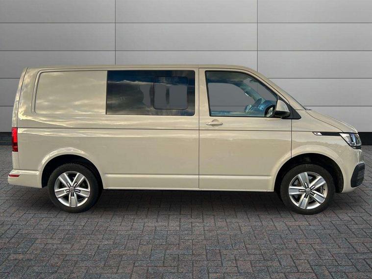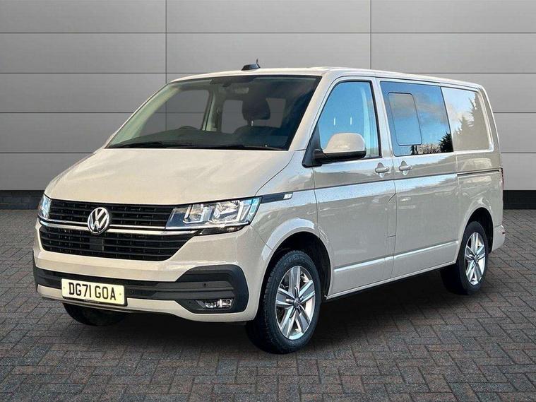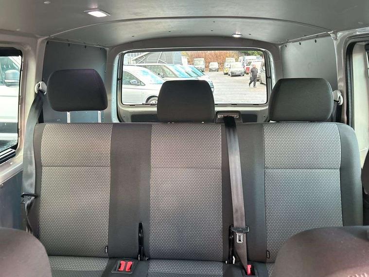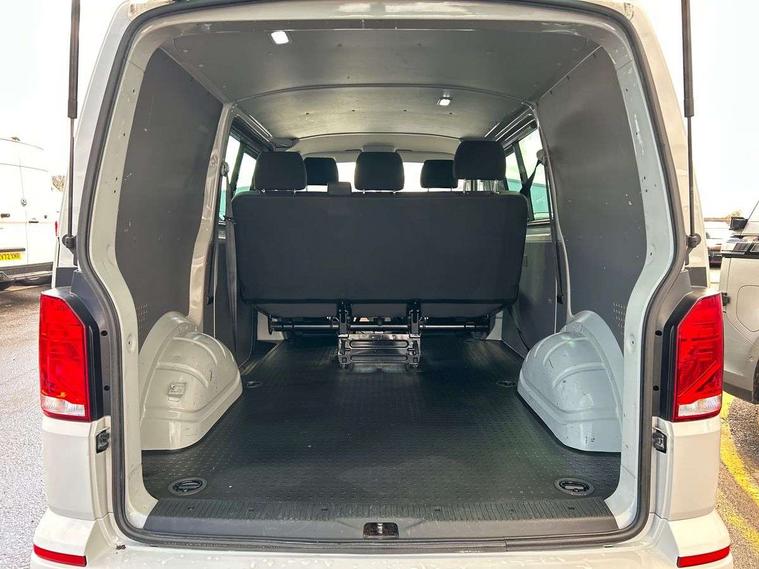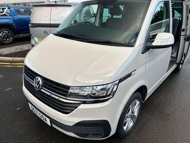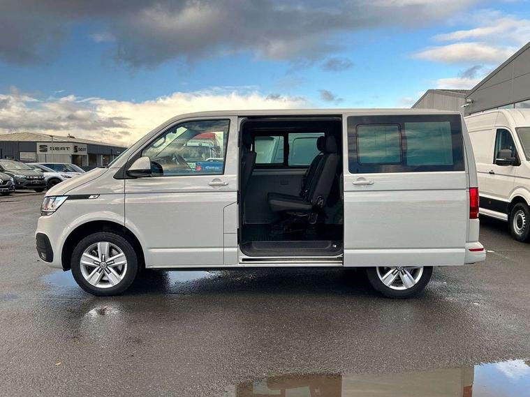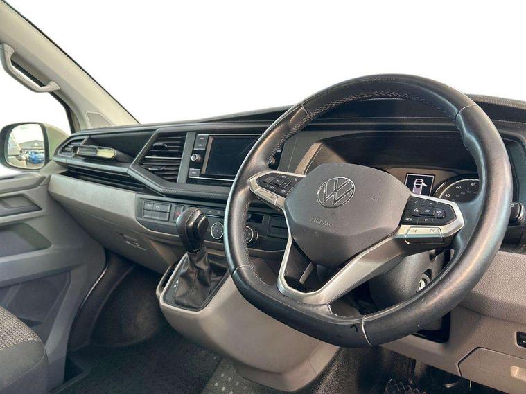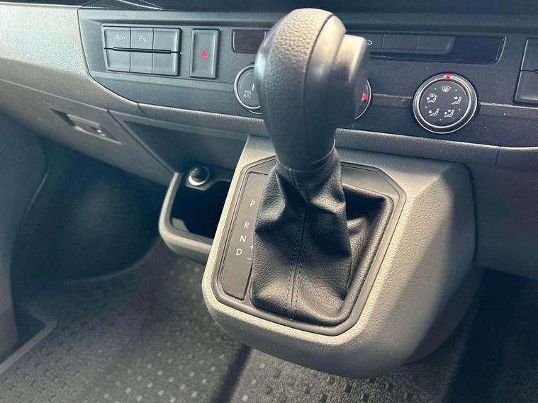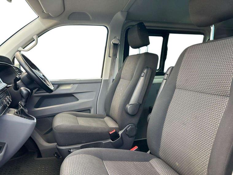 Adaptive cruise control, Child seat anchors ISOFIX and top tether in 2nd row of seats, Cross wind assist, Dimmable illuminated instruments, Driver alert with black and white multi function display plus, eCall emergency system, Electromechanical speed sensitive power steering, height and longitudinally adjustable steering column, Forward collision warning front assist with autonomous emergency braking, Headlight range control, Mobile phone interface, Without voice control, 2 USB interfaces type C in dashboard, 4 speakers with 2 tweeters and 2 woofers, Composition colour radio with 6.5" touchscreen, Digital radio reception (DAB+), Volkswagen app connect, Automatic headlight control, leaving home and manual coming home feature, Front fog lamps with cornering light, Green heat insulating glass, Heated front windscreen, Illuminated steps in passenger/load compartment, Left convex exterior mirror, Power adjustable and heated exterior mirrors, Power folding door mirrors, Privacy glass in passenger compartment, Radiator grille with 2 chrome trims, Rear window with heated insulating glass, heated rear window wiper and washer system, Right convex exterior mirror, Tailgate closing with unlatching from the inside, Tailgate with window aperture, Transporter nameplate on the rear fender, Windshield wiper intermittent control with rain sensor for windshield wipers, Without adhesive film, 3 spoke leather wrapped multi function steering wheel, Additional sound deadening measures in cab and passenger compartment, Auto dimming breakaway interior rear view mirror, Comfort headliner in cab, hardboard roof trim in passenger and load compartment, Dust/pollen filter, Folding grab handles and storage compartments on cab seats, reading light, Front seats on the right in 1st row of seat, Glove compartment with illumination, Heavy duty tool kit and jack, Interior plastic loading edge protection, Lashing rings for load restraint system, LED Interior lighting in load and passenger compartment, Medium height for vehicles with window aperture hardboard side trim panels in passenger/load compartment, Refrigerant R134a, Rubber floor covering in cab, Rubber floor covering in passenger/load compartment with loading edge protection in rear, Standard lower part dashboard in palladium, Without partition, Without seats in 3rd row of seats, Exterior pack without fog light- Transporter, Non smoker pack - Transporter, 3 point height adjustable seat belts on outer seats cab with electric pretensioners, Driver and front passenger airbag with front passenger airbag deactivation, Power operated child safety lock, Single tone horn, Warning buzzer and light for driver seat belt not fastened, Anti theft alarm system with interior monitoring in cab, backup horn and towing protection, Lockable wheel bolts, 16" chassis with 16" brake system, 70 L volume fuel tank, Additional 12V socket, Diesel particulate filter, Electronic stability control, ABS, ASR with deactivation button, hill start assist and brake assist system, Speed limiter, Start/stop system with regenerative breaking, 17" Devonport silver alloy wheels, Wheel trims,