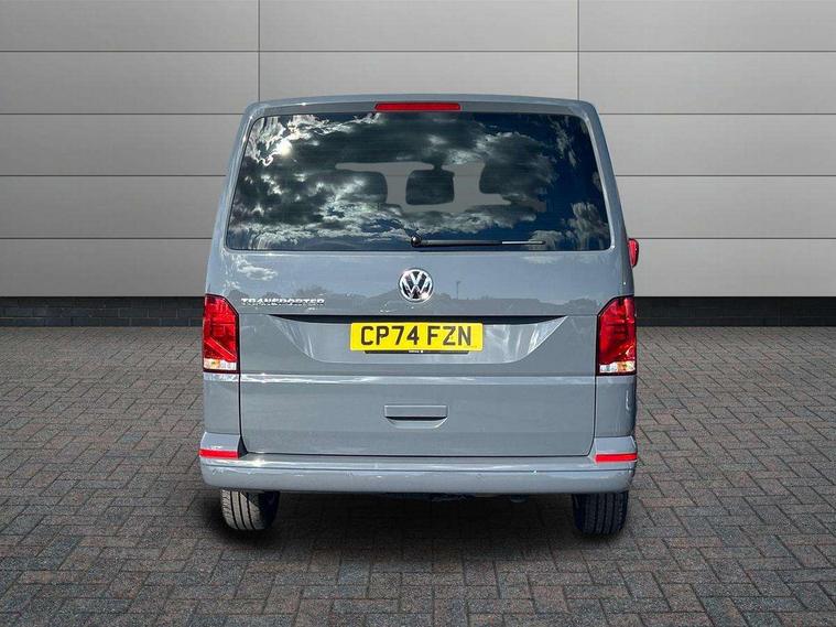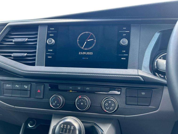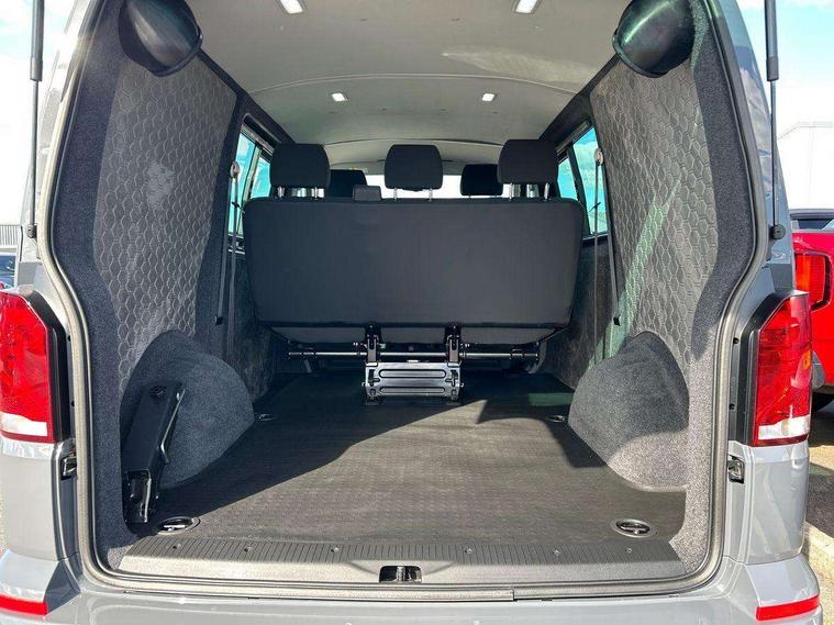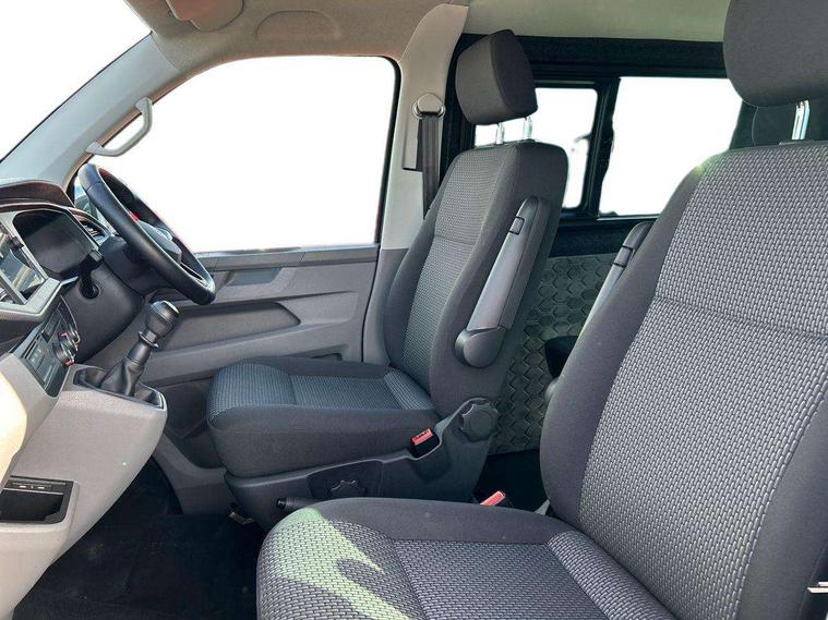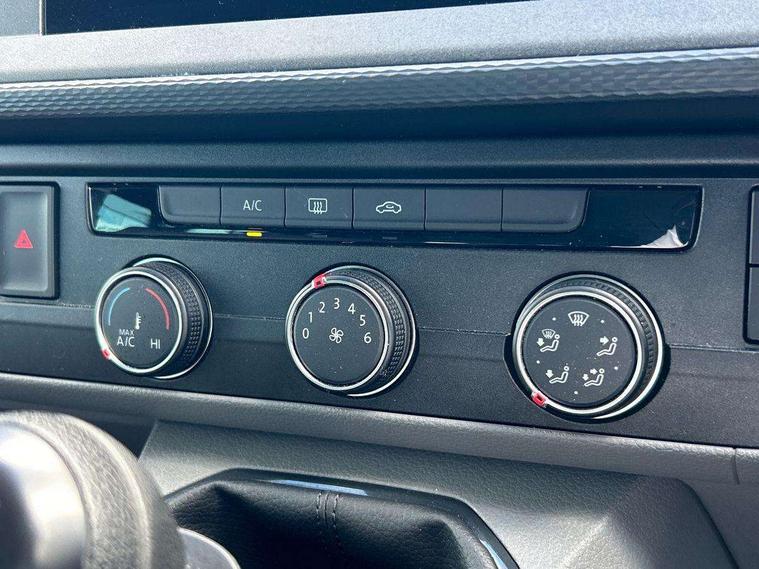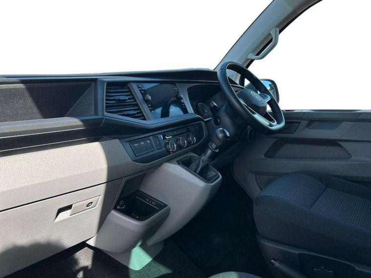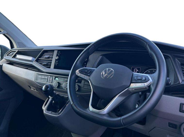 Adaptive cruise control, Child seat anchors ISOFIX and top tether in 2nd row of seats, Cross wind assist, Dimmable illuminated instruments, Driver alert with black and white multi function display plus, eCall emergency system, Forward collision warning front assist with autonomous emergency braking, Headlight range control, Mobile phone interface, Without voice control, 2 USB interfaces type C in dashboard, 4 speakers with 2 tweeters and 2 woofers, Composition colour radio with 6.5" touchscreen, Digital radio reception (DAB+), Volkswagen app connect, Automatic headlight control, leaving home and manual coming home feature, Front fog lamps with cornering light, Green heat insulating glass, Heated front windscreen, Illuminated steps in passenger/load compartment, Left convex exterior mirror, Power folding adjustable door mirrors with separately heated, Privacy glass from the B-pillar and heat-insulating glass in front, Radiator grille with 2 chrome trims, Rear window with heated insulating glass, heated rear window wiper and washer system, Right convex exterior mirror, Tailgate closing with unlatching from the inside, Transporter nameplate on the rear fender, Windshield wiper intermittent control with rain sensor for windshield wipers, Without adhesive film, 3 spoke leather wrapped multi function steering wheel, Additional sound deadening measures in cab and passenger compartment, Auto dimming breakaway interior rear view mirror, Comfort headliner in cab, hardboard roof trim in passenger and load compartment, Dust/pollen filter, Folding grab handles and storage compartments on cab seats, reading light, Front seats on the right in 1st row of seat, Glove compartment with illumination, Heavy duty tool kit and jack, Interior plastic loading edge protection, Lashing rings for load restraint system, LED Interior lighting in load and passenger compartment, Manual height adjustable and lumbar support for driver and single passenger seats, Medium height for vehicles with window aperture hardboard side trim panels in passenger/load compartment, Refrigerant R134a, Standard lower part dashboard in palladium, Without partition, Without seats in 3rd row of seats, Comfort pack - Transporter, Exterior pack without fog light- Transporter, Light and vision pack - Transporter, Non smoker pack - Transporter, 3 point height adjustable seat belts on outer seats cab with electric pretensioners, Driver and front passenger airbag with front passenger airbag deactivation, Power operated child safety lock, Warning buzzer and light for driver seat belt not fastened, Anti theft alarm system with interior monitoring in cab, backup horn and towing protection, Lockable wheel bolts, 16" chassis with 16" brake system, Additional 12V socket, Diesel particulate filter, Electronic stability control, ABS, ASR with deactivation button, hill start assist and brake assist system, Speed limiter, Start/stop system with regenerative breaking, 16" Clayton alloy wheels, Wheel trims,
