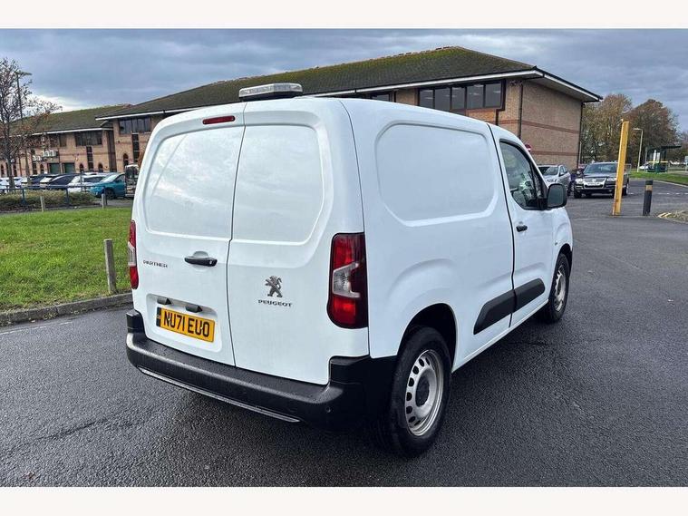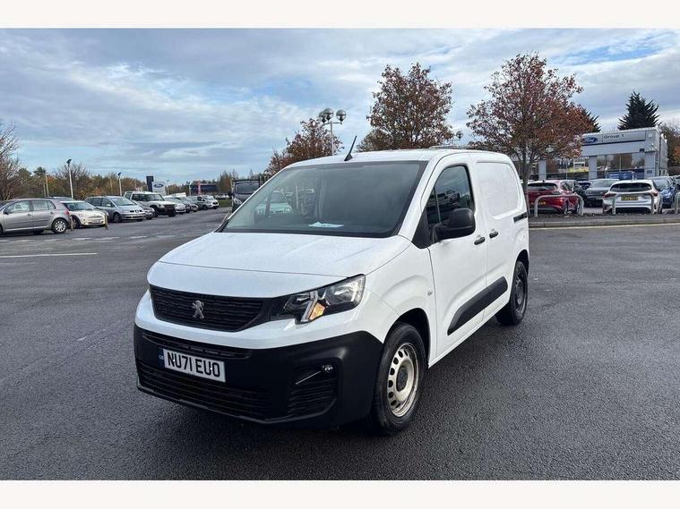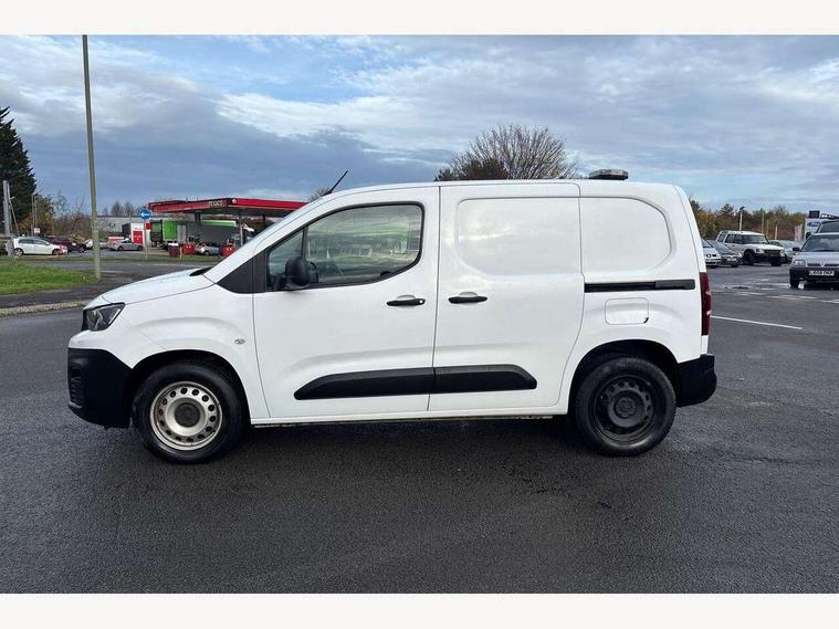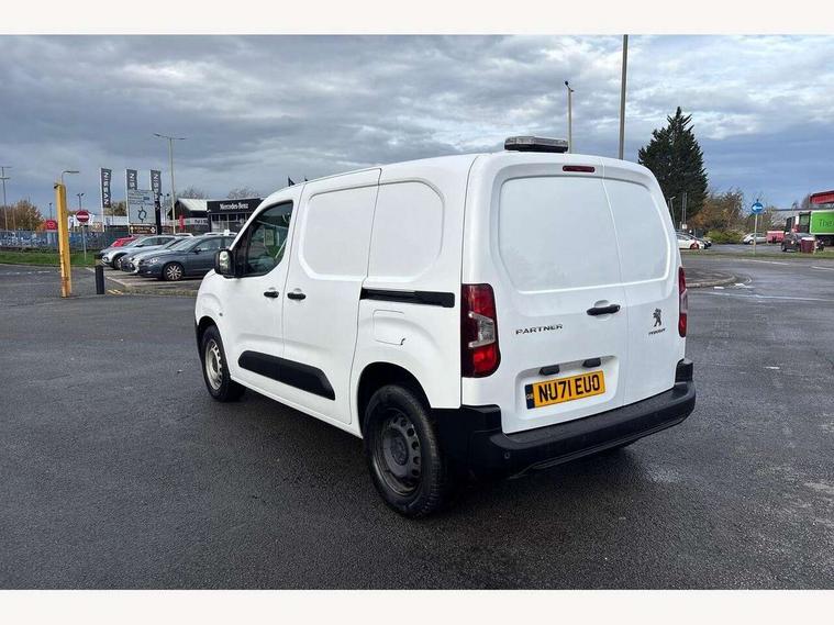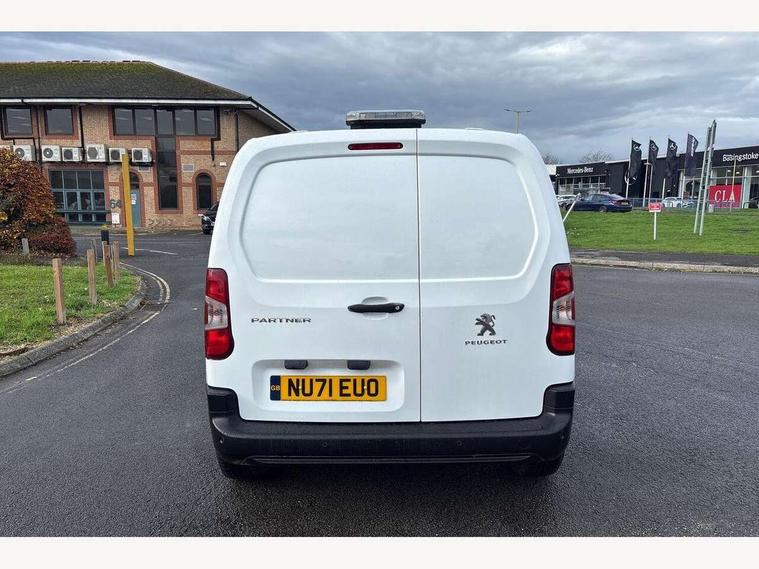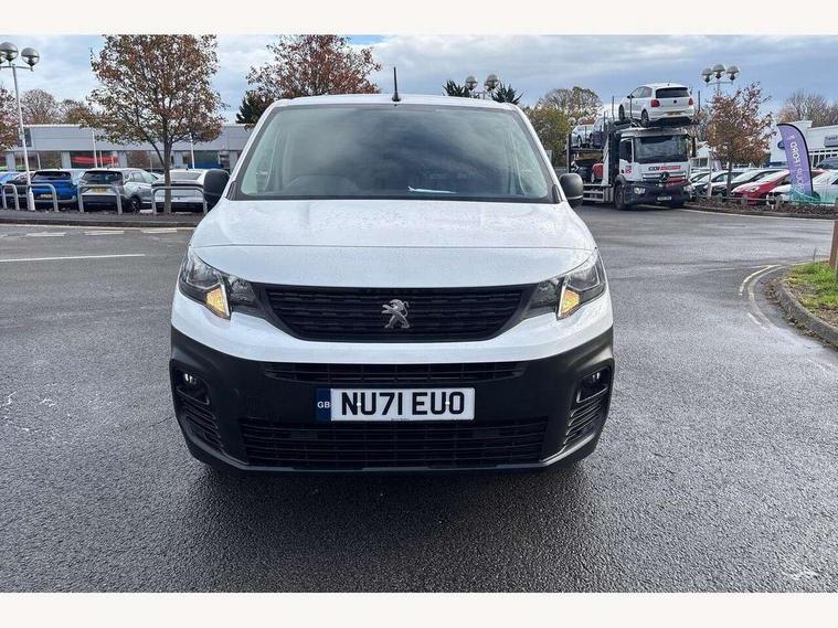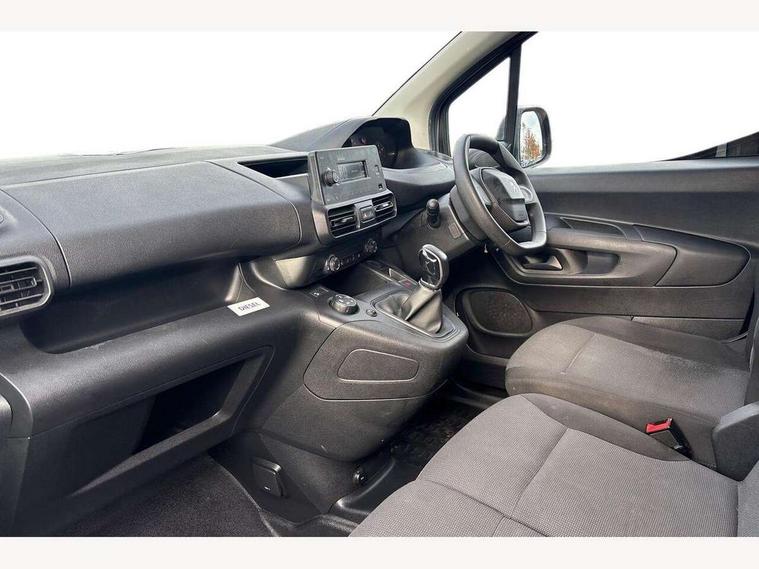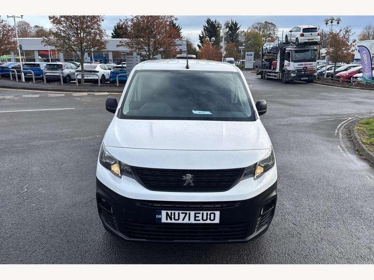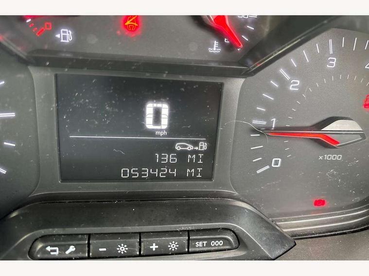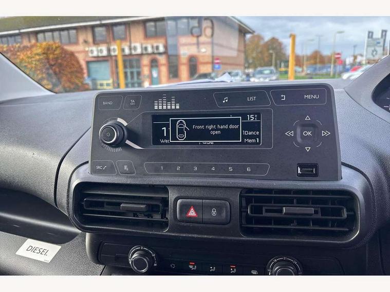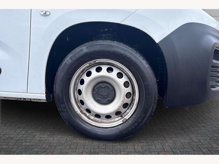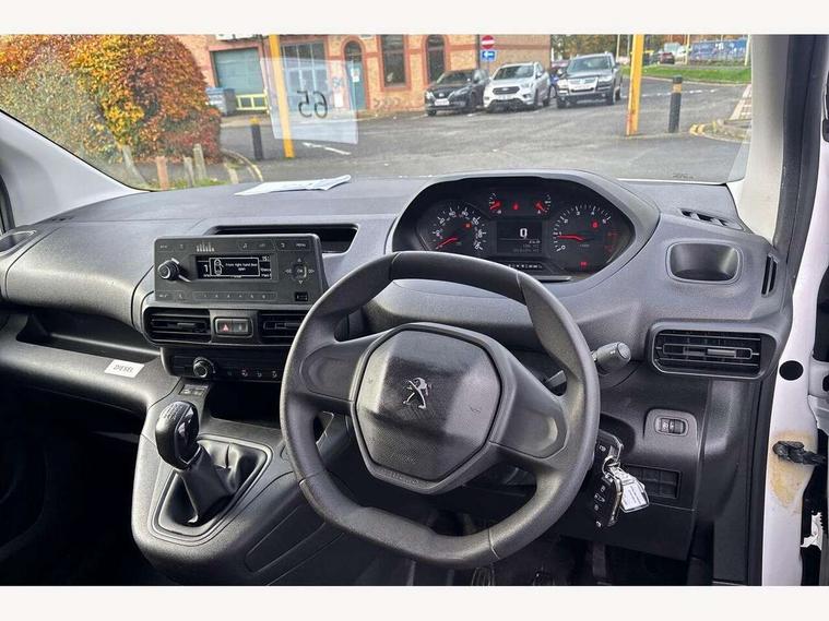 Electric power assisted steering with height and reach adjustable steering wheel, Lockable fuel cap, Multi-function on-board trip computer, Overload indicator, Peugeot connect with SOS assistance, Peugeot i-Cockpit with head up display and compact steering wheel, Rev counter with maintenance and gear efficiency indicators (GEI), Tyre pressure monitor, Electric front windows with one touch operation, Electrically adjustable door mirrors, Front fog lights, Height adjustable halogen headlights with automatic illumination and integrated daytime running lights (DRLs), High level third brake light, Manually folding door mirrors, Nearside side sliding door, Side protection rubbing strips, Two speed intermittent front wipers, Visible VIN at windscreen base, 12 volt socket in dashboard, 6 floor mounted load securing rings, 6 way adjustable driver seat with lumbar support and under seat storage, Cup holders for driver and passenger on either side of the dashboard, Curitiba cloth upholstery, Front door pockets with 1.5L bottle holder, Hard plastic floor protection in cabin, Multiflex modular folding passenger bench seat with pivoting writing table, storage under central seat, load through hatch and load protection cover, Overhead storage shelf in cabin, Upper glove box storage compartment, Loading pack - Partner, Worksite pack - Partner, Automatic activation of hazard warning lights on major deceleration, Door opening warning and audible lights on warning, Driver and passenger seatbelt unfastened warning, Driver's airbag, Dashboard mounted central locking push button and auto locking above 7mph, Manual door lock for front passenger door, Remote central locking with deadlocking, selective cab and load area locking via 3 button plip remote control key, Thatcham approved rolling code transponder immobiliser, Automatic electronic parking brake, Electronic Stability Control and ABS with hill start assist, EBA and EBFD, 16" steel wheels with black centre cap, Full size steel spare wheel,