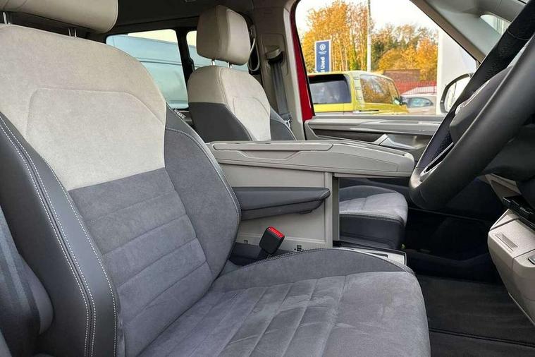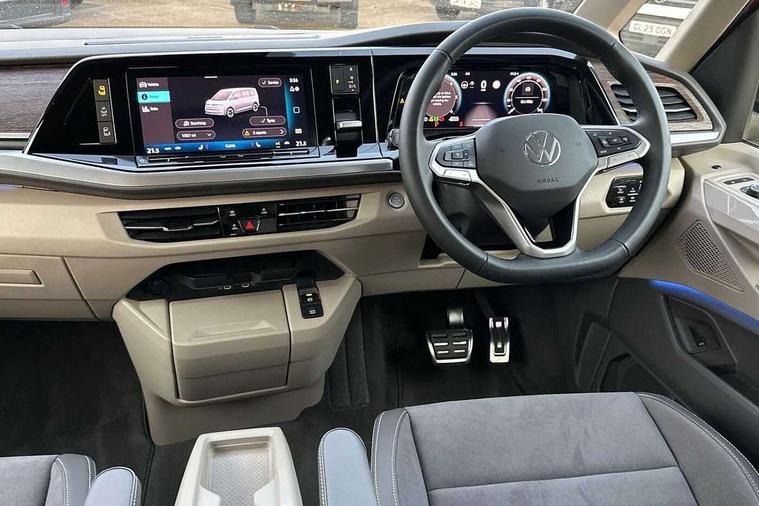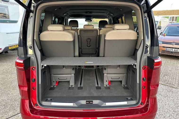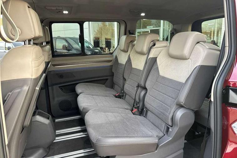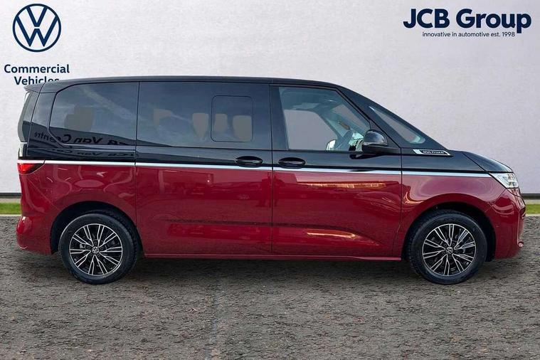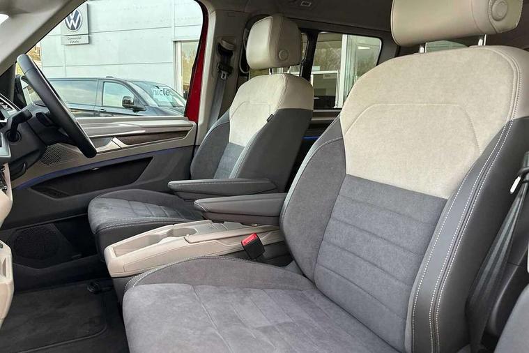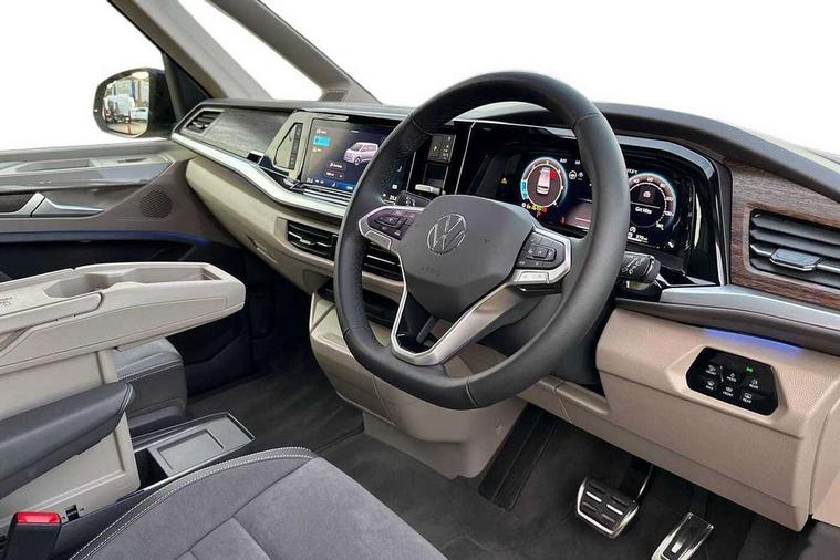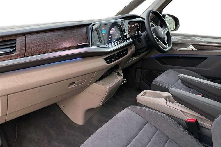 Adaptive cruise control with C2X including front assist and city emergency braking system, Digital Cockpit Pro with 10.25" colour display with adaptable display includes navigation map display, telephone contact images and audio information, Discover media pro navi system with 10" colour touch incl DAB+radio/appconnect for apple carplay/android auto/streaming and internet/gesture control, Driver alert system, Dynamic road sign display, eCall emergency system, Electrically-operated tailgate opening and closing function (Easy open), operated via foot movement under rear tailgate, Emergency assist, Front Cross Traffic Alert, Lane change system with side assist including blind spot monitor, rear traffic alert and exit warning system, Lane keeping system Lane Assist, Mobile phone interface, PAS, Semi-automated driving assistance, Tailgate, Travel assist, Voice control system including Alexa web app, We connect preparation, Electronic differential lock, 2 USB-C ports in front and 4 USB-C ports in passenger compartment, Additional interior noise reduction measures, Advanced high beam control dynamic light assist for LED matrix headlamps, Automatic headlight control with welcome home lights, Body coloured exterior door handles, Break away auto dimming rear view interior mirror, Chrome trim decorative strip mid-way on side and rear, Dynamic headlight range control with dynamic cornering light, Electrically adjustable, heated and folding door mirrors, Front fog lights, Glossy black painted radiator grille with 2 illuminated chrome trims, Heated rear window with window wiper and washer system, Heated windscreen, High gloss black exterior mirror housing, IQ.Light LED matrix headlamps with LED separate daytime running light, Laminated safety glass windshield, heat and sound insulating, LED 3rd brake lamp, LED rear combination lamps, Rear wiper, Stainless steel tailgate trim, Surround lighting in door area and tailgate with logo projection in door area, Windshield wiper intermittent control with rain sensor, 1 x 12V sockets on the dash panel, 12V socket in passenger compartment, 3 seat bench in 3rd row, 30 colours ambient interior lighting and tailgate surround lighting, 7 single seats removable/movable, Carpet mats in cab, Climatronic 3 zone air conditioning with additional control panel in passenger compartment, Front and rear head restraints, Grab handles on A pillar for access, on driver and front passenger side, Height adjustable seats, Height and longitudinal adjustment steering wheel with gear shift paddles, Illumination lockable glovebox compartment, ISOFIX (including i-size) and top tether in all seats in 2nd and 3rd rows, LED luggage compartment lighting X 2, Load compartment partition to 20kg with bag hooks and luggage net, Luggage compartment lid power latching with unlatching from inside, Multifunction leather steering wheel with tiptronic, Reinforced carpet floor covering in passenger compartment, Removable armrests for front seats with power adjustable lumbar support and folding table for 2nd row passenger seats, Removable armrests in 2nd row passenger seats, Single front passenger seat, Slidable multifunction table/centre console with 3 cup holders, Stainless steel pedals, Storage compartment under the 2nd and 3rd row seat and two waste bins, Sun visors with illuminated vanity mirror, ticket holder on driver side with airbag warning label on sunvisor and B-pillar, Easy open package - Multivan, 3x3 point rear seat belts, ABS, Automatic post collision braking system, Autonomous emergency braking front assist with pedestrian and cyclist monitoring, Driver and front passenger airbag with front passenger airbag deactivation, Electric childproof lock, Electronic stability control (ESC) and Electromechanical brake booster, ESP, First aid kit with warning triangle and safety vest, Front disc brakes, Hill hold assist, Seat belt warning for the drivers and all passengers seats if unfastened, Side and curtain airbags for driver and front passenger, curtain airbags for outer seats in rear, centre airbag in front, Single tone horn, Traction control, Tyre pressure monitoring system, Anti theft alarm system with interior monitoring in cab, backup horn and towing protection, Central locking system with interior control and safe lock, Keyless advanced with keyless entry, Start/stop button on centre console, Dark woodgrain optic decorative inserts,