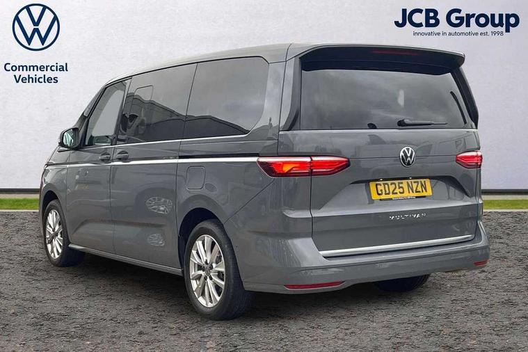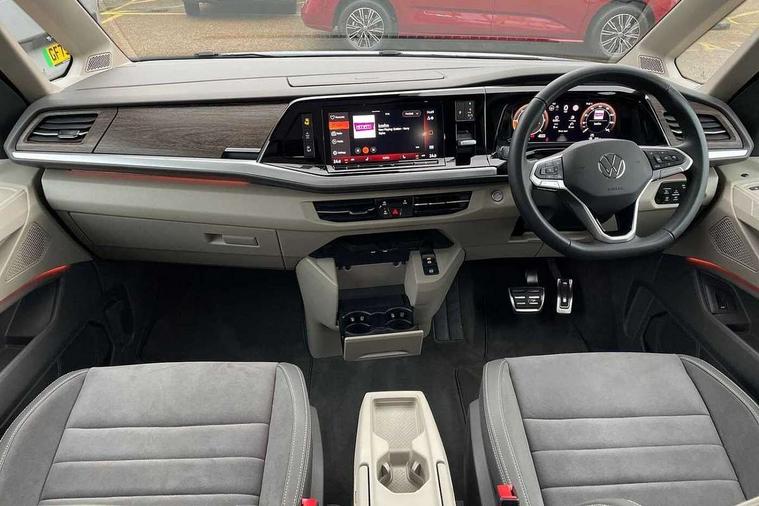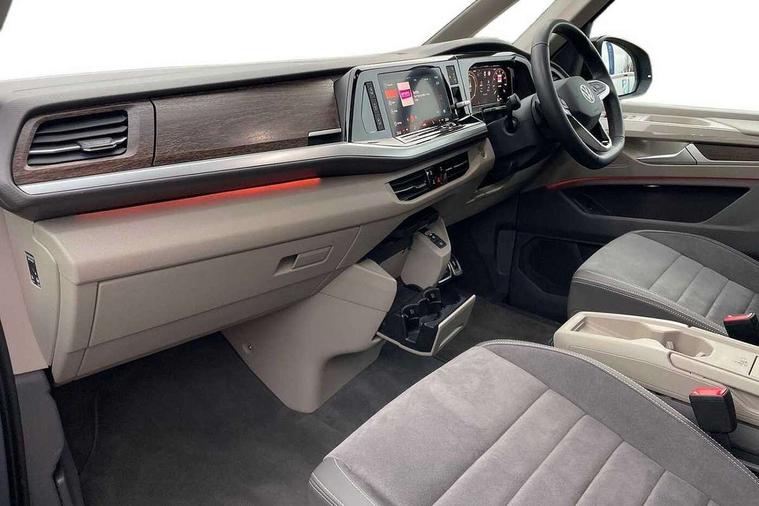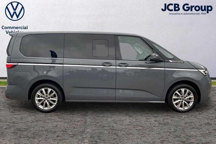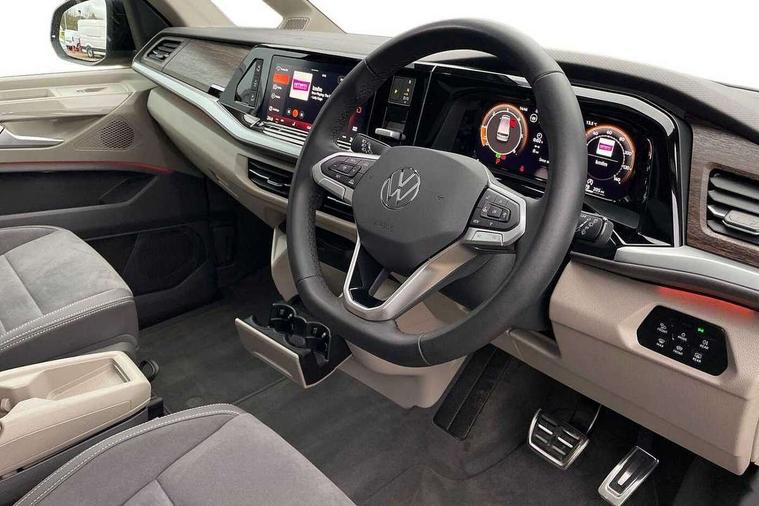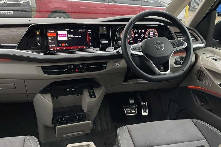 Adaptive cruise control with C2X including front assist and city emergency braking system, Digital Cockpit Pro with 10.25" colour display with adaptable display includes navigation map display, telephone contact images and audio information, Discover media pro navi system with 10" colour touch incl DAB+radio/appconnect for apple carplay/android auto/streaming and internet/gesture control, Driver alert system, Dynamic road sign display, eCall emergency system, Electrically-operated tailgate opening and closing function (Easy open), operated via foot movement under rear tailgate, Emergency assist, Front Cross Traffic Alert, Lane change system with side assist including blind spot monitor, rear traffic alert and exit warning system, Lane keeping system Lane Assist, Mobile phone interface, PAS, Semi-automated driving assistance, Tailgate, Travel assist, Voice control system including Alexa web app, We connect preparation, Electronic differential lock, 2 USB-C ports in front and 4 USB-C ports in passenger compartment, Additional interior noise reduction measures, Advanced high beam control dynamic light assist for LED matrix headlamps, Automatic headlight control with welcome home lights, Body coloured exterior door handles, Break away auto dimming rear view interior mirror, Chrome trim decorative strip mid-way on side and rear, Dynamic headlight range control with dynamic cornering light, Electrically adjustable, heated and folding door mirrors, Front fog lights, Glossy black painted radiator grille with 2 illuminated chrome trims, Heated rear window with window wiper and washer system, Heated windscreen, High gloss black exterior mirror housing, IQ.Light LED matrix headlamps with LED separate daytime running light, Laminated safety glass windshield, heat and sound insulating, LED 3rd brake lamp, LED rear combination lamps, Rear wiper, Stainless steel tailgate trim, Surround lighting in door area and tailgate with logo projection in door area, Windshield wiper intermittent control with rain sensor, 1 x 12V sockets on the dash panel, 12V socket in passenger compartment, 3 seat bench in 3rd row, 30 colours ambient interior lighting and tailgate surround lighting, 7 single seats removable/movable, Carpet mats in cab, Climatronic 3 zone air conditioning with additional control panel in passenger compartment, Front and rear head restraints, Grab handles on A pillar for access, on driver and front passenger side, Height adjustable seats, Height and longitudinal adjustment steering wheel with gear shift paddles, Illumination lockable glovebox compartment, ISOFIX (including i-size) and top tether in all seats in 2nd and 3rd rows, LED luggage compartment lighting X 2, Load compartment partition to 20kg with bag hooks and luggage net, Luggage compartment lid power latching with unlatching from inside, Multifunction leather steering wheel with tiptronic, Reinforced carpet floor covering in passenger compartment, Removable armrests for front seats with power adjustable lumbar support and folding table for 2nd row passenger seats, Removable armrests in 2nd row passenger seats, Single front passenger seat, Slidable multifunction table/centre console with 3 cup holders, Stainless steel pedals, Storage compartment under the 2nd and 3rd row seat and two waste bins, Sun visors with illuminated vanity mirror, ticket holder on driver side with airbag warning label on sunvisor and B-pillar, Easy open package - Multivan, 3x3 point rear seat belts, ABS, Automatic post collision braking system, Autonomous emergency braking front assist with pedestrian and cyclist monitoring, Driver and front passenger airbag with front passenger airbag deactivation, Electric childproof lock, Electronic stability control (ESC) and Electromechanical brake booster, ESP, First aid kit with warning triangle and safety vest, Front disc brakes, Hill hold assist, Seat belt warning for the drivers and all passengers seats if unfastened, Side and curtain airbags for driver and front passenger, curtain airbags for outer seats in rear, centre airbag in front, Single tone horn, Traction control, Tyre pressure monitoring system, Anti theft alarm system with interior monitoring in cab, backup horn and towing protection, Central locking system with interior control and safe lock, Keyless advanced with keyless entry, Start/stop button on centre console, Dark woodgrain optic decorative inserts,