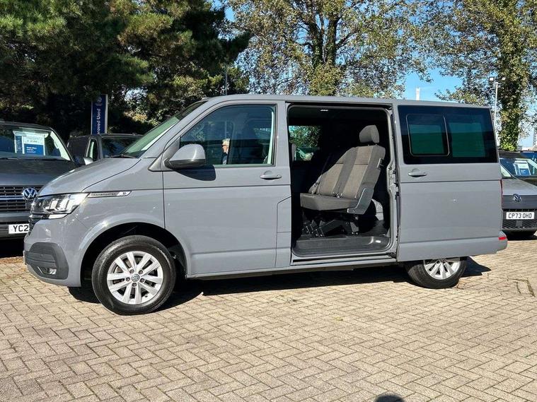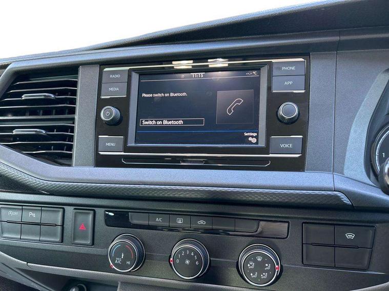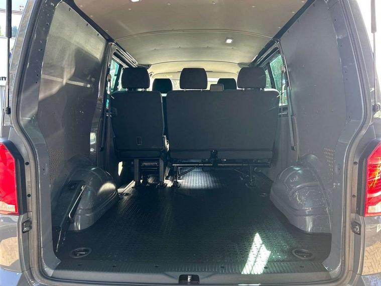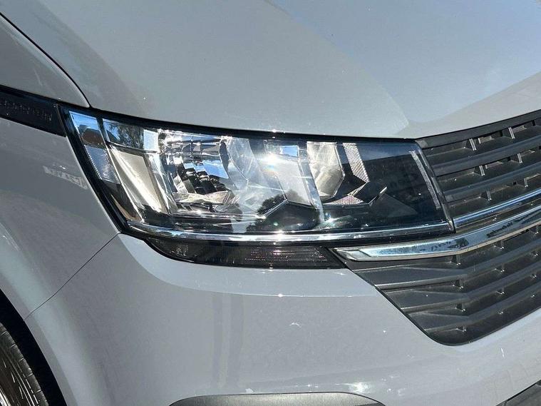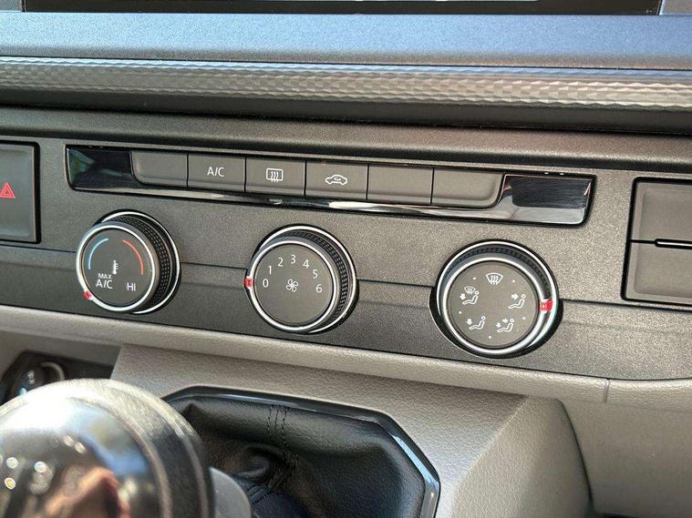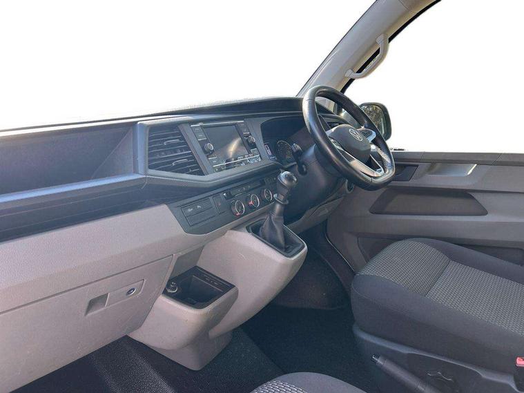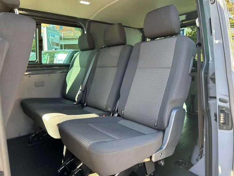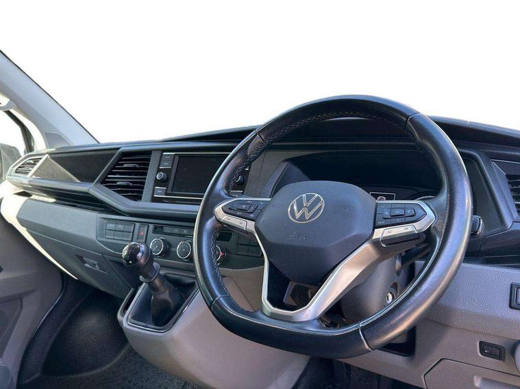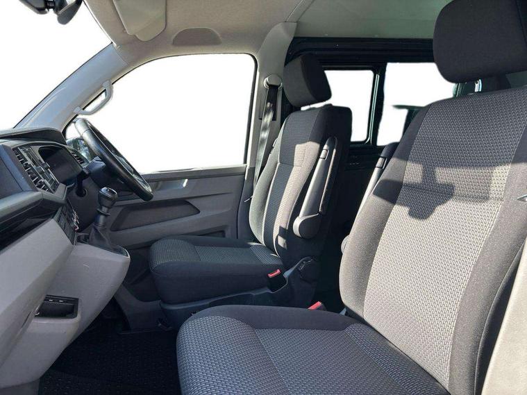 Adaptive cruise control, Child seat anchors ISOFIX and top tether in 2nd row of seats, Cross wind assist, Dimmable illuminated instruments, Driver alert with black and white multi function display plus, eCall emergency system, Forward collision warning front assist with autonomous emergency braking, Headlight range control, Mobile phone interface, Without voice control, 2 USB interfaces type C in dashboard, 4 speakers with 2 tweeters and 2 woofers, Composition colour radio with 6.5" touchscreen, Digital radio reception (DAB+), Volkswagen app connect, Automatic headlight control, leaving home and manual coming home feature, Front fog lamps with cornering light, Green heat insulating glass, Heated front windscreen, Illuminated steps in passenger/load compartment, Left convex exterior mirror, Power folding adjustable door mirrors with separately heated, Privacy glass from the B-pillar and heat-insulating glass in front, Radiator grille with 2 chrome trims, Rear window with heated insulating glass, heated rear window wiper and washer system, Right convex exterior mirror, Tailgate closing with unlatching from the inside, Transporter nameplate on the rear fender, Windshield wiper intermittent control with rain sensor for windshield wipers, Without adhesive film, 3 spoke leather wrapped multi function steering wheel, Additional sound deadening measures in cab and passenger compartment, Auto dimming breakaway interior rear view mirror, Comfort headliner in cab, hardboard roof trim in passenger and load compartment, Dust/pollen filter, Folding grab handles and storage compartments on cab seats, reading light, Front seats on the right in 1st row of seat, Glove compartment with illumination, Heavy duty tool kit and jack, Interior plastic loading edge protection, Lashing rings for load restraint system, LED Interior lighting in load and passenger compartment, Medium height for vehicles with window aperture hardboard side trim panels in passenger/load compartment, Refrigerant R134a, Standard lower part dashboard in palladium, Without partition, Without seats in 3rd row of seats, Comfort pack - Transporter, Exterior pack without fog light- Transporter, Light and vision pack - Transporter, Non smoker pack - Transporter, 3 point height adjustable seat belts on outer seats cab with electric pretensioners, Driver and front passenger airbag with front passenger airbag deactivation, Power operated child safety lock, Warning buzzer and light for driver seat belt not fastened, Anti theft alarm system with interior monitoring in cab, backup horn and towing protection, Lockable wheel bolts, 16" chassis with 16" brake system, Diesel particulate filter, Electronic stability control, ABS, ASR with deactivation button, hill start assist and brake assist system, Speed limiter, Start/stop system with regenerative breaking, 16" Clayton alloy wheels, Wheel trims,