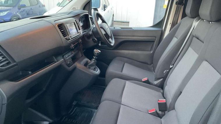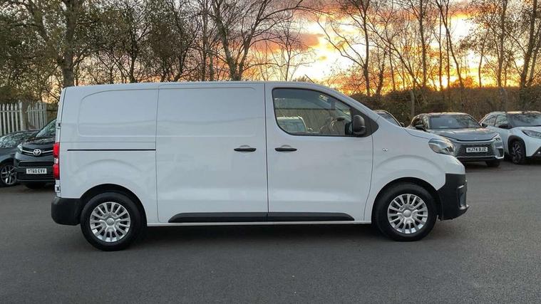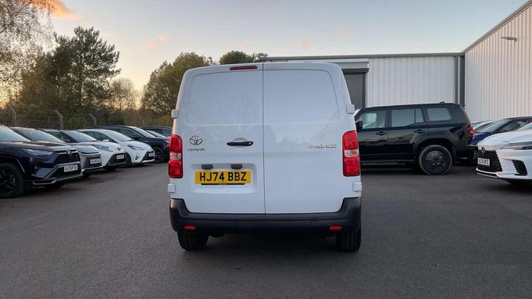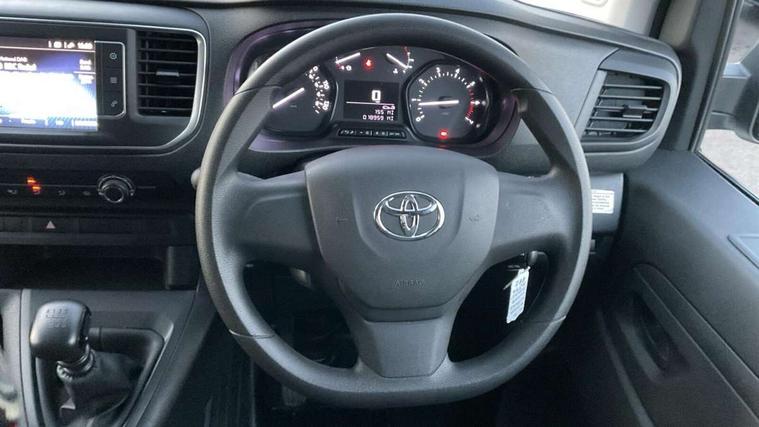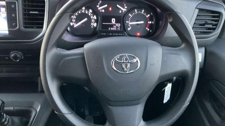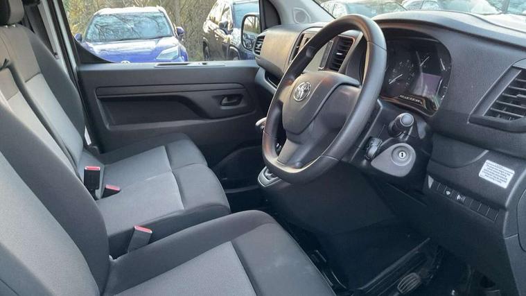 Bluetooth handsfree connectivity, Cruise control, PAS, Tyre pressure warning system (TPWS), 4 speakers, Digital radio (DAB), Radio/CD player, USB connector, 180 degree opening rear doors, Acoustic windscreen, Auto Headlights, Auto wipers, Black bumpers, Black door handles, Black protection moulding on side door, Body Coloured roof, Daytime running lights, Front power windows, Headlight cut-off reminder, Heated door mirrors, LED High mounted stop light, Manually adjustable day/night rear view mirror, Multi reflector halogen headlights, Panel rear wing doors, Power adjustable door mirrors, Rear combination lights, Short Antenna, Smoke tinted (30%) privacy glass on rear passenger window, Two manual sliding side doors, 2 seat front passenger bench, Driver seat armrest, Fabric seats, Front cup holders, Front room lights, Glovebox light, LED Driver and front passenger personal lights, Lighted and chilled upper glove box, Manually reclining and sliding driver and front passenger seats, Open upper dashboard storage compartment, Panel bulkhead with window and protective grille, Storage under passenger bench, Air conditioning and Smart cargo pack - Proace, Parking pack - Proace, Double front passenger airbag, Front passenger airbag on/off switch, Supplement restraint system (SRS) 2 airbags, Alarm, Deadlocks + 2 remote keys, Power door locks, 12V power front outlet, 12v socket in dashboard and rear, Adjustable speed limiter (ASL), Anti lock braking system (ABS), Brake Assist (BA), Stop/start function, Toyota traction select, Vehicle stability control (VSC) and hill start assist control (HAC), Full size spare wheel, Full wheel covers,