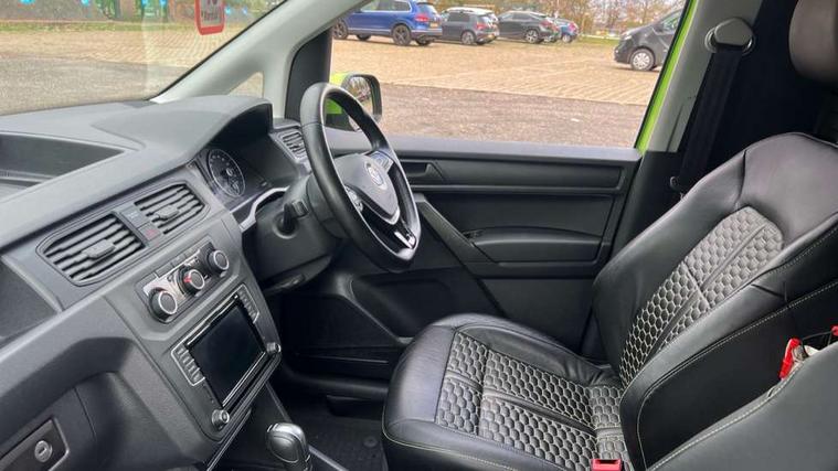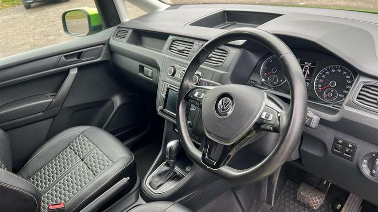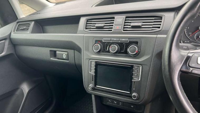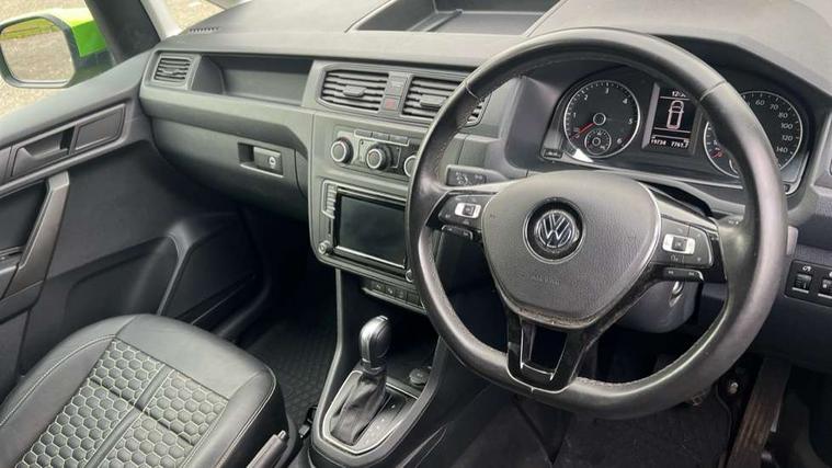 Digital clock, Dimmable dashboard ilumination, Discover media navigation system includes guide + inform with SD card maps, Driver alert system includes drowsiness detection, Headlight range control, Multi-function Display Plus, Seatbelt warning indicator, Service indicator, Servotronic speed related power assisted steering, Stop/start button, Composition colour DAB+ radio including AUX-IN, SD card slot, USB port, MP3 compatible CD player, two speakers and Bluetooth, Anti dazzle rear view mirror, Automatic hazard light activation under emergency braking, BlueMotion technology exterior badge, Body coloured bumpers, door mirrors and handles, Electric front windows, Heated windscreen, Roof rail preparation, Windscreen wiper with variable intermittent delay and wash-wipe system, 2 LED spot lights in load compartment, 8 way adjustable driver seat, Drivers seat adjustable for reach and rake, Four drinks holders and storage compartment in centre console, Hardboard roof trim and painted half height side panels, Height adjustable driver seat, Height adjustable head restraints, Illuminated lockable glovebox, Interior light in headlining, Jack and tool kit, Multifunction leather steering wheel, gearknob and gaiter, Passenger seat with reach and rake adjustment, Reach and rake adjustable steering column, Rubber floor covering, Six lashing points for securing loads, Storage compartments under driver and front passenger seats, Twin sun visors with vanity mirrors, Two door activated interior lights, Lights and vision pack - Caddy, Drivers side airbags and passenger curtain airbags, Electric seatbelt tensioners, Anti-theft alarm Thatcham cat 1, interior (cab only) and tow away protection, Locking wheel bolts, Remote central locking with deadlocks, interior locking, 12V accessory socket, Anti locking braking system (ABS), Automatic post collision braking system, Brake energy regeneration, Electronic brake force distribution (EBD), Electronic differential lock (EDL), Electronic stabilisation programme (ESP), Emergency brake assist, Engine drag torque control (MSR), Hill hold assist, Traction control system (TCS), Black wheel centre caps, Low rolling resistance tyres,