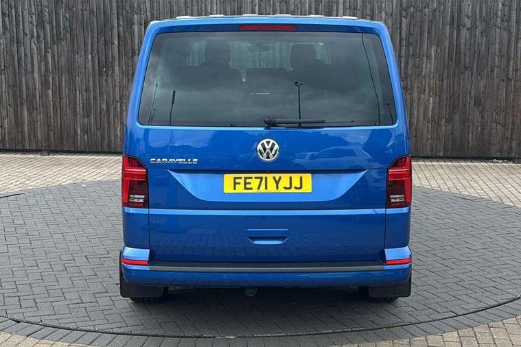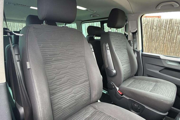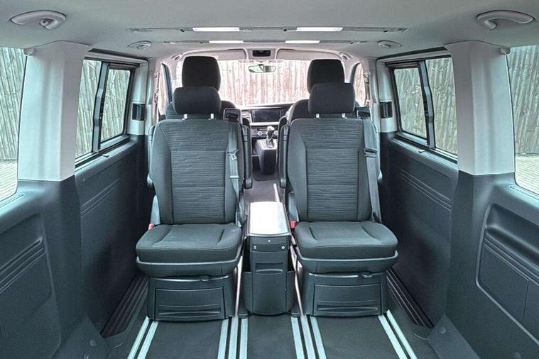 Adaptive cruise control including speed limiter and city emergency braking, Bluetooth handsfree set, Coolant temperature indicator, Cross wind assist, Digital clock, eCall emergency system, Mobile phone interface, Premium multifunction display with multicolour display, Radio composition with 6.5 inch colour touch screen, Rest assist, Service interval indicator, Start/stop system with regenerative braking, Tailgate closing with unlatching from the inside, Tailgate with window aperture and with power latching, Trip computer, Volkswagen app connect, Warning lights, Without voice control, 16 inch chassis with 16 inch brake system, Differential lock, Standard suspension and shock absorption, 2 (type C) USB interfaces in dashboard, 2 USB charging sockets in the left C pillar, 6 speakers - 2 tweeters, 2 woofers, 2 full range speakers, DAB digital radio reception, 10 feet standard roof with mounting points for roof rack system, Additional dust seals on the outside, Automatic headlight control system, Black radiator grille with 5 chrome trims, Body colour bumpers, Body coloured exterior door handles, Body coloured exterior mirror housings, Break away auto dimming rear view interior mirror, Caravelle nameplate on the fender and on the rear, Electric front windows, Fixed side window front and rear in load/passenger compartment left and right, Headlight range control, Left and right convex exterior mirror, Manual coming and leaving home function, Rear window with heat insulating glass, heated, rear window wiper and washer system, Sliding door on the left in load/ passenger compartment with power latching, Sliding door on the right in load/ passenger compartment with power latching, Windshield wiper intermittent control with rain sensor, Without adhesive film, Without trailer hitch, 3 Spoke leather multi function steering wheel, Air recirculation system, Air vent in driver's door, Armrest for both cab seats, Comfort headliner in cab and headliner for recirculated air vents in passenger compartment, Comfort seat on the left and right, in 1st row of seats (not swiveling), Comfort side trim panel in passenger compartment, Dashboard illuminated dimmable instruments, Dust/pollen filters, Electromechanical speed sensitive power steering, height and longitudinally adjustable steering column, Front cupholder, Front/rear reading lights, Glove compartment with illumination, Grab handles on A pillar for access, on driver and front passenger side, Height and tilt adjustable head restraints for all seats, Illuminated steps in passenger/load compartment, Interior lighting with LED technology in load/passenger compartment, Interior lighting with switch off delay and contact switches on all doors, Interior loading edge protection in plastic, ISOFIX and top tether child seat anchorage in 2nd to 4th rows, Jack and tool kit, Lashing rings for load restraint system for reinforced floor covering, Leather handbrake grip, Lockable glovebox, Luggage compartment cover, Rail seat system in passenger compartment, Rear cupholders, Refrigerant R1234yf, Reinforced carpet floor covering in passenger compartment, Roller blinds for side windows, Soft folding grab handles on roof frame, Special interior noise suppression measures, Special sound deadening measures in cab and passenger compartment, Step illumination with caravelle lettering, Storage compartment on outer side of front seats, Storage net on lower dash passenger side, Storage pockets in backrests of front seats, Sun visors with illuminated mirror and airbag label on front passenger sun visor, Sunshades for side windows in passenger compartment, Two 12V accessory power outlets, Variable intensity instrument illumination, Velour non woven floor covering in cab, Without floor mats, Without seat heater, Non smokers pack - Caravelle, 3 point automatic seatbelts in rear, Brake pad warning light, Driver and front passenger airbag with front passenger airbag deactivation, Electronic brake force distribution, Electronic stability control, ABS, ASR with deactivation button, hill start assist, brake assist system, Front assist with autonomous emergency braking, Front side airbags with curtain airbags for driver and front passenger, Height adjustable 3 point seat belts on outer seats in cab with electric pretensioners, Power operated child safety locks, Single tone horn, Traction control, Warning buzzer and light for driver seat belt not fastened, Alarm deactivation switch of interior and tow away protection on B pillar, Anti theft alarm system with interior monitoring in cab, backup horn and towing protection, Central locking system with radio remote control, system controls inside and safelock, Deadlocks, Electronic immobiliser, Lockable fuel cap, Locking wheel bolts, Bright brushed grey decorative inserts, Comfort dashboard titanium black lower part with black chrome elements and bezels,