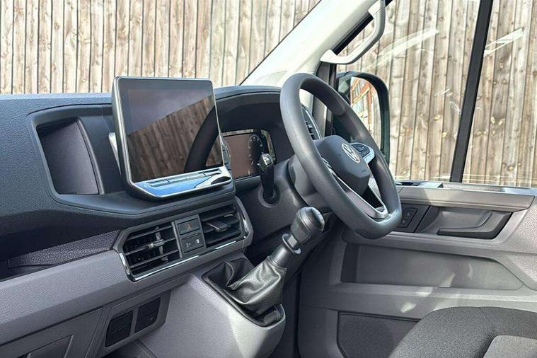Bluetooth, Digital clock, Driver alert system, E-call + We connect basic preparation, Instrument cluster, Lights on warning buzzer, Locking fuel cap, Multi-function Display Plus, Rev counter, Service indicator, Speedometer, Voice control system, Composition media with 6.5" with we connect plus prep, 4 speaker, multifun display plus, USB, mob interface, app con, "We connect function", DAB Radio, Auto low beam mode, Leaving home function and manual coming home function, Cab doors, Convex and wide angle mirror, Driver seatbelt warning light, Electric windows, Electrically heated and adjustable door mirrors, Half painted front bumper, Heat insulating glass, Indicators in front door mirrors, One towing eye in front, Rear wing doors with 270 degree hinges, Special identification plate, Unpainted radiator grille, Air recirculation system, Ashtray, Centre console storage tray, CFCU preparation, Charcoal filter, Climatic air conditioning, Document holder on centre console, Drinks holders, Electromechanical Servotronic steering, Electronically controlled heating system, Fully adjustable suspension type driver seat, Grab handles on rear entry pillars, Height adjustable head restraints, Height and reach adjustable steering wheel, Illuminated glove compartment with lockable lid, Interior light, including 2 reading lights, Interior light, switchable by door, Jack and tool kit, Preparation for interface for external use with terminal block, Storage compartments in doors and in step, right, Storage tray on dashboard, Two 12V outlets in the cab (in the dashboard), Without rear side trim panel passenger load compartment, Non-smokers pack - Crafter, 3 point inertia reel belt on all seats, Automatic hazard light with emergency braking, Crosswind assist, Driver and front passenger airbag with front passenger airbag deactivation, Height adjustable seatbelts for outer cab seats, 1 rigid key, Anti-theft alarm with interior monitor, back up horn and tow away protect, overhead storage with two 1-DIN, reading light, SAFELOCK with 2 remote keys, Engine immobiliser, ABS, Automatic post collision braking system, EBA, EBD, EDL, ESP, Front disc brakes, HBA, Hill start assist, Parking brake - hill hold control, Start and stop system with regenerative braking, TCS, Hub cap covers,