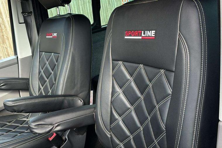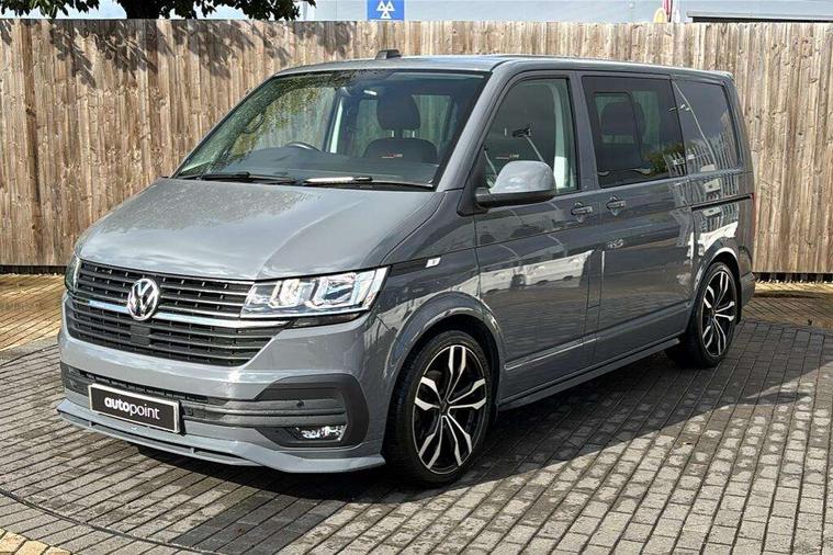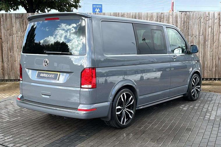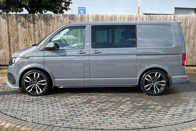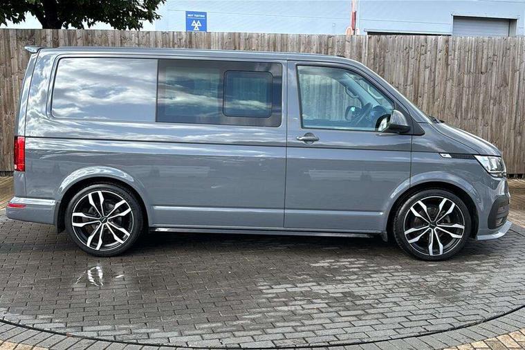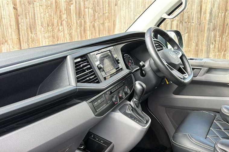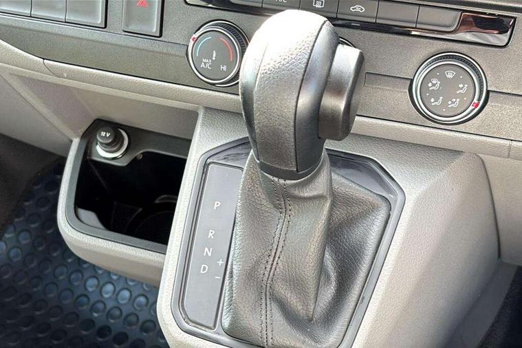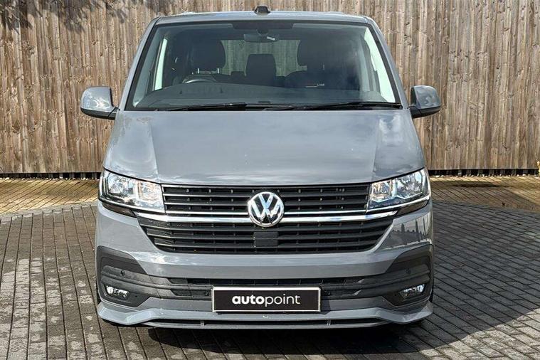 Adaptive cruise control, Child seat anchors ISOFIX and top tether in 2nd row of seats, Cross wind assist, Dimmable illuminated instruments, Driver alert with black and white multi function display plus, eCall emergency system, Electromechanical speed sensitive power steering, height and longitudinally adjustable steering column, Forward collision warning front assist with autonomous emergency braking, Headlight range control, Mobile phone interface, Without voice control, 2 USB interfaces type C in dashboard, 4 speakers with 2 tweeters and 2 woofers, Composition colour radio with 6.5" touchscreen, Digital radio reception (DAB+), Volkswagen app connect, Automatic headlight control, leaving home and manual coming home feature, Front fog lamps with cornering light, Green heat insulating glass, Heated front windscreen, Illuminated steps in passenger/load compartment, Left convex exterior mirror, Power folding adjustable door mirrors with separately heated, Privacy glass from the B-pillar and heat-insulating glass in front, Radiator grille with 2 chrome trims, Rear window with heated insulating glass, heated rear window wiper and washer system, Right convex exterior mirror, Tailgate closing with unlatching from the inside, Transporter nameplate on the rear fender, Windshield wiper intermittent control with rain sensor for windshield wipers, Without adhesive film, 3 spoke leather wrapped multi function steering wheel, Additional sound deadening measures in cab and passenger compartment, Auto dimming breakaway interior rear view mirror, Comfort headliner in cab, hardboard roof trim in passenger and load compartment, Dust/pollen filter, Folding grab handles and storage compartments on cab seats, reading light, Front seats on the right in 1st row of seat, Glove compartment with illumination, Heavy duty tool kit and jack, Interior plastic loading edge protection, Lashing rings for load restraint system, LED Interior lighting in load and passenger compartment, Medium height for vehicles with window aperture hardboard side trim panels in passenger/load compartment, Refrigerant R134a, Standard lower part dashboard in palladium, Without partition, Without seats in 3rd row of seats, Comfort pack - Transporter, Exterior pack without fog light- Transporter, Light and vision pack - Transporter, Non smoker pack - Transporter, 3 point height adjustable seat belts on outer seats cab with electric pretensioners, Driver and front passenger airbag with front passenger airbag deactivation, Power operated child safety lock, Warning buzzer and light for driver seat belt not fastened, Anti theft alarm system with interior monitoring in cab, backup horn and towing protection, Lockable wheel bolts, 16" chassis with 16" brake system, 70 L volume fuel tank, Diesel particulate filter, Electronic stability control, ABS, ASR with deactivation button, hill start assist and brake assist system, Speed limiter, Start/stop system with regenerative breaking, 16" Clayton alloy wheels, Wheel trims,