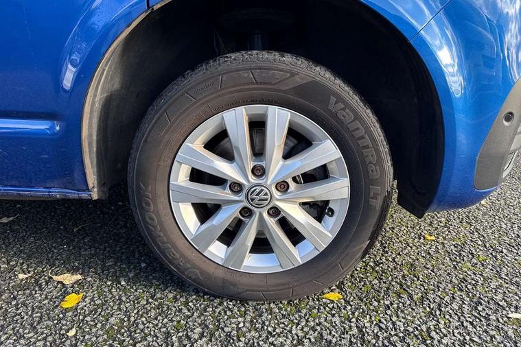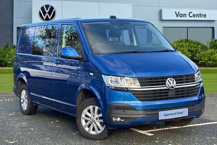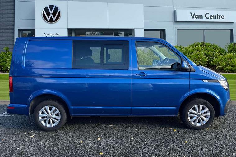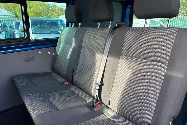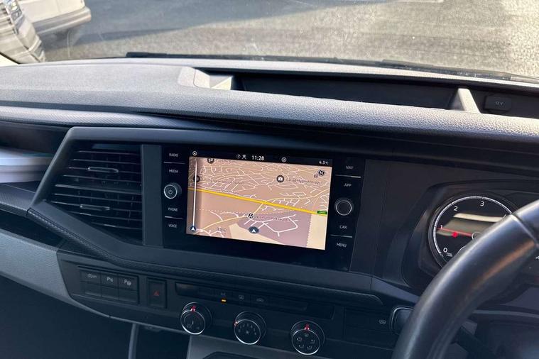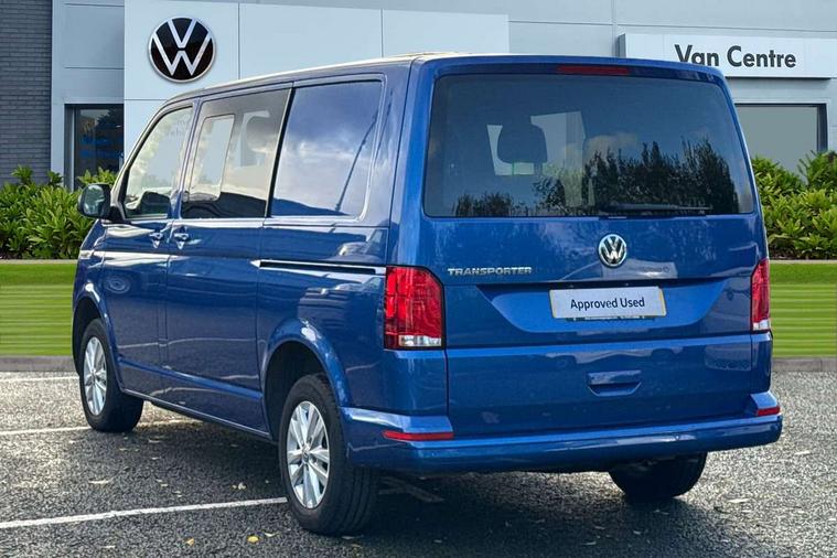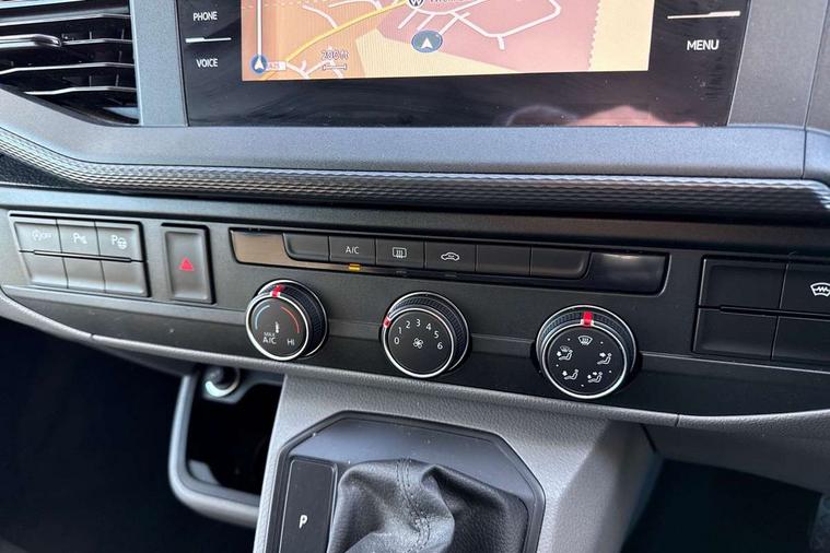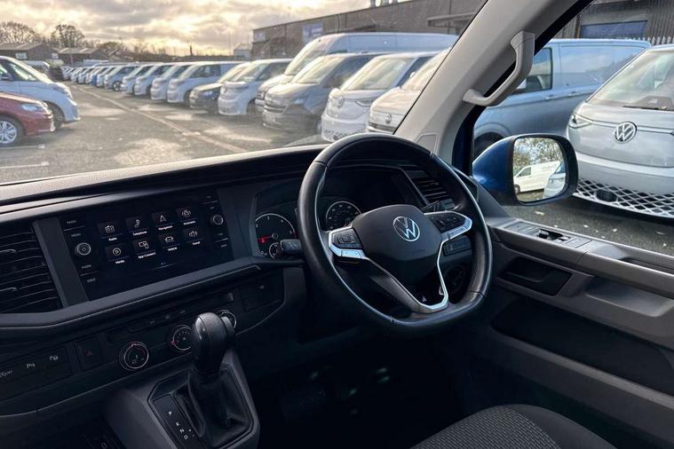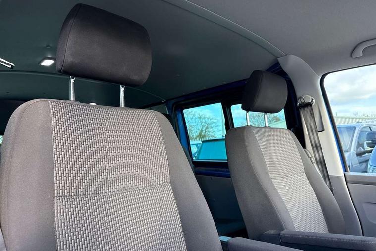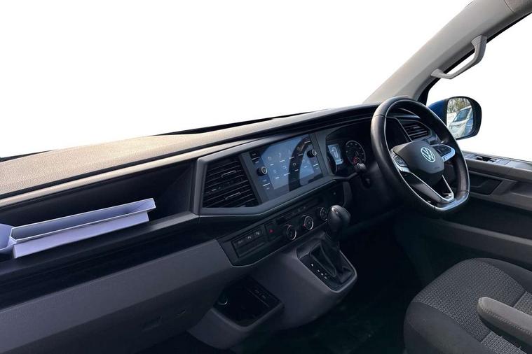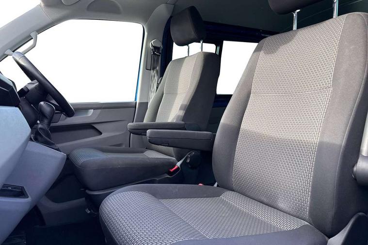 Adaptive cruise control, Child seat anchors ISOFIX and top tether in 2nd row of seats, Cross wind assist, Dimmable illuminated instruments, Driver alert with black and white multi function display plus, eCall emergency system, Forward collision warning front assist with autonomous emergency braking, Headlight range control, Mobile phone interface, Without voice control, 2 USB interfaces type C in dashboard, 4 speakers with 2 tweeters and 2 woofers, Composition colour radio with 6.5" touchscreen, Digital radio reception (DAB+), Volkswagen app connect, Automatic headlight control, leaving home and manual coming home feature, Front fog lamps with cornering light, Green heat insulating glass, Heated front windscreen, Illuminated steps in passenger/load compartment, Left convex exterior mirror, Power folding adjustable door mirrors with separately heated, Privacy glass from the B-pillar and heat-insulating glass in front, Radiator grille with 2 chrome trims, Rear window with heated insulating glass, heated rear window wiper and washer system, Right convex exterior mirror, Tailgate closing with unlatching from the inside, Transporter nameplate on the rear fender, Windshield wiper intermittent control with rain sensor for windshield wipers, Without adhesive film, 3 spoke leather wrapped multi function steering wheel, Additional sound deadening measures in cab and passenger compartment, Auto dimming breakaway interior rear view mirror, Comfort headliner in cab, hardboard roof trim in passenger and load compartment, Dust/pollen filter, Folding grab handles and storage compartments on cab seats, reading light, Front seats on the right in 1st row of seat, Glove compartment with illumination, Heavy duty tool kit and jack, Interior plastic loading edge protection, Lashing rings for load restraint system, LED Interior lighting in load and passenger compartment, Manual height adjustable and lumbar support for driver and single passenger seats, Medium height for vehicles with window aperture hardboard side trim panels in passenger/load compartment, Refrigerant R134a, Standard lower part dashboard in palladium, Without partition, Without seats in 3rd row of seats, Comfort pack - Transporter, Exterior pack without fog light- Transporter, Light and vision pack - Transporter, Non smoker pack - Transporter, 3 point height adjustable seat belts on outer seats cab with electric pretensioners, Driver and front passenger airbag with front passenger airbag deactivation, Power operated child safety lock, Warning buzzer and light for driver seat belt not fastened, Anti theft alarm system with interior monitoring in cab, backup horn and towing protection, Lockable wheel bolts, 16" chassis with 16" brake system, Additional 12V socket, Diesel particulate filter, Electronic stability control, ABS, ASR with deactivation button, hill start assist and brake assist system, Speed limiter, Start/stop system with regenerative breaking, 16" Clayton alloy wheels, Wheel trims,