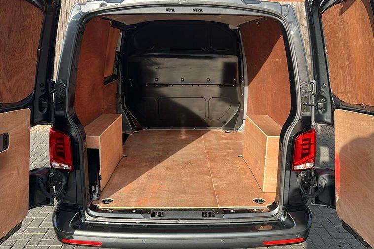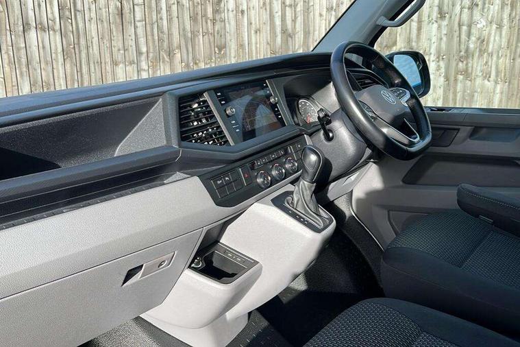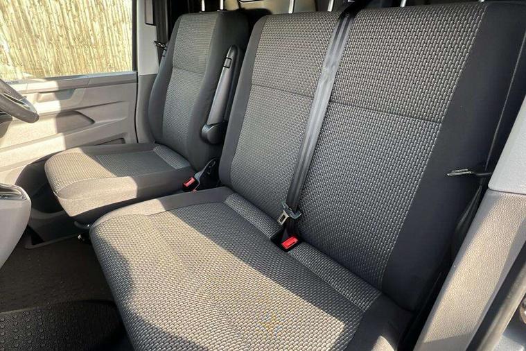 Adaptive cruise control, Cross wind assist, Dimmable illuminated instruments, Driver alert with Multi-function display plus, eCall emergency system, Electromechanical speed sensitive power steering, height and longitudinally adjustable steering column, Forward collision warning front assist with autonomous emergency braking, Mobile phone interface, Multi function display plus with black and white display, 2 USB interfaces type C in dashboard, 4 speakers with 2 tweeters and 2 woofers, Composition colour radio with 6.5" touchscreen, Digital radio reception (DAB+), Volkswagen app connect, Automatic headlight control, leaving home and manual coming home feature, Closing rear wing door with unlatching from the inside, Front fog lamps with cornering light, Heat insulating glass (green) in cab and passenger/load compartment, Heated front windscreen, Left convex exterior mirror, Power folding adjustable door mirrors with separately heated, Radiator grille with 2 chrome trims, Rear wing doors without window apertures, Right convex exterior mirror, Transporter nameplate on the rear fender, Windshield wiper intermittent control with rain sensor for windshield wipers, 3 spoke leather wrapped multi function steering wheel, Auto dimming breakaway interior rear view mirror, Comfort headliner in cab, hardboard roof trim in passenger and load compartment, Dust/pollen filter, Front and rear left without window closed side panel in load compartment, Front seats on the right in 1st row of seat, Glove compartment with illumination, Heavy duty tool kit and jack, High partition, Interior plastic loading edge protection, LED Interior lighting in load and passenger compartment, Manual adjustable lumbar support for right single seat in 1st row seats, Refrigerant R134a, Standard lower part dashboard in palladium, Storage compartments on cab seats and reading light, Without right side window apertures in passenger and load compartment, Comfort pack - Transporter, Exterior pack without fog light- Transporter, Light and vision pack - Transporter, Non smoker pack - Transporter, 3 point height adjustable seat belts on outer seats cab with electric pretensioners, Driver and front passenger airbag with front passenger airbag deactivation, Warning buzzer and light for driver and front passenger seat belt not fastened, Without child safety lock in passenger compartment, Anti theft alarm system with interior monitoring in cab, backup horn and towing protection, Lockable wheel bolts, 16" chassis with 16" brake system, Additional 12V socket, Diesel particulate filter, Electronic stability control, ABS, ASR with deactivation button, hill start assist and brake assist system, Start/stop system with regenerative breaking, 16" Clayton alloy wheels,