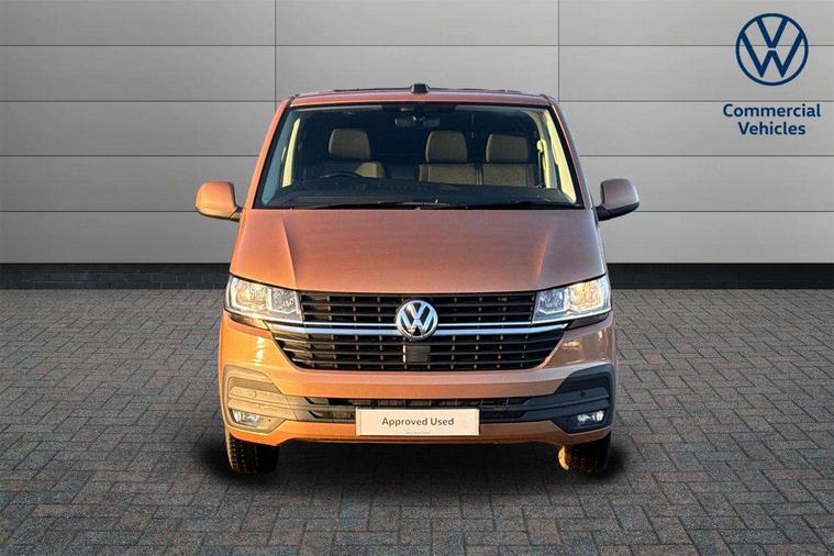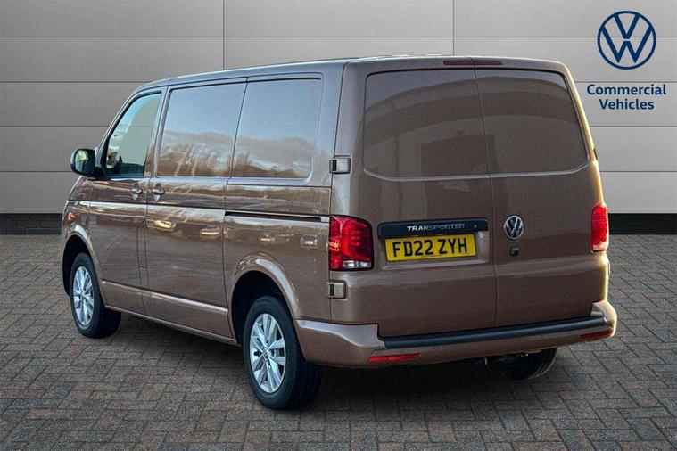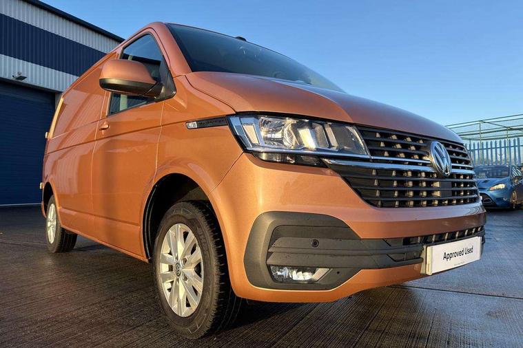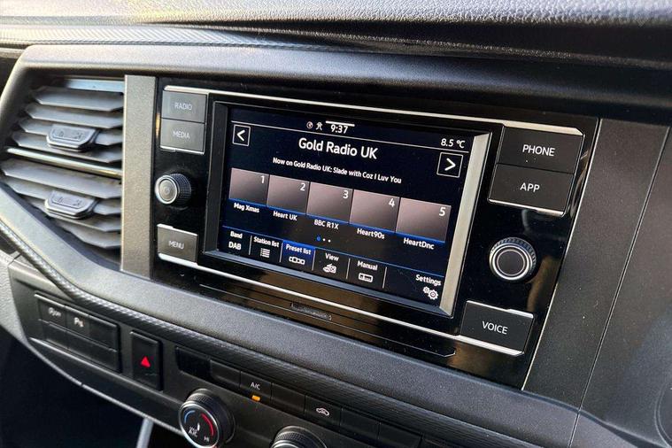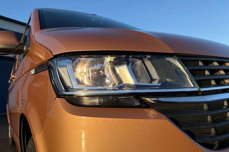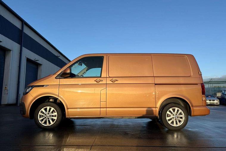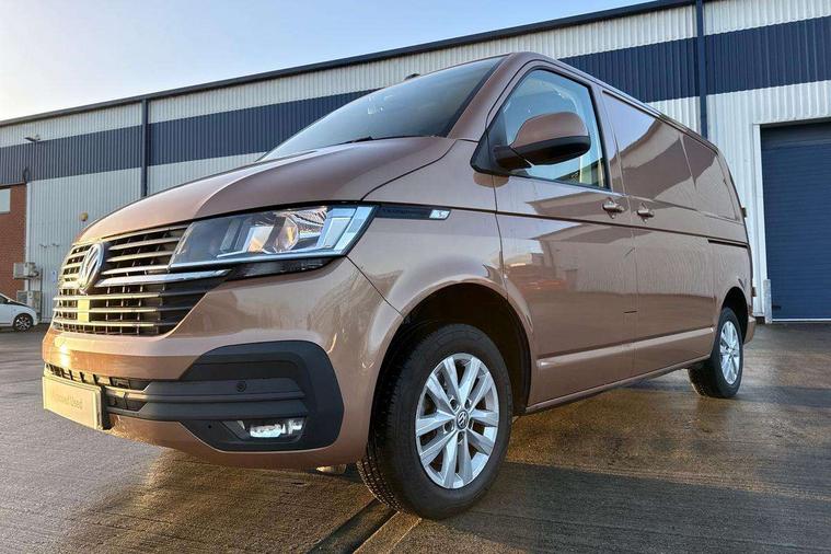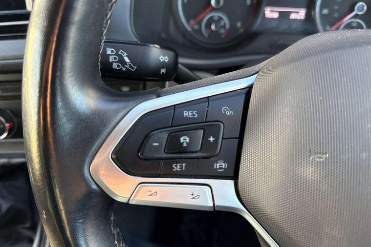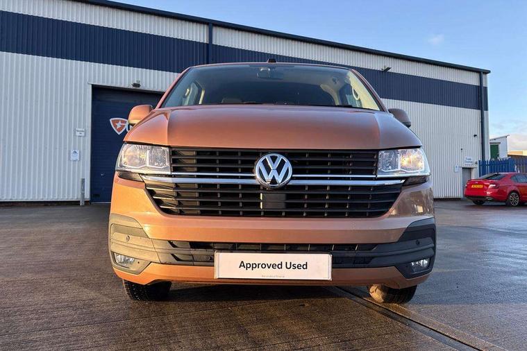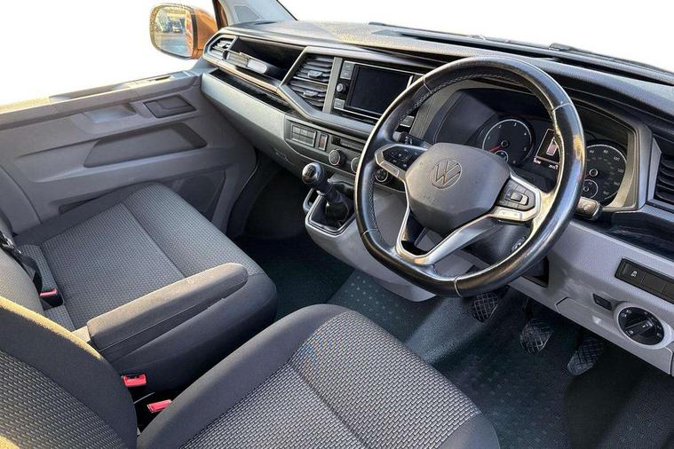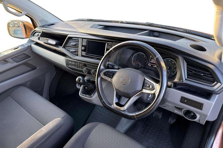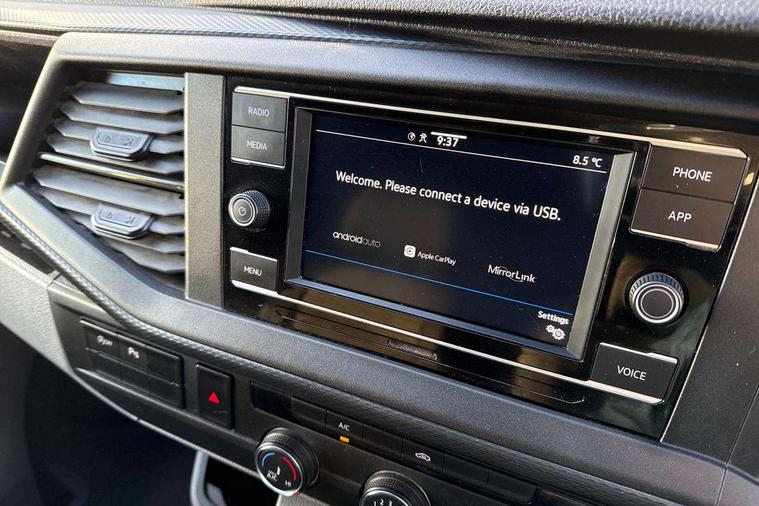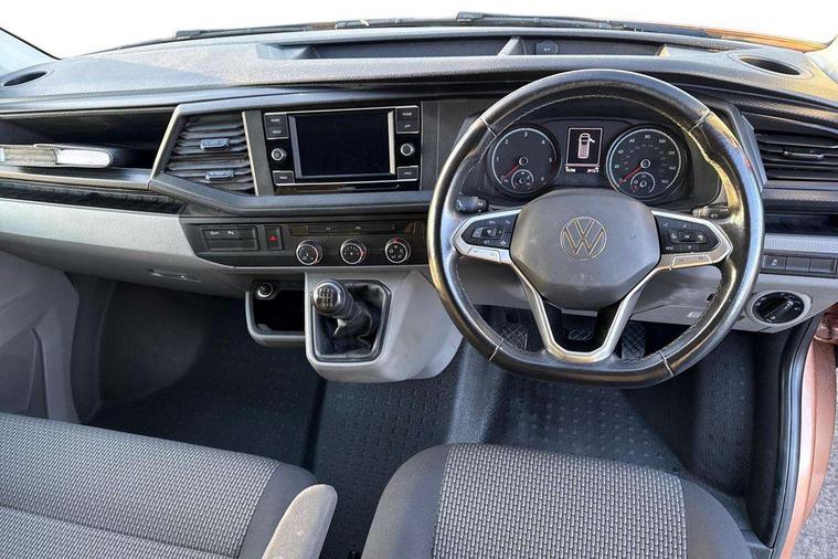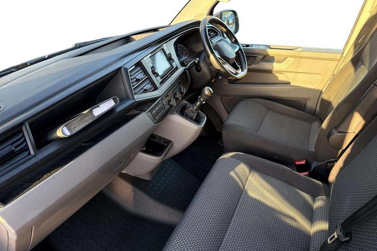 Adaptive cruise control, Cross wind assist, Dimmable illuminated instruments, Driver alert with Multi-function display plus, eCall emergency system, Electromechanical speed sensitive power steering, height and longitudinally adjustable steering column, Forward collision warning front assist with autonomous emergency braking, Mobile phone interface, Multi function display plus with black and white display, 2 USB interfaces type C in dashboard, 4 speakers with 2 tweeters and 2 woofers, Composition colour radio with 6.5" touchscreen, Digital radio reception (DAB+), Volkswagen app connect, Automatic headlight control, leaving home and manual coming home feature, Closing rear wing door with unlatching from the inside, Front fog lamps with cornering light, Heat insulating glass (green) in cab and passenger/load compartment, Heated front windscreen, Left convex exterior mirror, Power folding adjustable door mirrors with separately heated, Radiator grille with 2 chrome trims, Rear wing doors without window apertures, Right convex exterior mirror, Transporter nameplate on the rear fender, Windshield wiper intermittent control with rain sensor for windshield wipers, 3 spoke leather wrapped multi function steering wheel, Auto dimming breakaway interior rear view mirror, Comfort headliner in cab, hardboard roof trim in passenger and load compartment, Dust/pollen filter, Front and rear left without window closed side panel in load compartment, Front seats on the right in 1st row of seat, Glove compartment with illumination, Heavy duty tool kit and jack, High partition, Interior plastic loading edge protection, LED Interior lighting in load and passenger compartment, Manual adjustable lumbar support for right single seat in 1st row seats, Refrigerant R134a, Standard lower part dashboard in palladium, Storage compartments on cab seats and reading light, Without right side window apertures in passenger and load compartment, Comfort pack - Transporter, Exterior pack without fog light- Transporter, Light and vision pack - Transporter, Non smoker pack - Transporter, 3 point height adjustable seat belts on outer seats cab with electric pretensioners, Driver and front passenger airbag with front passenger airbag deactivation, Warning buzzer and light for driver and front passenger seat belt not fastened, Without child safety lock in passenger compartment, Anti theft alarm system with interior monitoring in cab, backup horn and towing protection, Lockable wheel bolts, 16" chassis with 16" brake system, Additional 12V socket, Diesel particulate filter, Electronic stability control, ABS, ASR with deactivation button, hill start assist and brake assist system, Start/stop system with regenerative breaking, 16" Clayton alloy wheels,