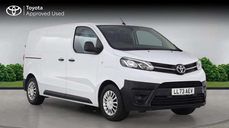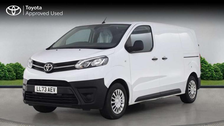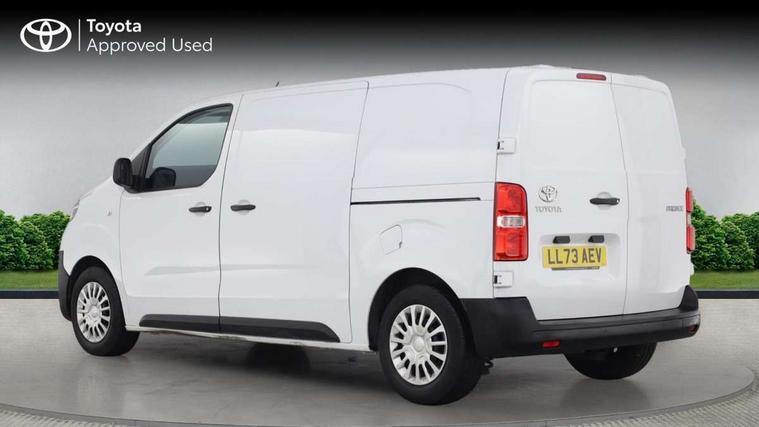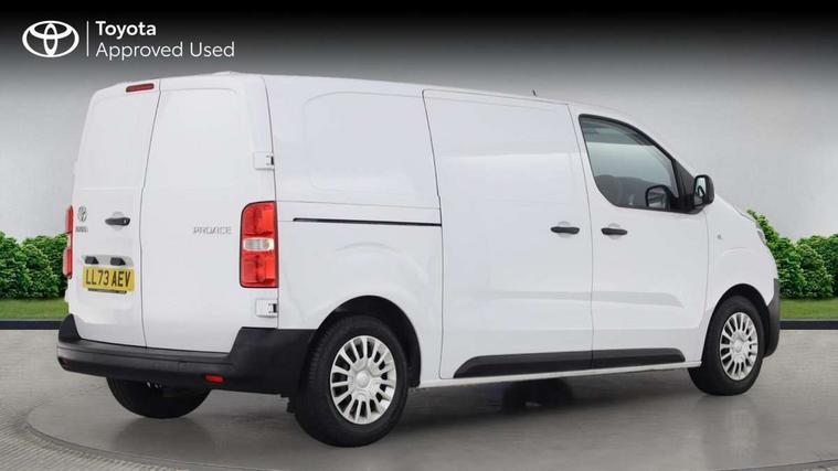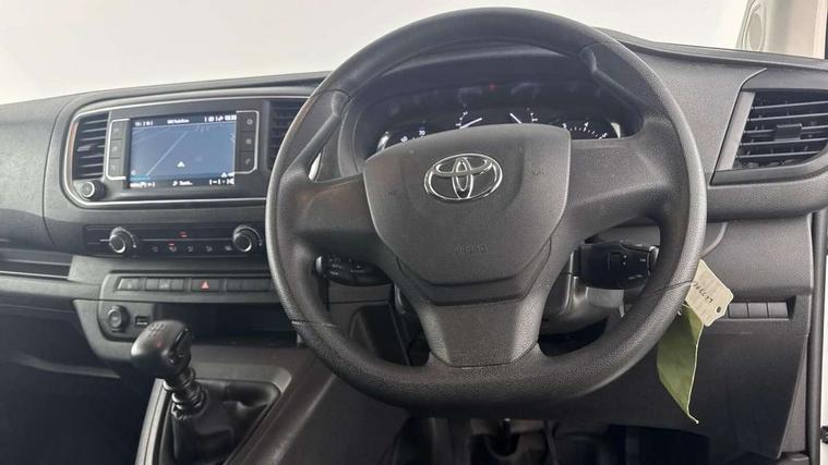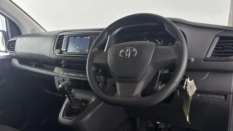 Bluetooth handsfree connectivity, Cruise control, PAS, Tyre pressure warning system (TPWS), 4 speakers, Digital radio (DAB), Radio/CD player, USB connector, 180 degree opening rear doors, Acoustic windscreen, Auto Headlights, Auto wipers, Black bumpers, Black door handles, Black protection moulding on side door, Body Coloured roof, Daytime running lights, Front power windows, Headlight cut-off reminder, Heated door mirrors, LED High mounted stop light, Manually adjustable day/night rear view mirror, Multi reflector halogen headlights, Panel rear wing doors, Power adjustable door mirrors, Rear combination lights, Short Antenna, Smoke tinted (30%) privacy glass on rear passenger window, Two manual sliding side doors, 2 seat front passenger bench, Driver seat armrest, Fabric seats, Front cup holders, Front room lights, Glovebox light, LED Driver and front passenger personal lights, Lighted and chilled upper glove box, Manually reclining and sliding driver and front passenger seats, Open upper dashboard storage compartment, Panel bulkhead with window and protective grille, Storage under passenger bench, Air conditioning and Smart cargo pack - Proace, Parking pack - Proace, Double front passenger airbag, Front passenger airbag on/off switch, Supplement restraint system (SRS) 2 airbags, Alarm, Deadlocks + 2 remote keys, Power door locks, 12V power front outlet, 12v socket in dashboard and rear, Adjustable speed limiter (ASL), Anti lock braking system (ABS), Brake Assist (BA), Stop/start function, Toyota traction select, Vehicle stability control (VSC) and hill start assist control (HAC), Full size spare wheel, Full wheel covers,