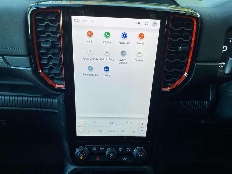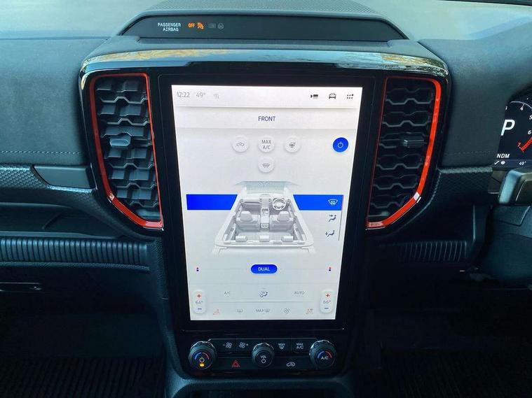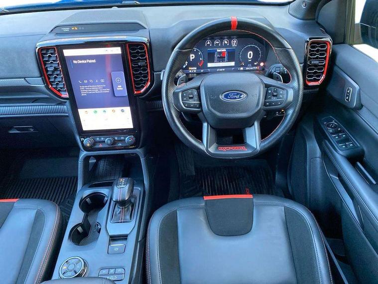 A-pillar assist handle, Electric power assisted steering, Electronic automatic gearshift, Full TFT/LCD instrument cluster, Passenger side roof mounted grab handle, Pro trailer backup assist, Wireless charging pad, 360 lighting, Accent colour HD front bumper, Acoustic laminated windscreen, Assisted conventional tailgate, Automatic headlamp levelling, Automatic headlights, Black front fender grille, Black grille, Body colour exterior mirrors, Body coloured door handles, Cast alloy side step, Daytime running lights, Dual power heated fold back door mirror with puddle lamps, E-marked glass, Electric rear window defroster, Electric windshield defroster, Electrochromic interior mirror, Extra large wheelarch flares, Fog lamp bezel, Front splash guard, Front towing hooks, Fuel tank guard, High mounted stop lamp, LED Front fog lamp, Level 3 Taillamps, Manual liftgate, Metal underbody protection, Non locking capless fuel fill, Power front windows with one touch up/down, Power rear windows, Privacy glass, Rain sensitive windshield wipers, Rear bumper step accent color, Rear fog lamps, Rear splash guard, Rear towing hooks, Self coloured decklid handles, Tempered glass front window, Under hood engine cover, 12v socket in bedliner, Cargo light, Console with double lid, Driver and passenger sunvisor with mirror, Electronic dual zone automatic air conditioning, Fresh air heater, Front premium floor mats, Heated steering wheel, High series air register, LED ambient interior lighting, Load box edge protectors, Locking glove box lid, Non woven carpet, Overhead console with dome lamps, Pollen filter, Pull out cup holder, Radio noise supression, Rear floor ducts, Roof storage for driver sunglasses, Steering wheel with multimedia controls, Super matte leather upholstery, Tie down hooks, Washer tank level warn lamp, Front seat pack 9 - Ranger, Functional upgrade pack 3 - Ranger, Heavy duty terrain pack - Ranger, ICE feature pack 106 - Ranger, Interior trim pack 15 - Ranger, Rear seat pack 15 - Ranger, Wheel pack 19 - Ranger, Breakdown warning triangle, Child proof rear door locks, Driver and passenger airbag, Dual note electric horn, 2 Remote control unit - key fob, Non locking lug nuts, Passive keyless entry and start system, Power door dead locks, Stolen vehicle recovery system, Tailgate lock, Thatcham alarm system, Thatcham security system, 400W Power inverter, ABS/ESP brakes with electronic brake boost, Battery management system, Cabin socket and loadbox socket, Electric parking brake, Electrical outlet 3, Engine start/stop system, Front and rear disc brakes, Locking front axle, Locking rear axle, Performance suspension, Rear power point plug, 17" alloy wheels painted in precision grey and all terrain tyres with Ford carbon black centre cap, 17" Aluminium spare wheel, Spare tire lock,