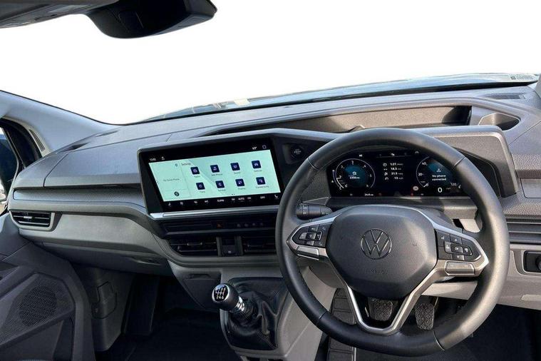 12" digital drivers display, 13" touchscreen infotainment display with wireless app connect and DAB radio, 5G Modem, Adaptive cruise control, Apple CarPlay and Android Auto, Dynamic road sign display, eCall emergency system, Electromechanical speed sensitive power steering, height and longitudinally adjustable steering column, Lane and blind spot assist with exit warning system, Preparation of VW connect and connect plus, Wireless mobile phone charging, Wrong way driver warning, Body colour bumpers, Body coloured door handles, Body coloured door mirrors, Body coloured radiator grille, Electrically heated, adjustable and folding door mirrors, Heat reflecting side window glass, Mud flaps front and rear, Rear Transporter nameplate in black grained decorative trim, Vehicle opening configuration 1x 1st row of seats, 2x all doors, 12V outlet in centre console and 12V outlet on rear right D-pillar, 2x 15-W USB data/charging ports in dashboard and 1x USB-C, 1x USB-A center bottom, 2x LED lights in load compartment, 3x additional super bright LED lights in load compartment, 4 way height and tilt adjustable head restraints, 5 additional USB-C charging ports, Black plastic scuff plate for sliding door in cargo without illumination, Cabin interior lighting, Glasses compartment in driver side roof, Grab handle on A-pillar passenger side, Illuminated lockable glovebox, Lashing rings for reinforced floor covering, Leatherette gear lever, Narrow centre console with cup holder and compartment for mobile phone, Overhead storage compartment, Rubber floor covering in cab, Striped fabric upholstery, Without passenger seats in load compartment, Driver and front passenger airbag with front passenger airbag deactivation, Dual tone horn, Front and curtain airbags for driver and front passenger, Seat belt pretensioner for driver seat, Anti theft alarm system with interior monitoring in cab, backup horn and towing protection, Electronic immobiliser, Lockable wheel bolts, Preparation for alcohol ignition interlock, 5+ Promise, Alternator - 230A, Electromechanical brake booster, Electronic stability control, ABS, ASR with deactivation button, hill start assist and brake assist system,