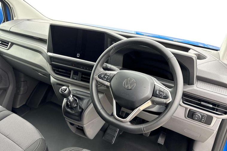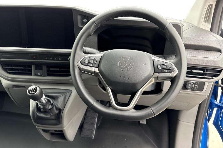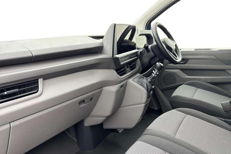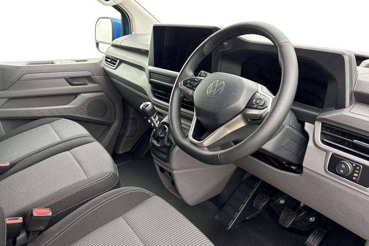 12" digital drivers display, 13" touchscreen infotainment display with wireless app connect and DAB radio, 5G Modem, Adaptive cruise control, Apple CarPlay and Android Auto, Dynamic road sign display, eCall emergency system, Electromechanical speed sensitive power steering, height and longitudinally adjustable steering column, Lane and blind spot assist with exit warning system, Preparation of VW connect and connect plus, Wireless mobile phone charging, Wrong way driver warning, Body colour bumpers, Body coloured door handles, Body coloured door mirrors, Body coloured radiator grille, Electrically heated, adjustable and folding door mirrors, Heat reflecting side window glass, Mud flaps front and rear, Rear Transporter nameplate in black grained decorative trim, Vehicle opening configuration 1x 1st row of seats, 2x all doors, 12V outlet in centre console and 12V outlet on rear right D-pillar, 2x 15-W USB data/charging ports in dashboard and 1x USB-C, 1x USB-A center bottom, 2x LED lights in load compartment, 3x additional super bright LED lights in load compartment, 4 way height and tilt adjustable head restraints, 5 additional USB-C charging ports, Black plastic scuff plate for sliding door in cargo without illumination, Cabin interior lighting, Glasses compartment in driver side roof, Grab handle on A-pillar passenger side, Illuminated lockable glovebox, Lashing rings for reinforced floor covering, Leatherette gear lever, Narrow centre console with cup holder and compartment for mobile phone, Overhead storage compartment, Rubber floor covering in cab, Striped fabric upholstery, Without passenger seats in load compartment, Driver and front passenger airbag with front passenger airbag deactivation, Dual tone horn, Front and curtain airbags for driver and front passenger, Seat belt pretensioner for driver seat, Anti theft alarm system with interior monitoring in cab, backup horn and towing protection, Electronic immobiliser, Lockable wheel bolts, Preparation for alcohol ignition interlock, 5+ Promise, Alternator - 230A, Electromechanical brake booster, Electronic stability control, ABS, ASR with deactivation button, hill start assist and brake assist system,