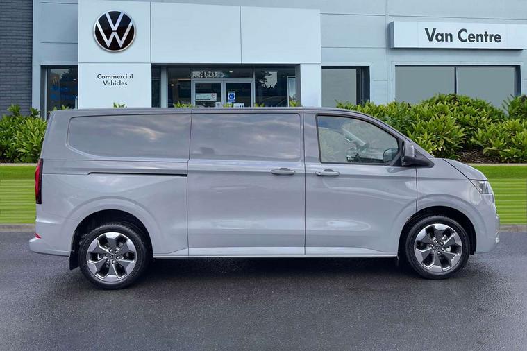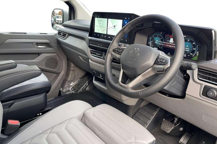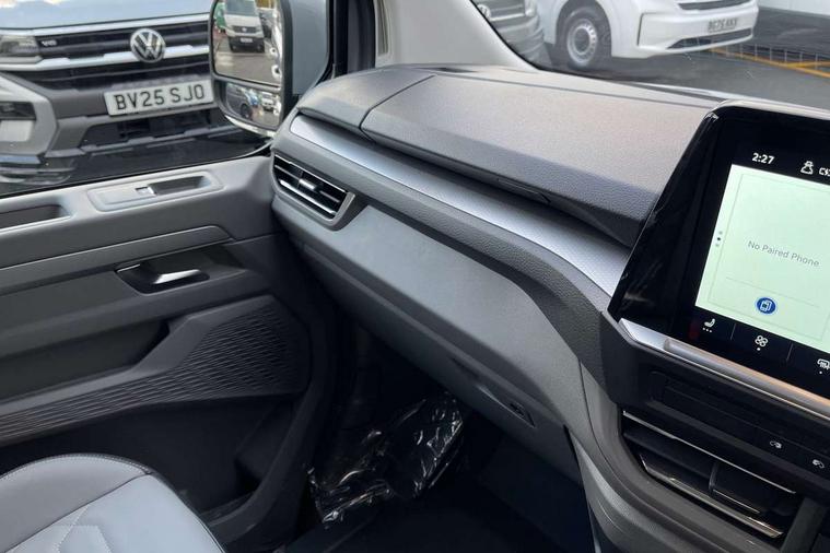 12" digital drivers display, 13" touchscreen infotainment display with wireless app connect and DAB radio, 5G Modem, Adaptive cruise control, Apple CarPlay and Android Auto, Dynamic road sign display, eCall emergency system, Electromechanical speed sensitive power steering, height and longitudinally adjustable steering column, Lane and blind spot assist with exit warning system, Preparation of VW connect and connect plus, Traffic jam assist, Wireless mobile phone charging, Wrong way driver warning, Body colour bumpers, Body coloured door handles, Body coloured door mirrors, Body coloured radiator grille, Electrically heated, adjustable and folding door mirrors, Heat reflecting side window glass, Mud flaps front and rear, Rear Transporter nameplate in black grained decorative trim, Vehicle opening configuration 1x 1st row of seats, 2x all doors, 12V outlet in centre console and 12V outlet on rear right D-pillar, 2x 15-W USB data/charging ports in dashboard and 1x USB-C, 1x USB-A center bottom, 2x LED lights in load compartment, 3x additional super bright LED lights in load compartment, 4 way height and tilt adjustable head restraints, 5 additional USB-C charging ports, Black plastic scuff plate for sliding door in cargo without illumination, Cabin interior lighting, Gear selector lever on steering wheel, Glasses compartment in driver side roof, Grab handle on A-pillar passenger side, Illuminated lockable glovebox, Lashing rings for reinforced floor covering, Narrow centre console with cup holder and compartment for mobile phone, Overhead storage compartment, Rubber floor covering in cab, Striped fabric upholstery, Without passenger seats in load compartment, Driver and front passenger airbag with front passenger airbag deactivation, Dual tone horn, Front and curtain airbags for driver and front passenger, Seat belt pretensioner for driver seat, Anti theft alarm system with interior monitoring in cab, backup horn and towing protection, Electronic immobiliser, Lockable wheel bolts, Preparation for alcohol ignition interlock, 5+ Promise, Alternator - 230A, Electromechanical brake booster, Electronic stability control, ABS, ASR with deactivation button, hill start assist and brake assist system,
