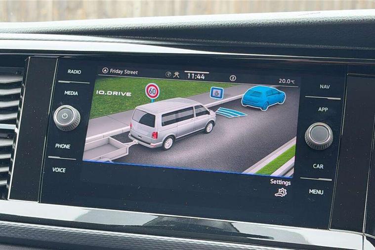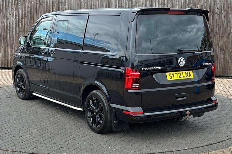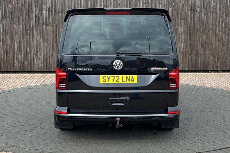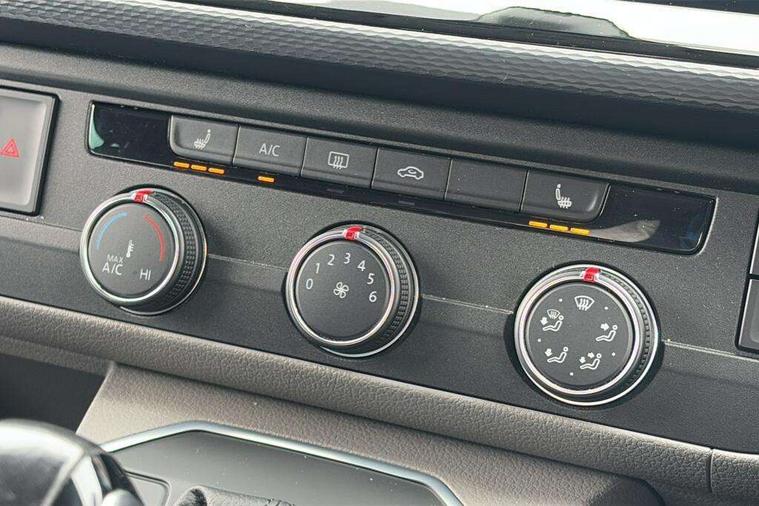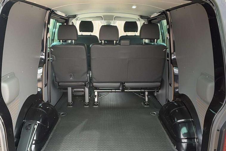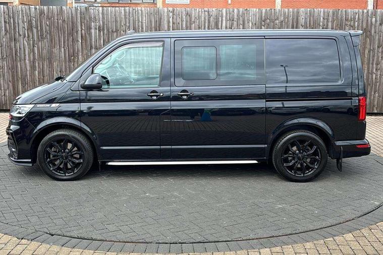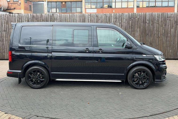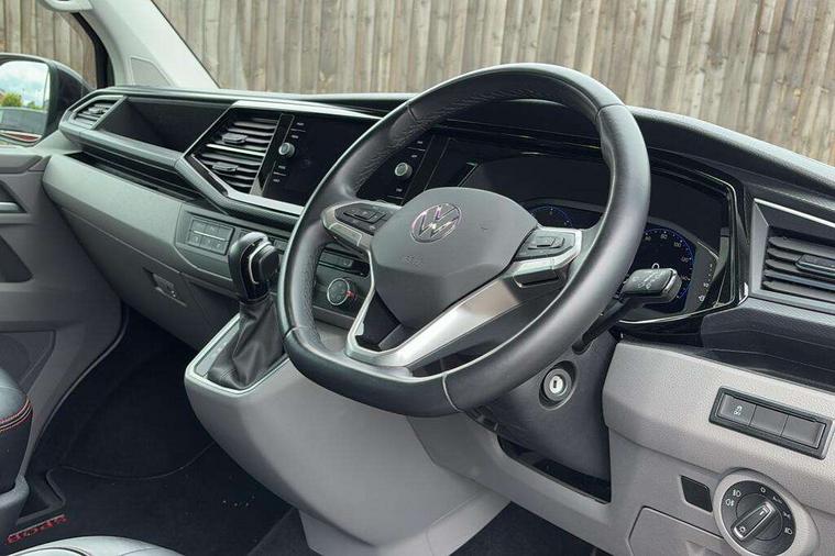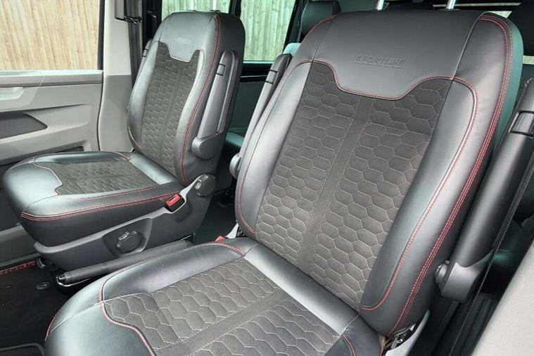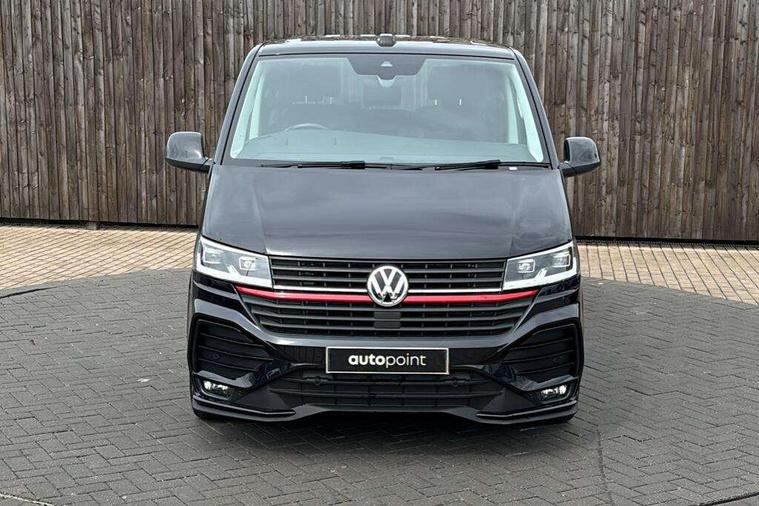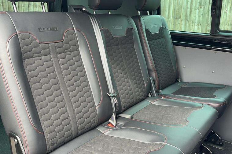 Adaptive cruise control, Cross wind assist, Digital cockpit, Dimmable dashboard ilumination, Driver alert system, eCall emergency system, Electromechanical steering, Front and rear parking sensors, Front assist including city emergency braking system, Multi function display plus with black and white display, Rear view camera, Tyre pressure loss indicator, 2 USB interfaces type C in dashboard, 4 speakers with 2 tweeters and 2 woofers, Digital radio reception (DAB+), Discover Media navigation system with 8.0" touch-screen including Streaming and Internet, Volkswagen app connect, Auto dimming interior rear view mirror, Automatic headlight control, leaving home and manual coming home feature, Body colour bumpers, Body coloured door handles, Enhanced front bumper including lower front diffuser, Front electric windows, Front fog lamps with cornering light, Front sliding window and rear closed left side panel in load/passenger compartment, Front sliding window and rear closed right side panel in load/passenger compartment, Gloss black wing mirrors, Heat insulating windows in cab, Heated laminated windshield, High beam assist, Illuminated chrome side bars, Illuminated steps in passenger/load compartment, LED headlights with LED daytime running lights and LED tail lights, Power folding door mirrors, Privacy glass from the B-pillar and heat-insulating glass in front, Rear tailgate spoiler, Rear window in tailgate with wiper and washer system, Sportline front wing and rear tailgate badging, Tailgate closing with unlatching from the inside, Windshield wiper with intermittent control with rain sensor, 12V socket, 2 bench seats on driver side and individual seat with easy entry on the passenger side in 2nd row seats, Armrests for both front seats, Carpet floor covering in cab, Comfort dashboard, Dash panel with open stowage compartments, drink holders and lockable glovebox, Dust/pollen filter, Entry handle on A-pillar on drivers and front passengers side, Folding grab handles on roof frame, Full height side trim panels in the load compartment, Gloss black inserts in dashboard, Glove compartment with illumination, Heated driver and front passenger seats, Heavy duty tool kit and jack, Interior lighting with LED technology in load compartment, Interior styling and badging, ISOFIX and top tether child seat anchors for the outer seats of the three-seater bench seat, Leather trimmed multi-function steering wheel with height and longitudinal adjustment, LED Interior lighting with two reading lights in the roof console, Manual height adjustable and lumbar support for driver and single passenger seats, Nappa leather/alcantara upholstery with red contrast stitching, One waste bin in door storage compartment, Reinforced Folding lashing rings for load restraint system, Single front passenger seat, Sportline carpet mats, Sun visors with mirror and airbag label on front passenger sun visor, Driver and front passenger airbag with front passenger airbag deactivation, Single tone horn, 2 remote control folding keys, Anti theft alarm system with interior monitoring in cab, backup horn and towing protection, Engine immobiliser, Lockable wheel bolts, Additional 12V socket, Automatic post collision braking system, Diesel particulate filter, Eibach 30mm lowering springs, Electronic stability control, ABS, ASR with deactivation button, electronic differnetial lock, hill start assist and brake assist system, Start/stop system with regenerative breaking, Dashboard upper in Titanium Black, dashboard lower in Palladium and floor covering in Titanium Black, 18" Sportline Gloss black alloy wheels, Tyre mobility kit in lieu of spare wheel with 12 volt compressor and tyre sealant,