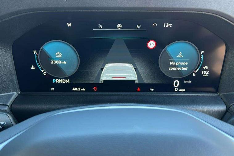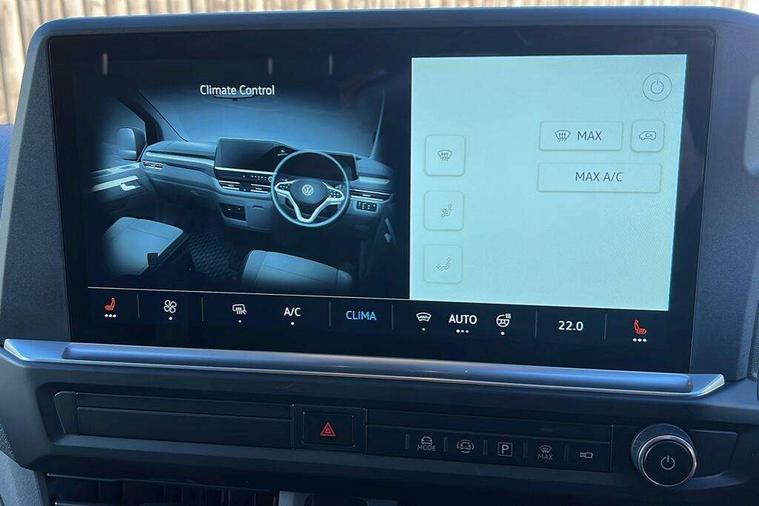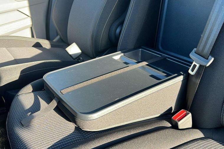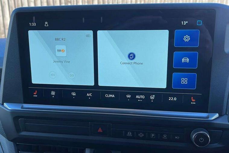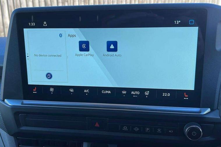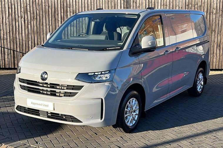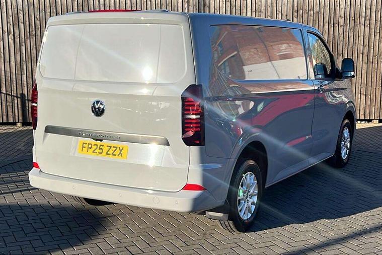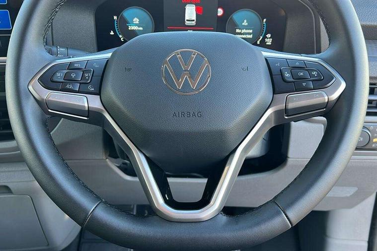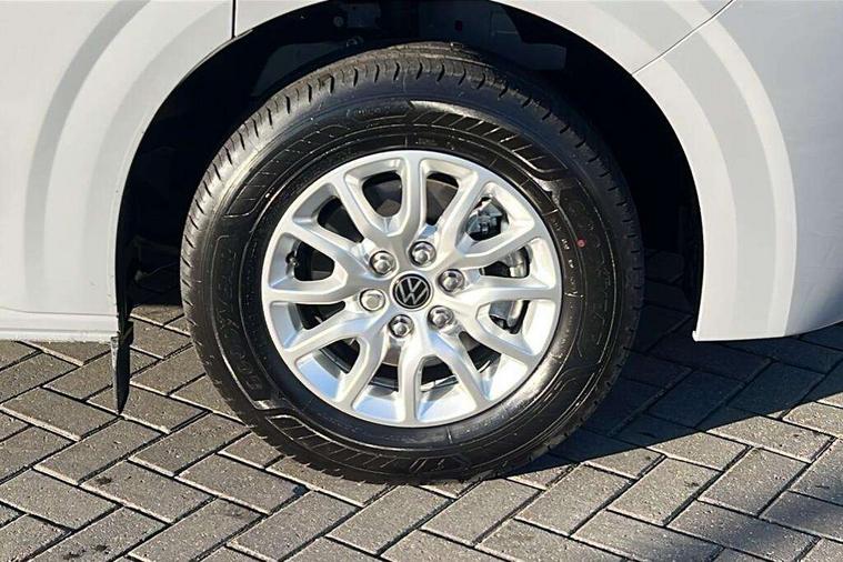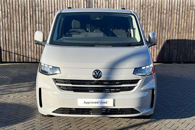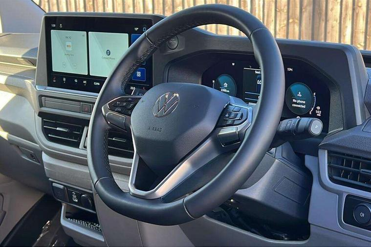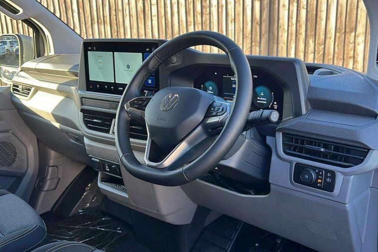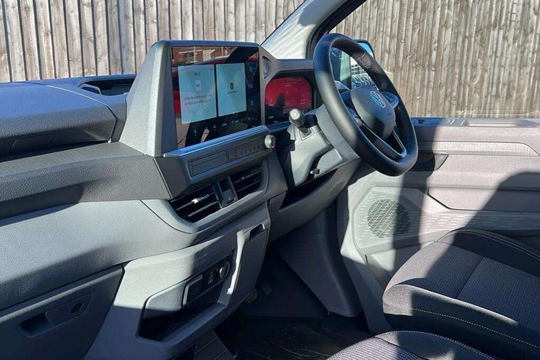 12" digital drivers display, 13" touchscreen infotainment display with wireless app connect and DAB radio, 5G Modem, Adaptive cruise control, Apple CarPlay and Android Auto, Dynamic road sign display, eCall emergency system, Electromechanical speed sensitive power steering, height and longitudinally adjustable steering column, Lane and blind spot assist with exit warning system, Preparation of VW connect and connect plus, Traffic jam assist, Wireless mobile phone charging, Wrong way driver warning, Body colour bumpers, Body coloured door handles, Body coloured door mirrors, Body coloured radiator grille, Electrically heated, adjustable and folding door mirrors, Heat reflecting side window glass, Mud flaps front and rear, Rear Transporter nameplate in black grained decorative trim, Vehicle opening configuration 1x 1st row of seats, 2x all doors, 12V outlet in centre console and 12V outlet on rear right D-pillar, 2x 15-W USB data/charging ports in dashboard and 1x USB-C, 1x USB-A center bottom, 2x LED lights in load compartment, 3x additional super bright LED lights in load compartment, 4 way height and tilt adjustable head restraints, 5 additional USB-C charging ports, Black plastic scuff plate for sliding door in cargo without illumination, Cabin interior lighting, Gear selector lever on steering wheel, Glasses compartment in driver side roof, Grab handle on A-pillar passenger side, Illuminated lockable glovebox, Lashing rings for reinforced floor covering, Narrow centre console with cup holder and compartment for mobile phone, Overhead storage compartment, Rubber floor covering in cab, Striped fabric upholstery, Without passenger seats in load compartment, Driver and front passenger airbag with front passenger airbag deactivation, Dual tone horn, Front and curtain airbags for driver and front passenger, Seat belt pretensioner for driver seat, Anti theft alarm system with interior monitoring in cab, backup horn and towing protection, Electronic immobiliser, Lockable wheel bolts, Preparation for alcohol ignition interlock, 5+ Promise, Alternator - 230A, Electromechanical brake booster, Electronic stability control, ABS, ASR with deactivation button, hill start assist and brake assist system,