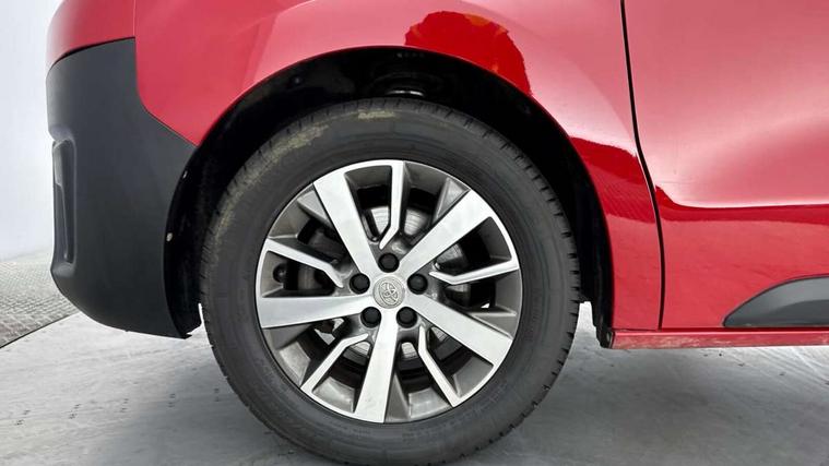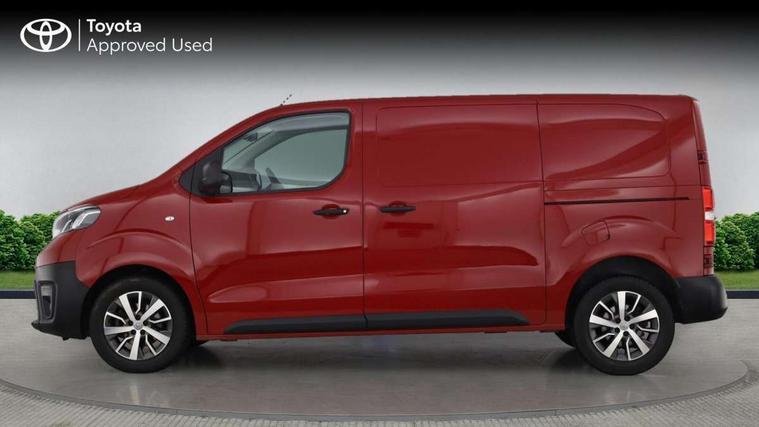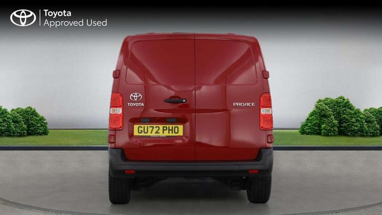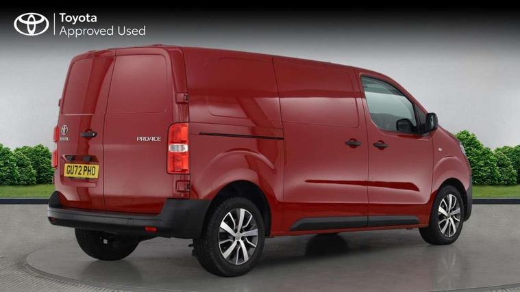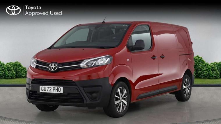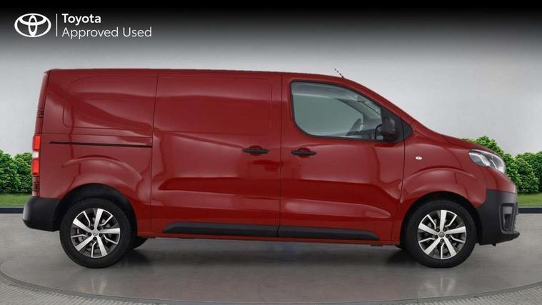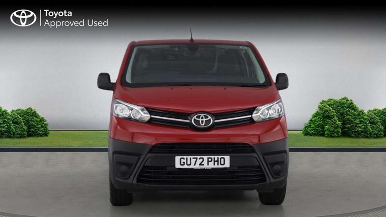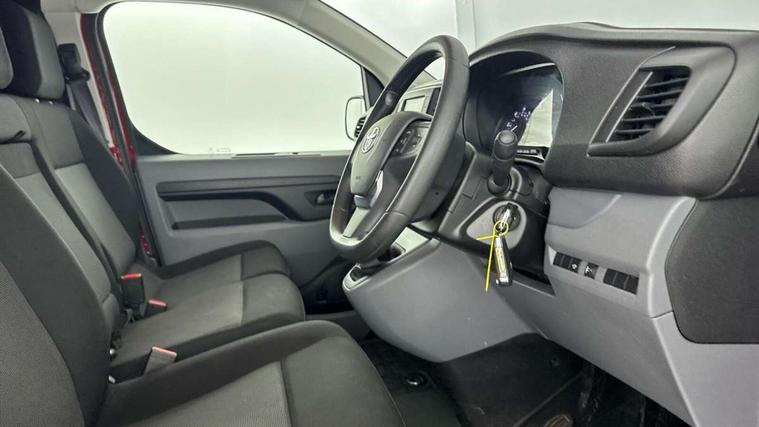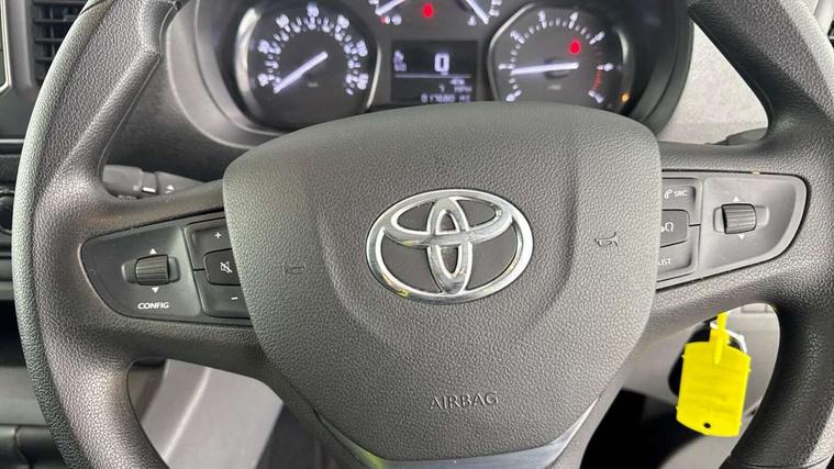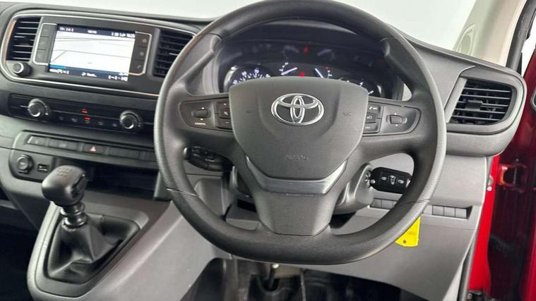 Bluetooth handsfree connectivity, Cruise control, PAS, Tyre pressure warning system (TPWS), 4 speakers, Digital radio (DAB), Radio/CD player, USB connector, 180 degree opening rear doors, Acoustic windscreen, Auto Headlights, Auto wipers, Black bumpers, Black door handles, Black protection moulding on side door, Body Coloured roof, Daytime running lights, Front power windows, Headlight cut-off reminder, Heated door mirrors, LED High mounted stop light, Manually adjustable day/night rear view mirror, Multi reflector halogen headlights, Panel rear wing doors, Power adjustable door mirrors, Rear combination lights, Short Antenna, Smoke tinted (30%) privacy glass on rear passenger window, Two manual sliding side doors, 2 seat front passenger bench, Driver seat armrest, Fabric seats, Front cup holders, Front room lights, Glovebox light, LED Driver and front passenger personal lights, Lighted and chilled upper glove box, Manually reclining and sliding driver and front passenger seats, Open upper dashboard storage compartment, Panel bulkhead with window and protective grille, Storage under passenger bench, Air conditioning and Smart cargo pack - Proace, Parking pack - Proace, Double front passenger airbag, Front passenger airbag on/off switch, Supplement restraint system (SRS) 2 airbags, Alarm, Deadlocks + 2 remote keys, Power door locks, 12V power front outlet, 12v socket in dashboard and rear, Adjustable speed limiter (ASL), Anti lock braking system (ABS), Brake Assist (BA), Stop/start function, Toyota traction select, Vehicle stability control (VSC) and hill start assist control (HAC), 16" 5 triple spoke steel wheels with wheel caps, Full size spare wheel, Full wheel covers,