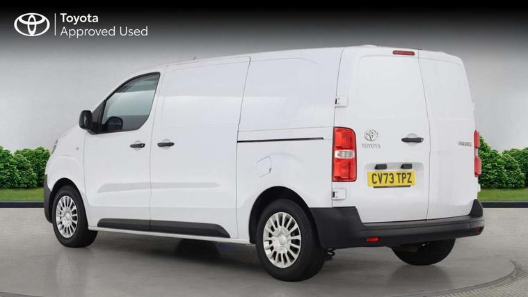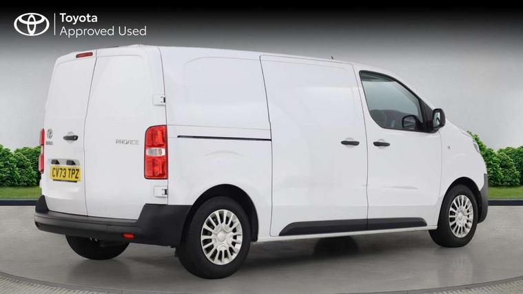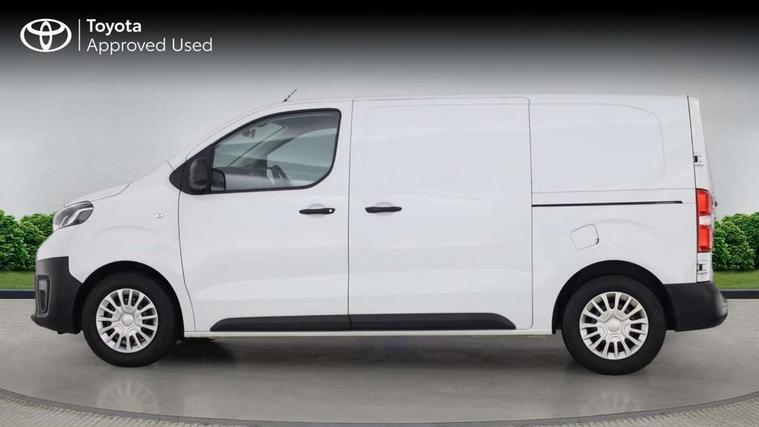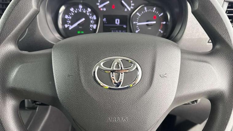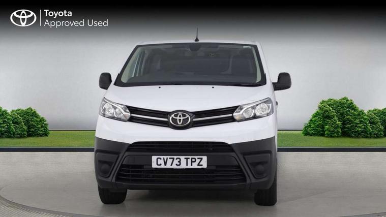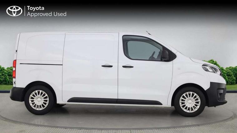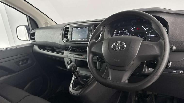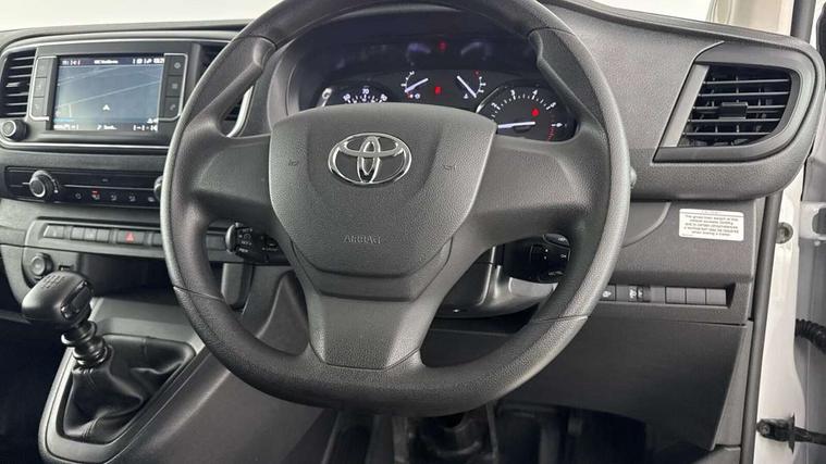 Bluetooth handsfree connectivity, Cruise control, PAS, Tyre pressure warning system (TPWS), 4 speakers, Digital radio (DAB), Radio/CD player, USB connector, 180 degree opening rear doors, Acoustic windscreen, Auto Headlights, Auto wipers, Black bumpers, Black door handles, Black protection moulding on side door, Body Coloured roof, Daytime running lights, Front power windows, Headlight cut-off reminder, Heated door mirrors, LED High mounted stop light, Manually adjustable day/night rear view mirror, Multi reflector halogen headlights, Panel rear wing doors, Power adjustable door mirrors, Rear combination lights, Short Antenna, Smoke tinted (30%) privacy glass on rear passenger window, Two manual sliding side doors, 2 seat front passenger bench, Driver seat armrest, Fabric seats, Front cup holders, Front room lights, Glovebox light, LED Driver and front passenger personal lights, Lighted and chilled upper glove box, Manually reclining and sliding driver and front passenger seats, Open upper dashboard storage compartment, Panel bulkhead with window and protective grille, Storage under passenger bench, Air conditioning and Smart cargo pack - Proace, Parking pack - Proace, Double front passenger airbag, Front passenger airbag on/off switch, Supplement restraint system (SRS) 2 airbags, Alarm, Deadlocks + 2 remote keys, Power door locks, 12V power front outlet, 12v socket in dashboard and rear, Adjustable speed limiter (ASL), Anti lock braking system (ABS), Brake Assist (BA), Stop/start function, Toyota traction select, Vehicle stability control (VSC) and hill start assist control (HAC), Full size spare wheel, Full wheel covers,