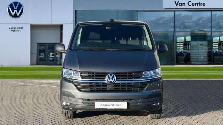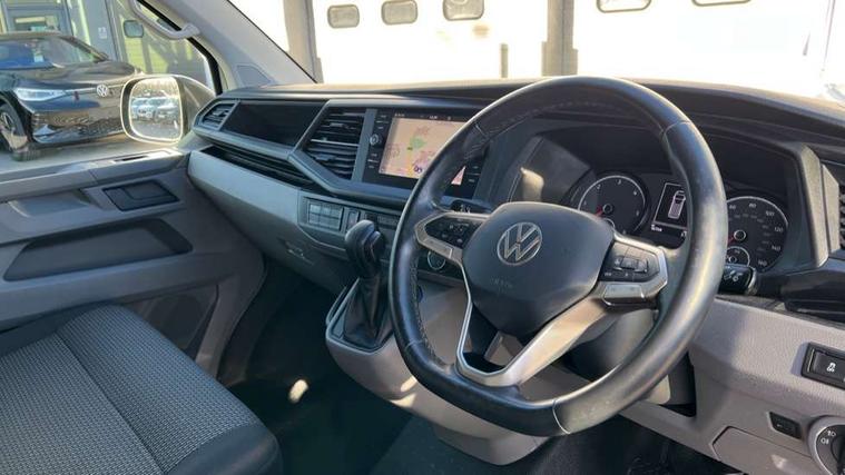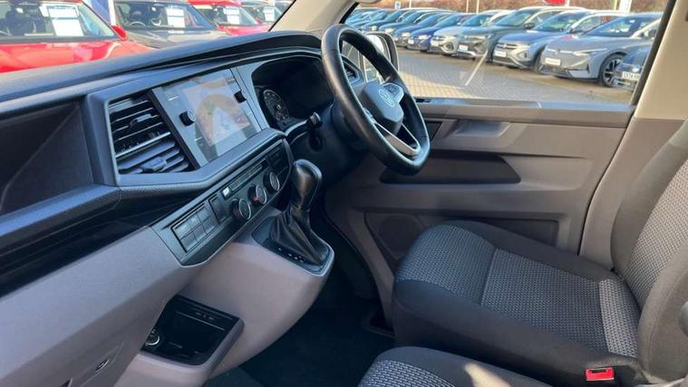 Adaptive cruise control, Cross wind assist, Dimmable illuminated instruments, Driver alert with Multi-function display plus, eCall emergency system, Forward collision warning front assist with autonomous emergency braking, Mobile phone interface, Multi function display plus with black and white display, 2 USB interfaces type C in dashboard, 4 speakers with 2 tweeters and 2 woofers, Composition colour radio with 6.5" touchscreen, Digital radio reception (DAB+), Volkswagen app connect, Automatic headlight control, leaving home and manual coming home feature, Closing rear wing door with unlatching from the inside, Front fog lamps with cornering light, Heat insulating glass (green) in cab and passenger/load compartment, Heated front windscreen, Left convex exterior mirror, Power folding adjustable door mirrors with separately heated, Radiator grille with 2 chrome trims, Rear wing doors without window apertures, Right convex exterior mirror, Transporter nameplate on the rear fender, Windshield wiper intermittent control with rain sensor for windshield wipers, 3 spoke leather wrapped multi function steering wheel, Auto dimming breakaway interior rear view mirror, Comfort headliner in cab, hardboard roof trim in passenger and load compartment, Dust/pollen filter, Front and rear left without window closed side panel in load compartment, Front seats on the right in 1st row of seat, Glove compartment with illumination, Heavy duty tool kit and jack, High partition, Interior plastic loading edge protection, LED Interior lighting in load and passenger compartment, Manual adjustable lumbar support for right single seat in 1st row seats, Refrigerant R134a, Standard lower part dashboard in palladium, Storage compartments on cab seats and reading light, Without right side window apertures in passenger and load compartment, Comfort pack - Transporter, Exterior pack without fog light- Transporter, Non smoker pack - Transporter, 3 point height adjustable seat belts on outer seats cab with electric pretensioners, Driver and front passenger airbag with front passenger airbag deactivation, Warning buzzer and light for driver and front passenger seat belt not fastened, Without child safety lock in passenger compartment, Anti theft alarm system with interior monitoring in cab, backup horn and towing protection, Lockable wheel bolts, 16" chassis with 16" brake system, Diesel particulate filter, Electronic stability control, ABS, ASR with deactivation button, hill start assist and brake assist system, Start/stop system with regenerative breaking, 17" Devonport alloy wheels,