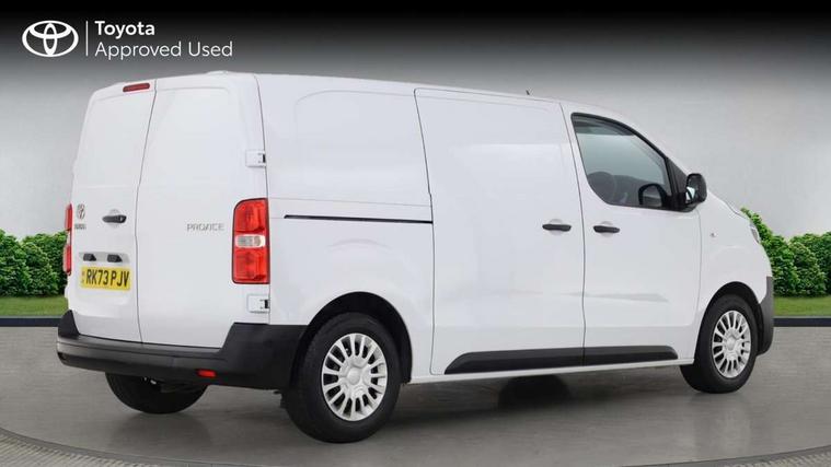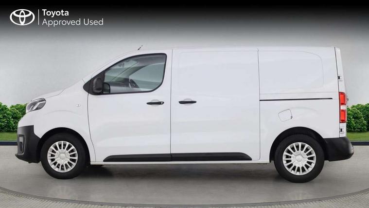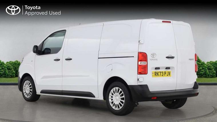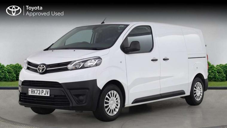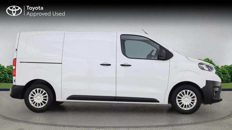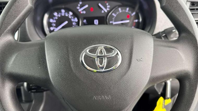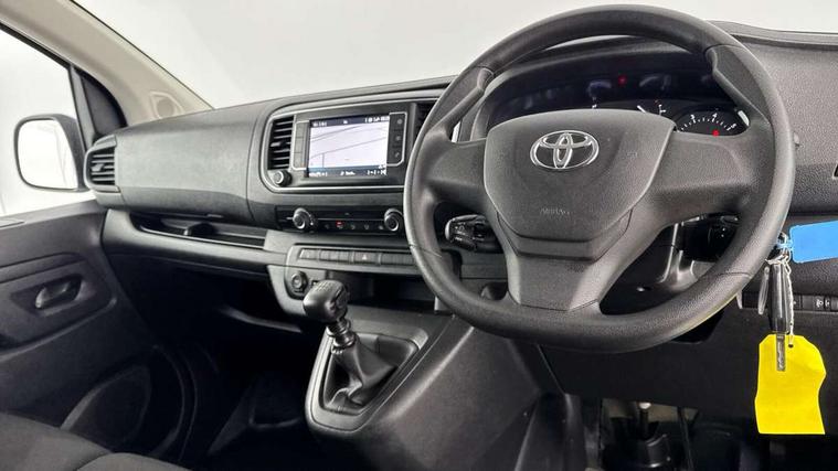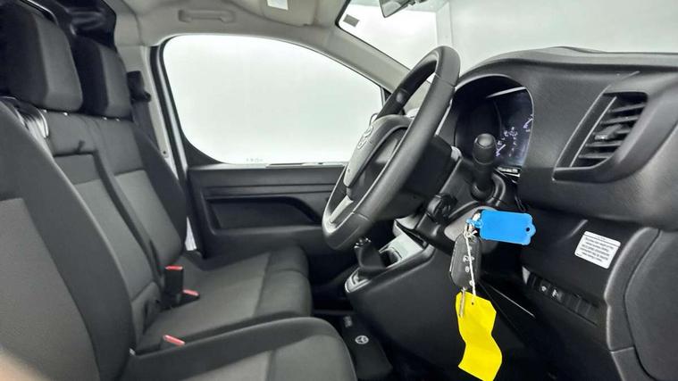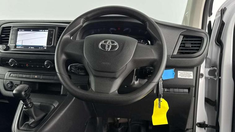 Bluetooth handsfree connectivity, Cruise control, PAS, Tyre pressure warning system (TPWS), 4 speakers, Digital radio (DAB), Radio/CD player, USB connector, 180 degree opening rear doors, Acoustic windscreen, Auto Headlights, Auto wipers, Black bumpers, Black door handles, Black protection moulding on side door, Body Coloured roof, Daytime running lights, Front power windows, Headlight cut-off reminder, Heated door mirrors, LED High mounted stop light, Manually adjustable day/night rear view mirror, Multi reflector halogen headlights, Panel rear wing doors, Power adjustable door mirrors, Rear combination lights, Short Antenna, Smoke tinted (30%) privacy glass on rear passenger window, Two manual sliding side doors, 2 seat front passenger bench, Driver seat armrest, Fabric seats, Front cup holders, Front room lights, Glovebox light, LED Driver and front passenger personal lights, Lighted and chilled upper glove box, Manually reclining and sliding driver and front passenger seats, Open upper dashboard storage compartment, Panel bulkhead with window and protective grille, Storage under passenger bench, Air conditioning and Smart cargo pack - Proace, Parking pack - Proace, Double front passenger airbag, Front passenger airbag on/off switch, Supplement restraint system (SRS) 2 airbags, Alarm, Deadlocks + 2 remote keys, Power door locks, 12V power front outlet, 12v socket in dashboard and rear, Adjustable speed limiter (ASL), Anti lock braking system (ABS), Brake Assist (BA), Stop/start function, Toyota traction select, Vehicle stability control (VSC) and hill start assist control (HAC), Full size spare wheel, Full wheel covers,