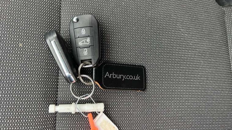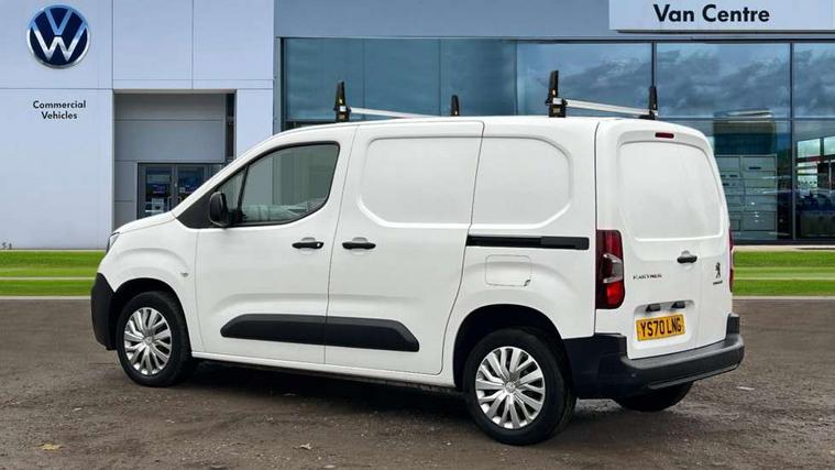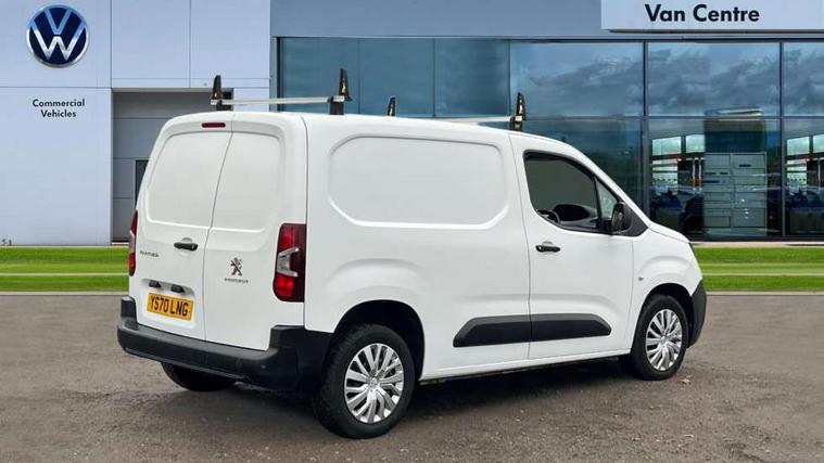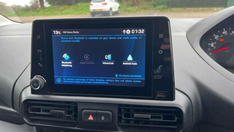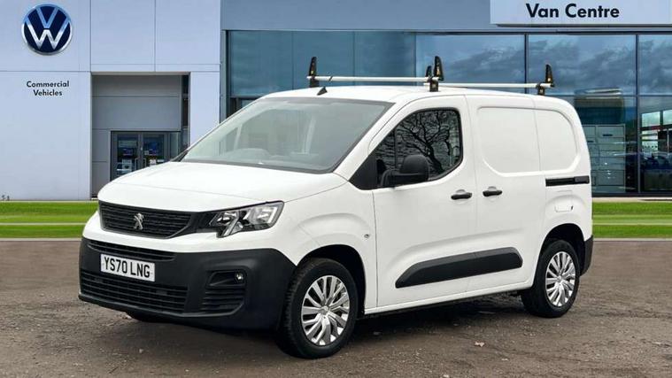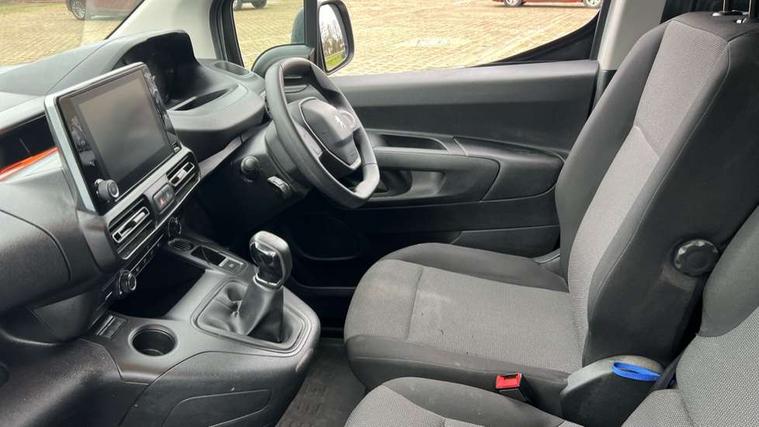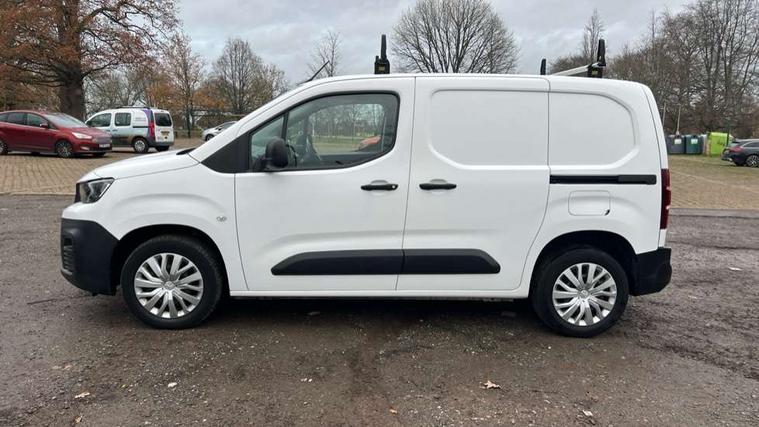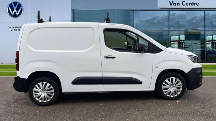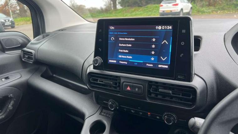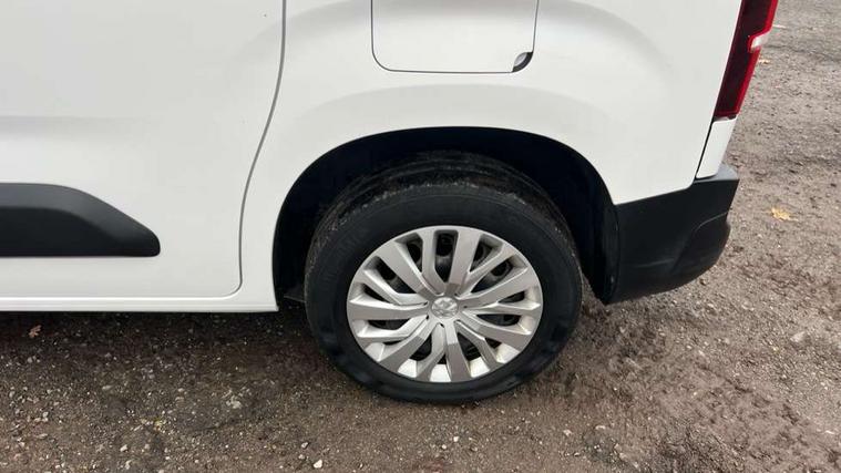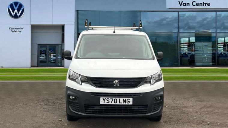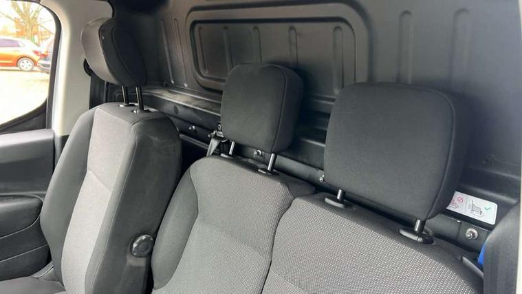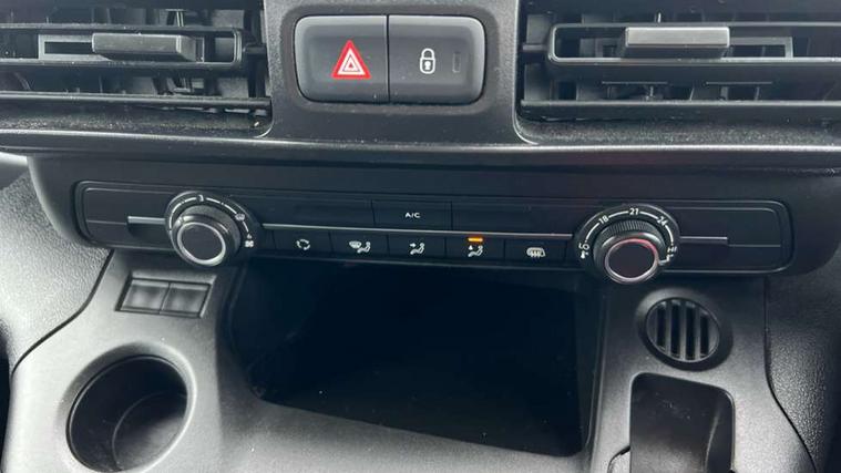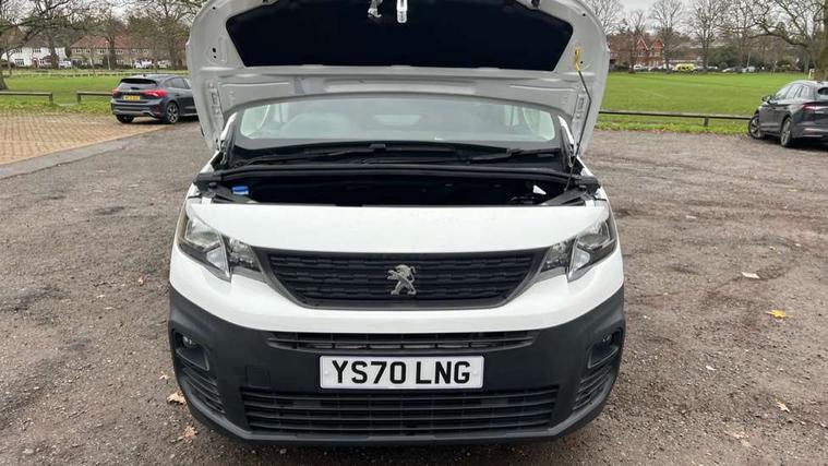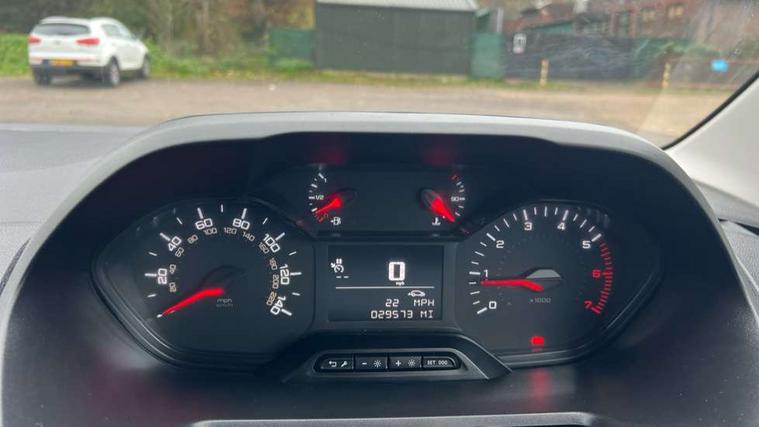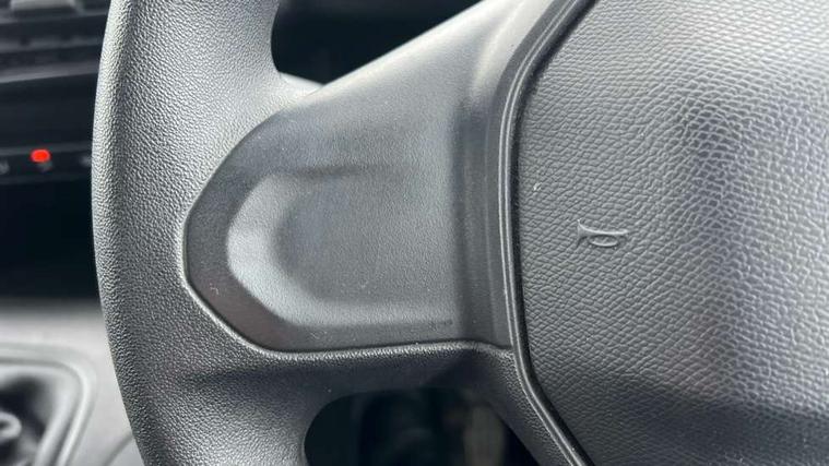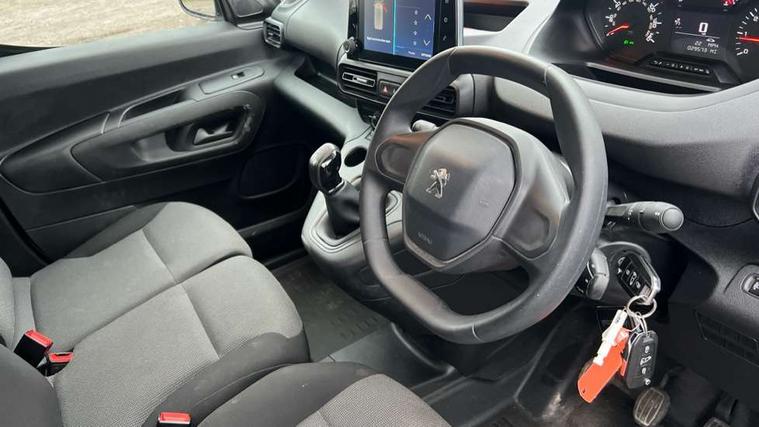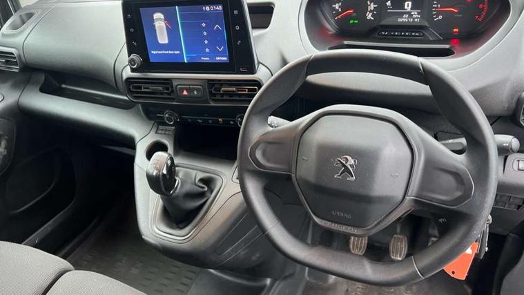 Electric power assisted steering with height and reach adjustable steering wheel, Lockable fuel cap, Multi-function on-board trip computer, Peugeot connect with SOS assistance, Peugeot i-Cockpit with head up display and compact steering wheel, Rev counter with maintenance and gear efficiency indicators (GEI), Tyre pressure monitor, Apple Carplay/Android Auto, Electric front windows with one touch operation, Electrically adjustable door mirrors, Electrically folding door mirrors with temperature sensor, Front fog lights, Heated door mirrors, Height adjustable halogen headlights with automatic illumination and integrated daytime running lights (DRLs), High level third brake light, Two speed intermittent front wipers, Visible VIN at windscreen base, 12 volt socket in dashboard, 6 floor mounted load securing rings, 6 way adjustable driver seat with lumbar support and under seat storage, Cup holders for driver and passenger on either side of the dashboard, Curitiba cloth upholstery, Drivers seat adjustable for reach and rake, Front door pockets with 1.5L bottle holder, Hard plastic floor protection in cabin, Multiflex modular folding passenger bench seat with pivoting writing table, storage under central seat, load through hatch and load protection cover, Overhead storage shelf in cabin, Upper glove box storage compartment, Automatic activation of hazard warning lights on major deceleration, Door opening warning and audible lights on warning, Driver seatbelt unfastened warning, Driver's airbag, Dashboard mounted central locking push button and auto locking above 7mph, Perimetric and volumetric thatcham category 1 approved alarm with tilt sensor, Remote central locking with deadlocking, selective cab and load area locking via 3 button plip remote control key, Thatcham approved rolling code transponder immobiliser, Automatic electronic parking brake, Electronic Stability Control and ABS with hill start assist, EBA and EBFD, Full size steel spare wheel,